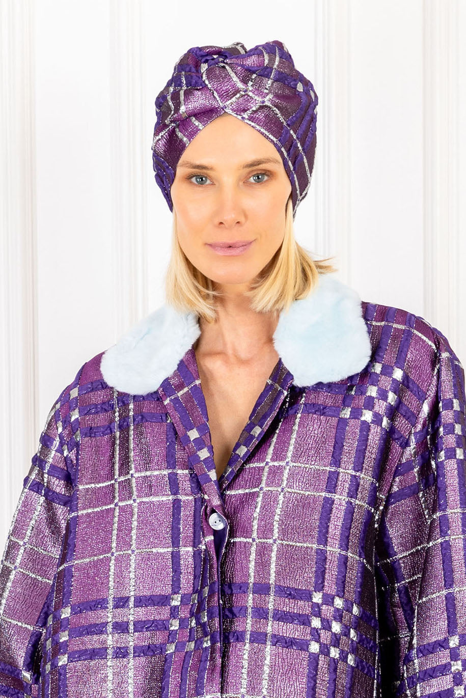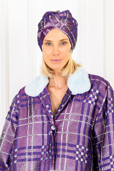 this vintage-inspired turban features a metallic indigo plaid design on a structured brocade fabrication knotted at the front.