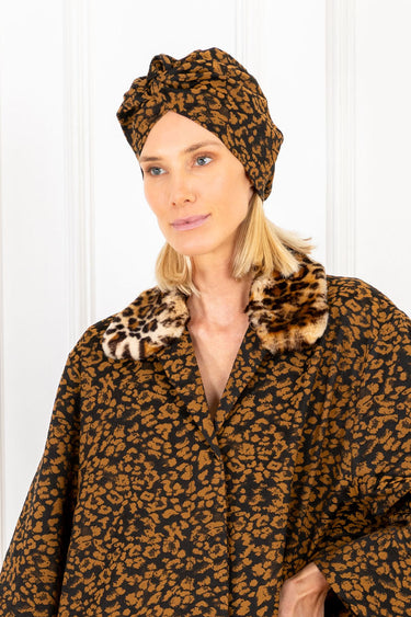 this vintage-inspired turban features a stylized leopard print on a jacquard fabrication knotted at the front.