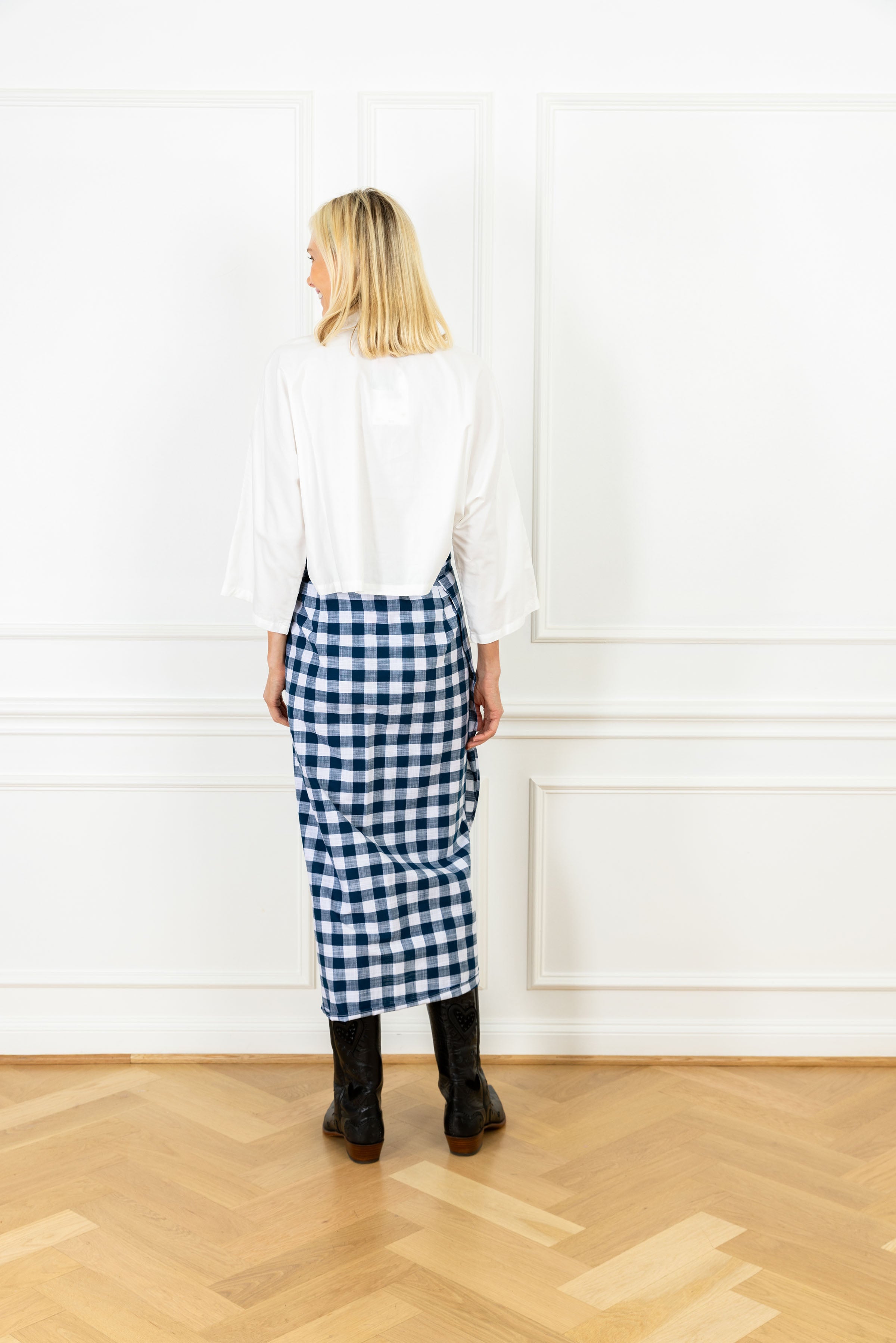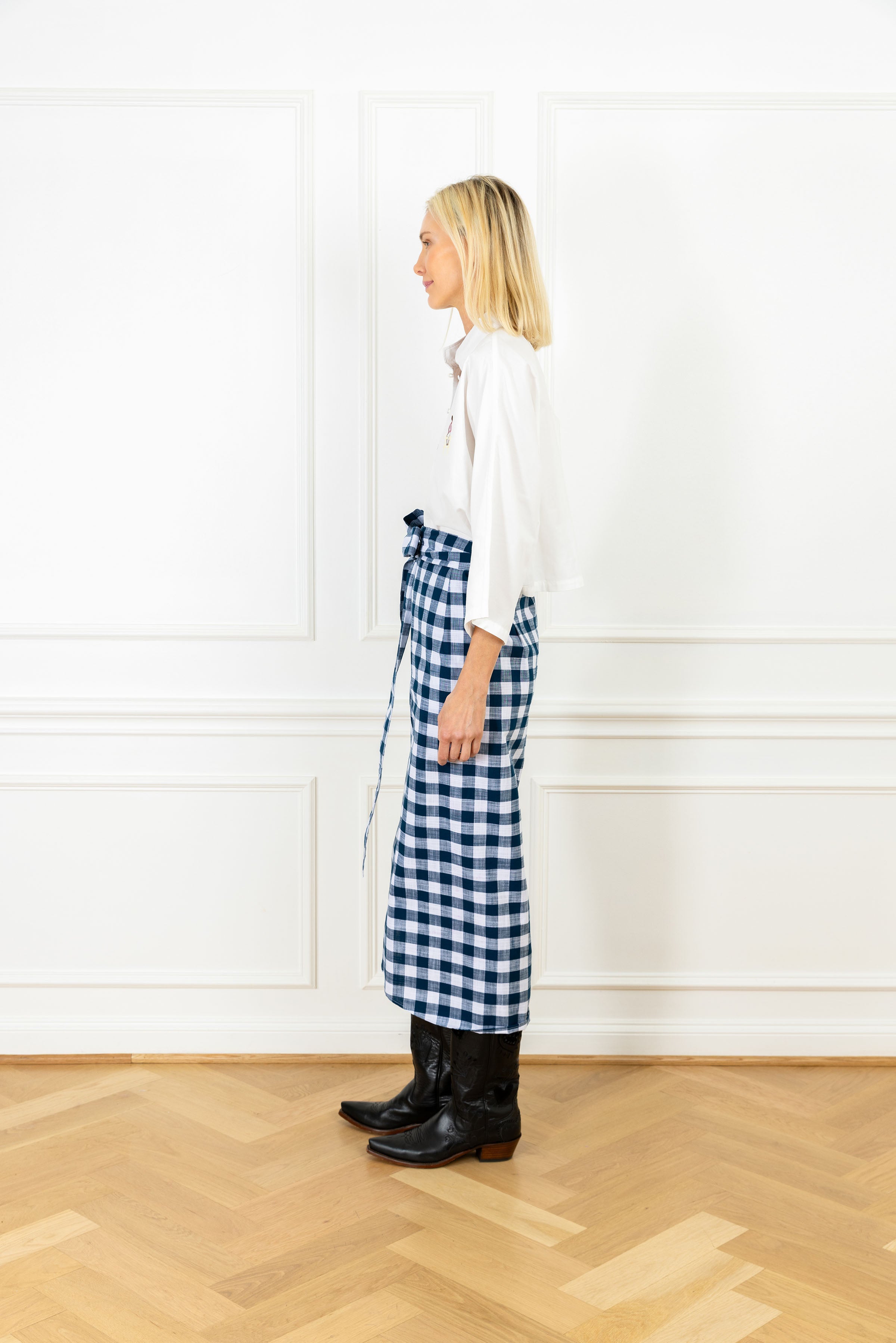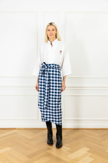 tie on this classic silhouette for an instantly elevated look. this skirt features a large-scale navy and white gingham check design in a soft cotton fabrication.