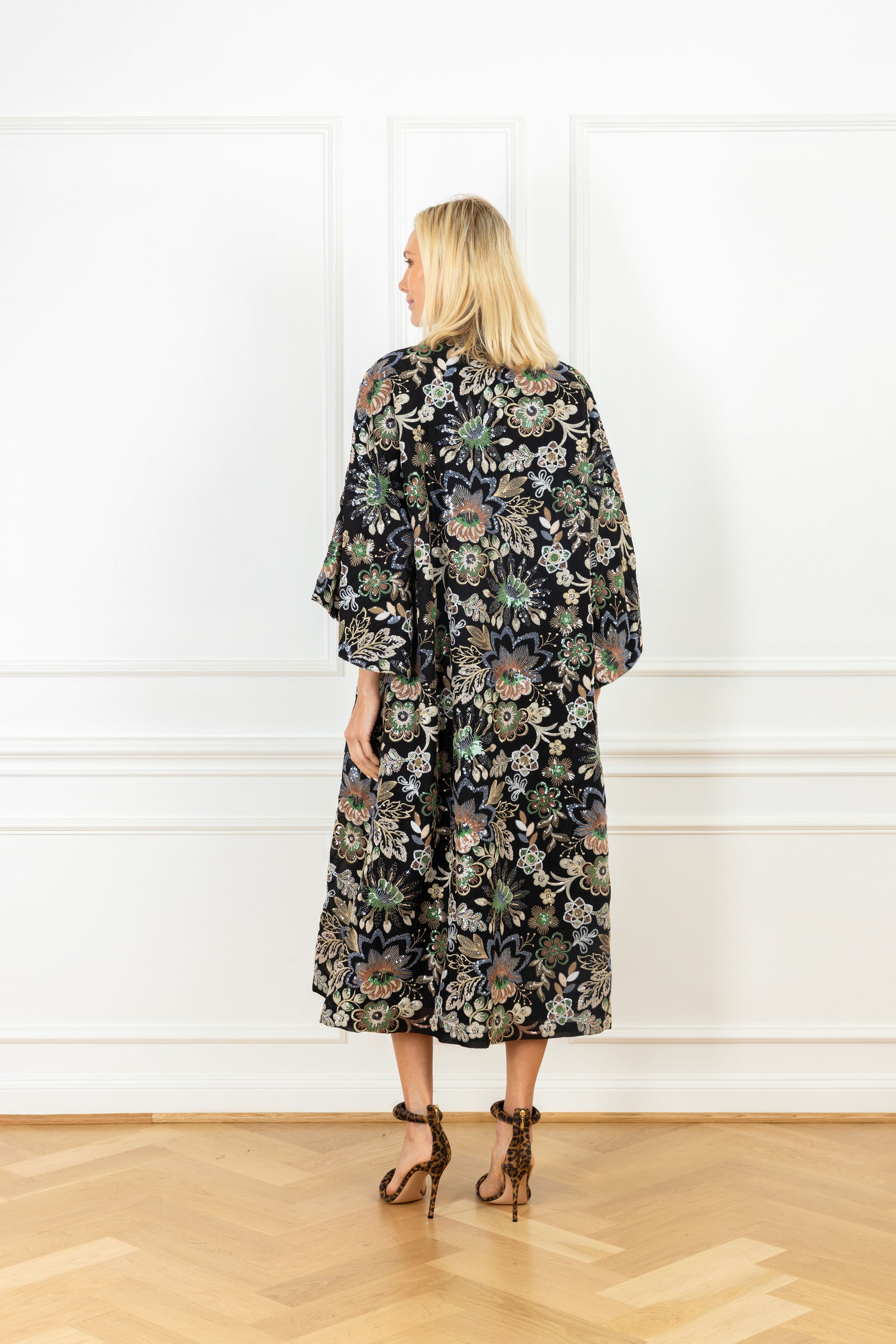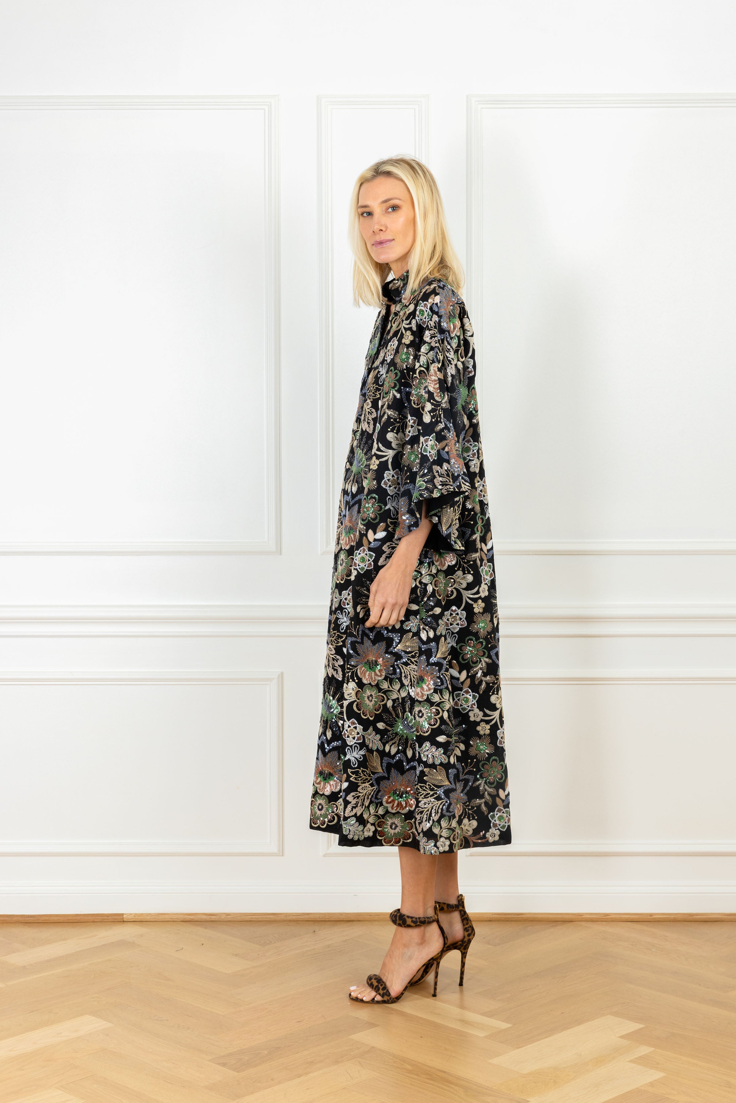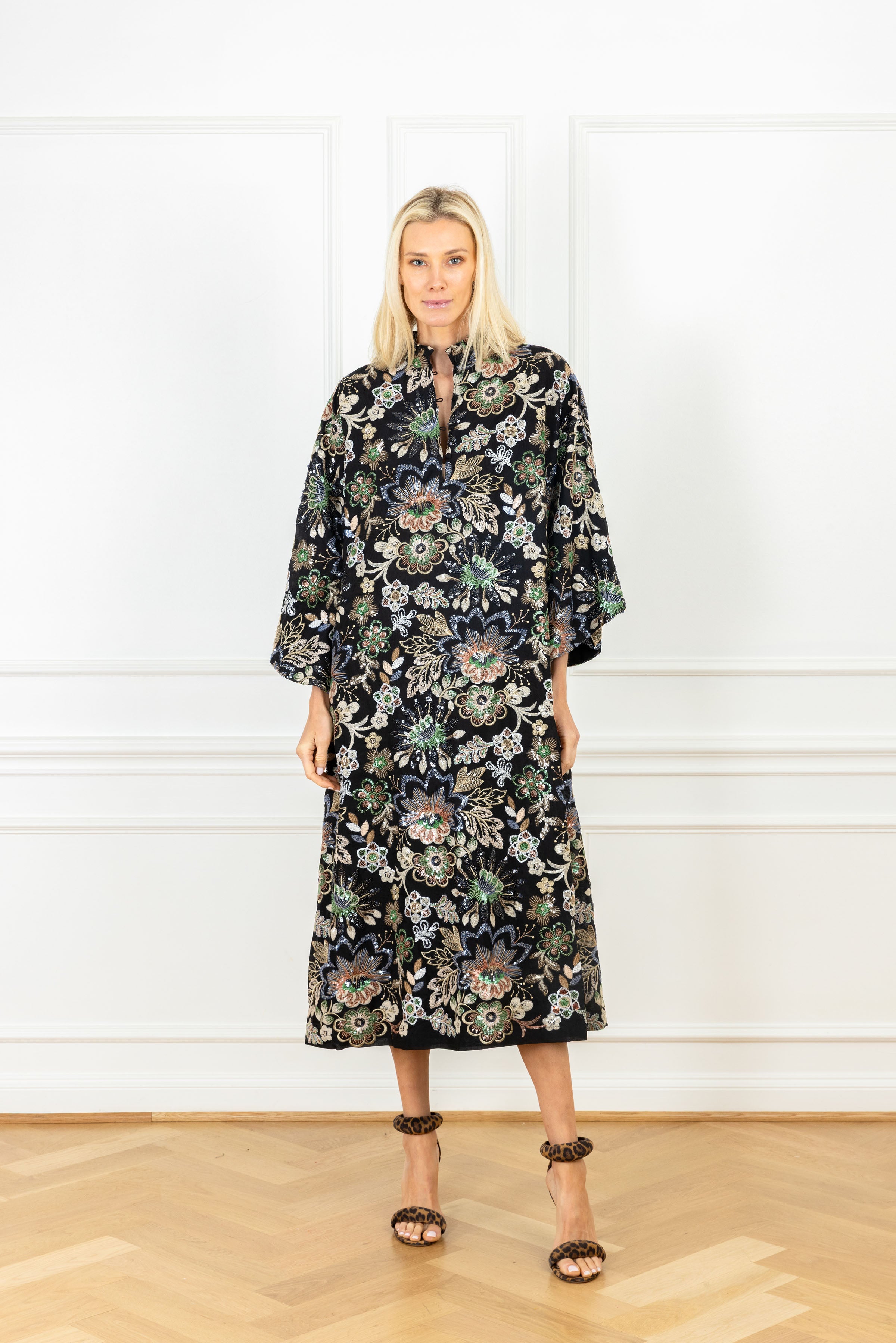 slip on our signature caftan silhouette for an effortless look that feels refined. this caftan features an ornate floral embroidery design in earthy tones.