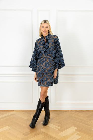 slip on our signature caftan silhouette for an effortless look that feels refined. this caftan features a black mesh base, layered with chambray floral appliqués that have softly frayed edges.
