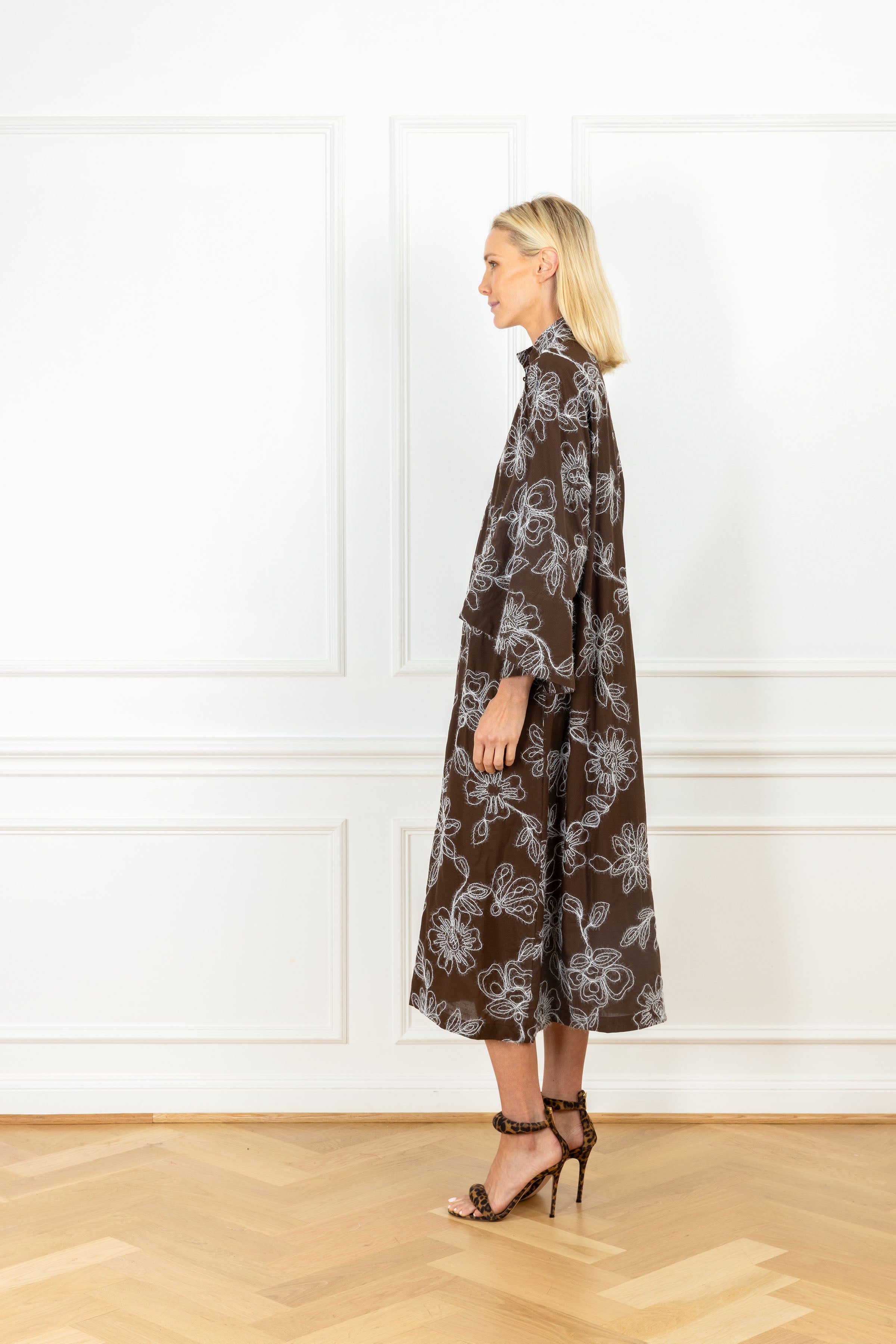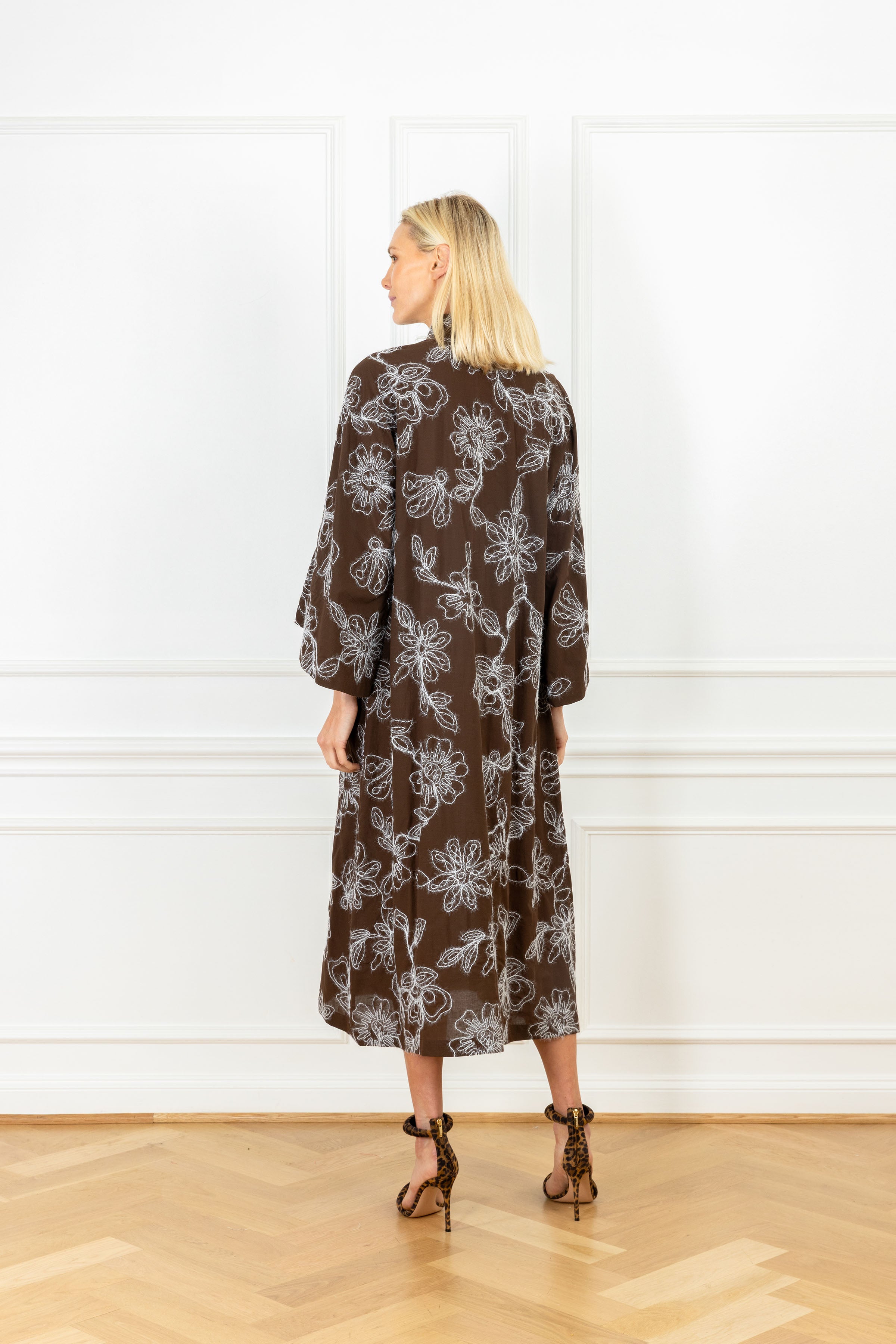 slip on our signature caftan silhouette for an effortless look that feels refined. this caftan features a hand-drawn effect, showcasing white intricately outlined florals against a dark brown, 100% cotton fabrication.