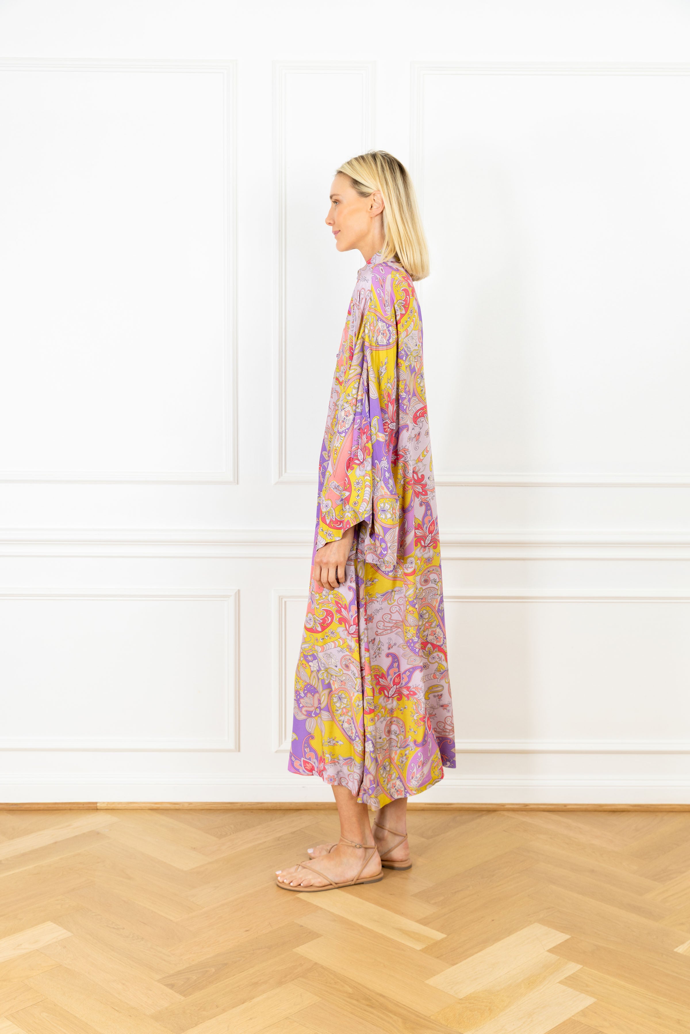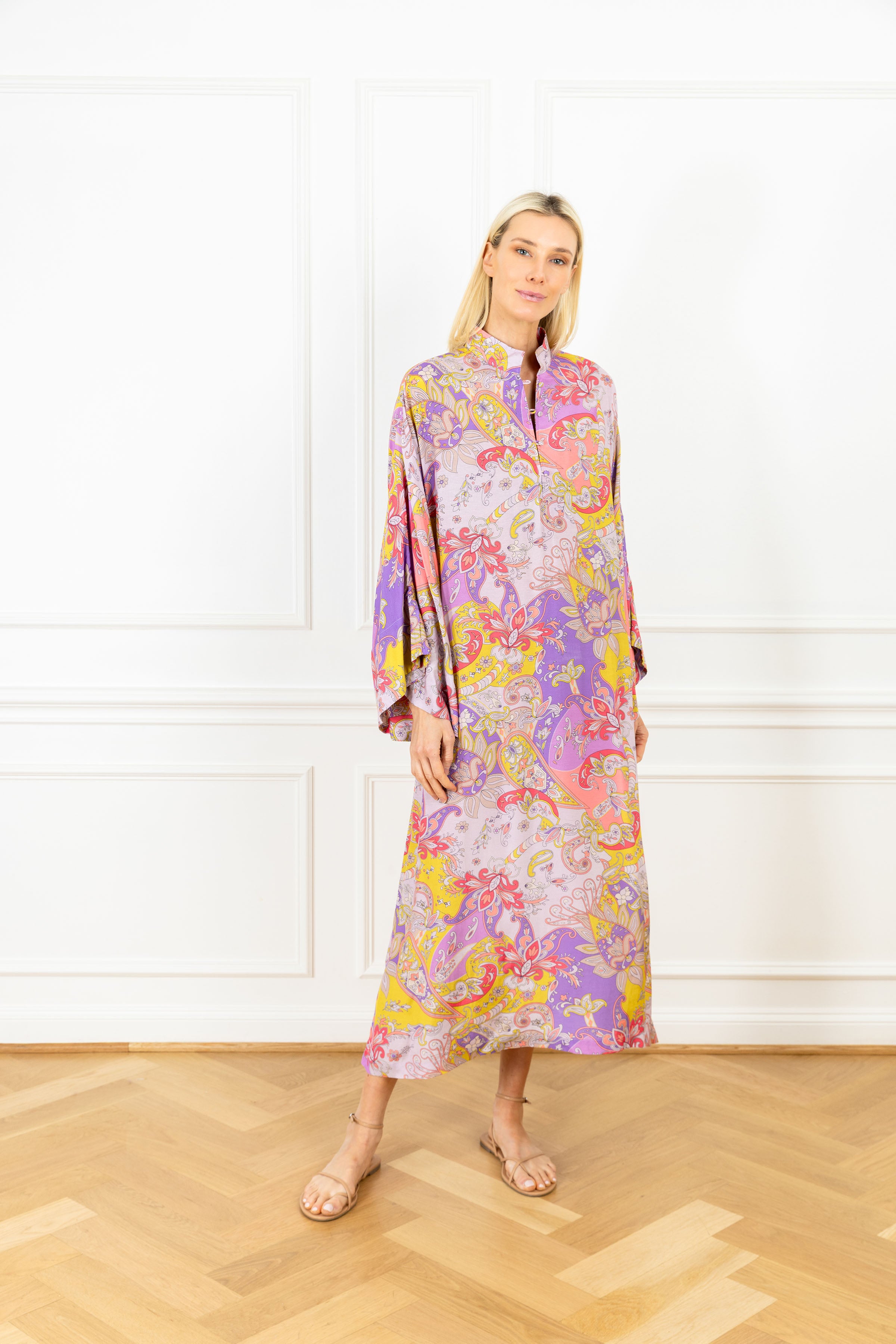 slip on our signature caftan silhouette for an effortless look that feels refined. this caftan features an intricate paisley design composed of stylized florals and curling vines on a linen-blend fabrication.