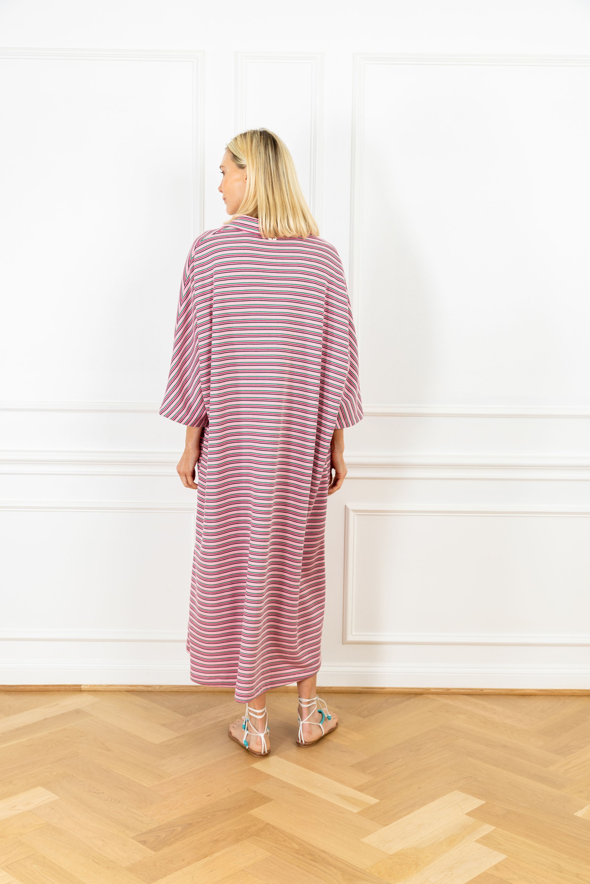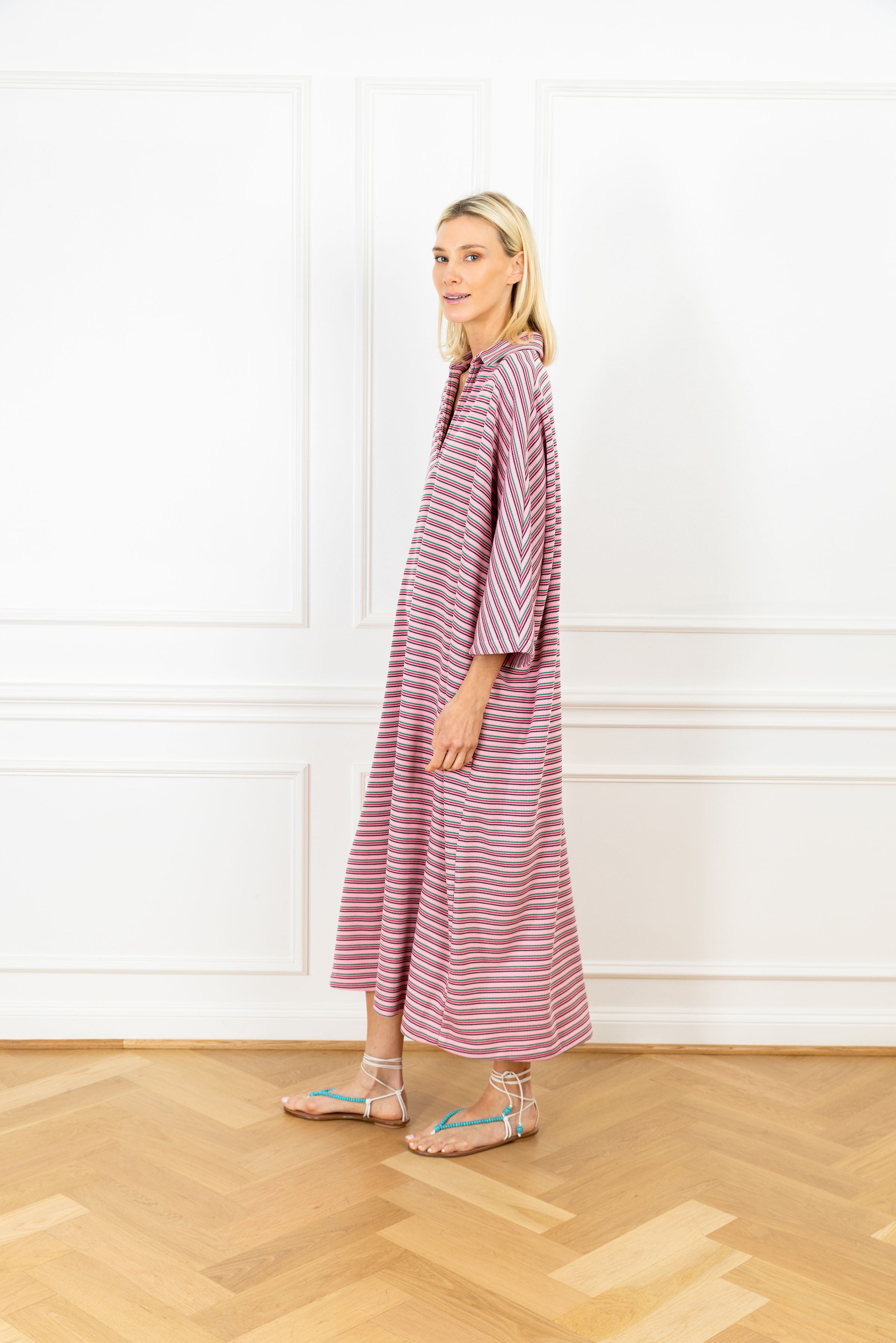 throw on our pullover silhouette for your daily errands or your next dinner date. this playful dress is designed for everyday wear and features a subtle v-neck, a classic polo collar, and an airy sweeping skirt for a flirty finish. this dress features horizontal stripes in pink, green, and burgundy on a soft ribbed knit fabrication.