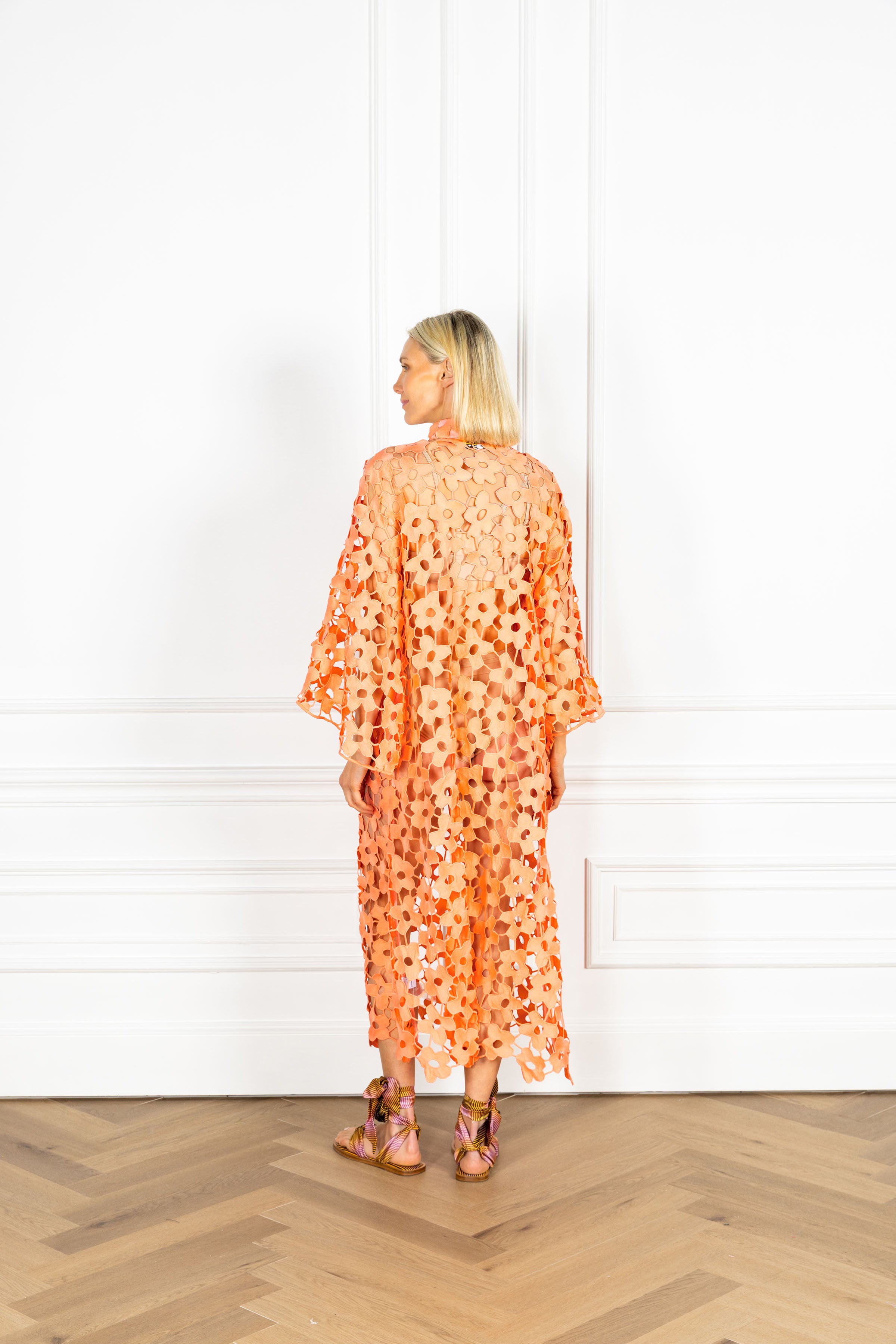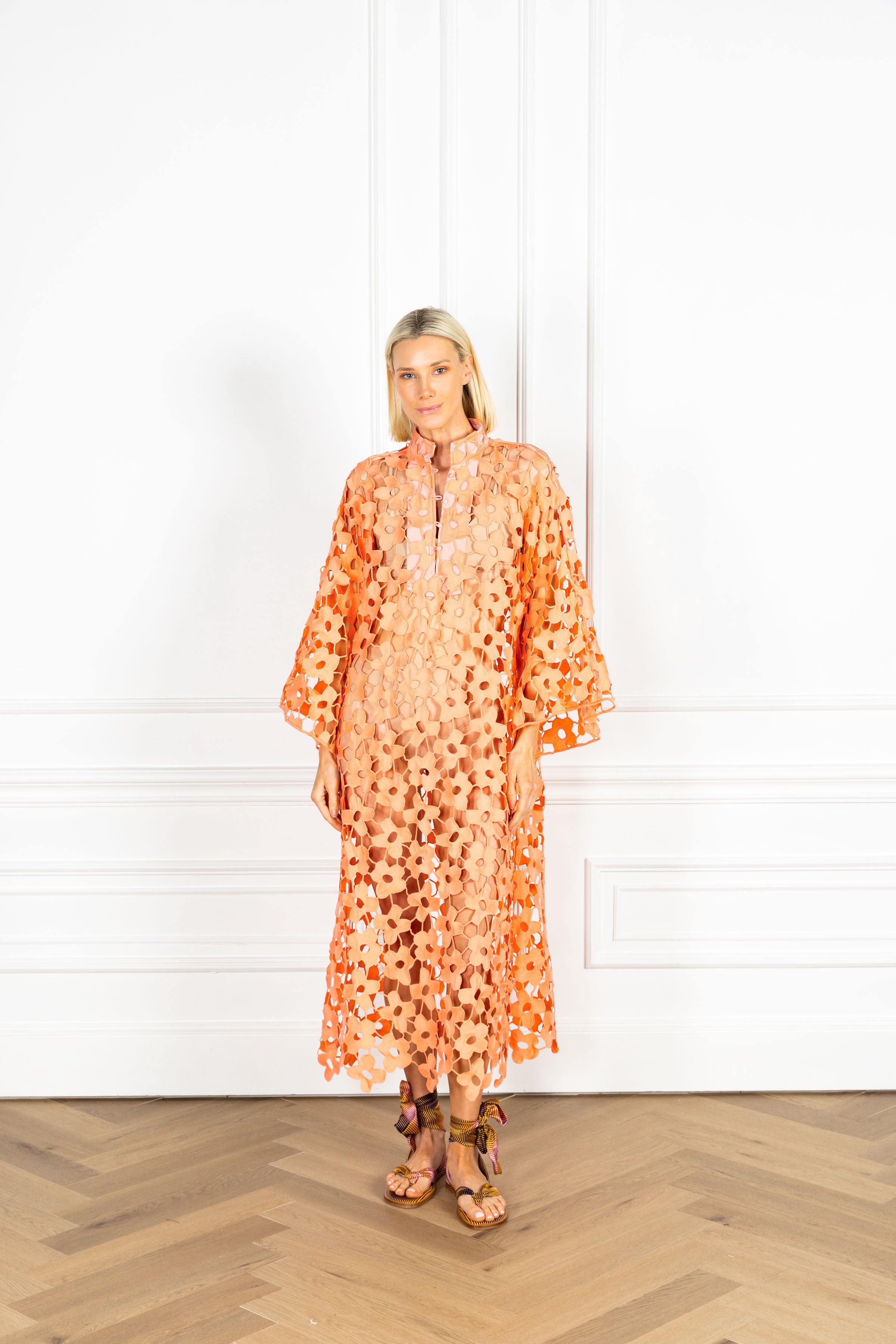 slip on our signature caftan silhouette for an effortless look that feels refined. this caftan features a flat lace fabrication composed of open mod florals linked by delicate netting in a coral colorway.