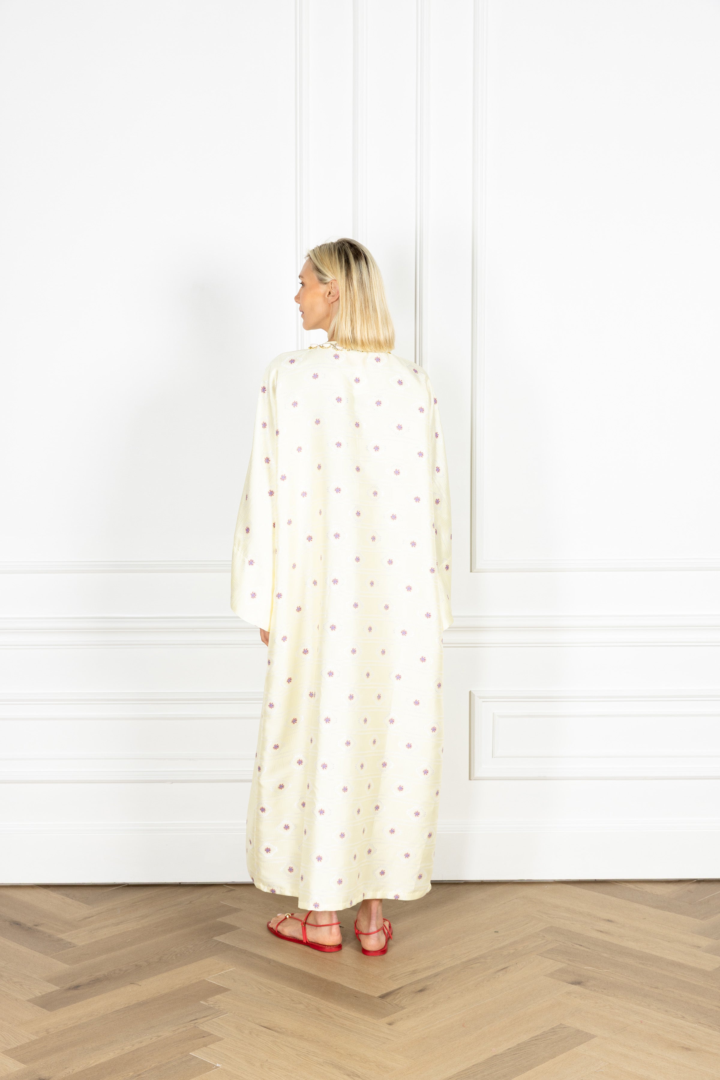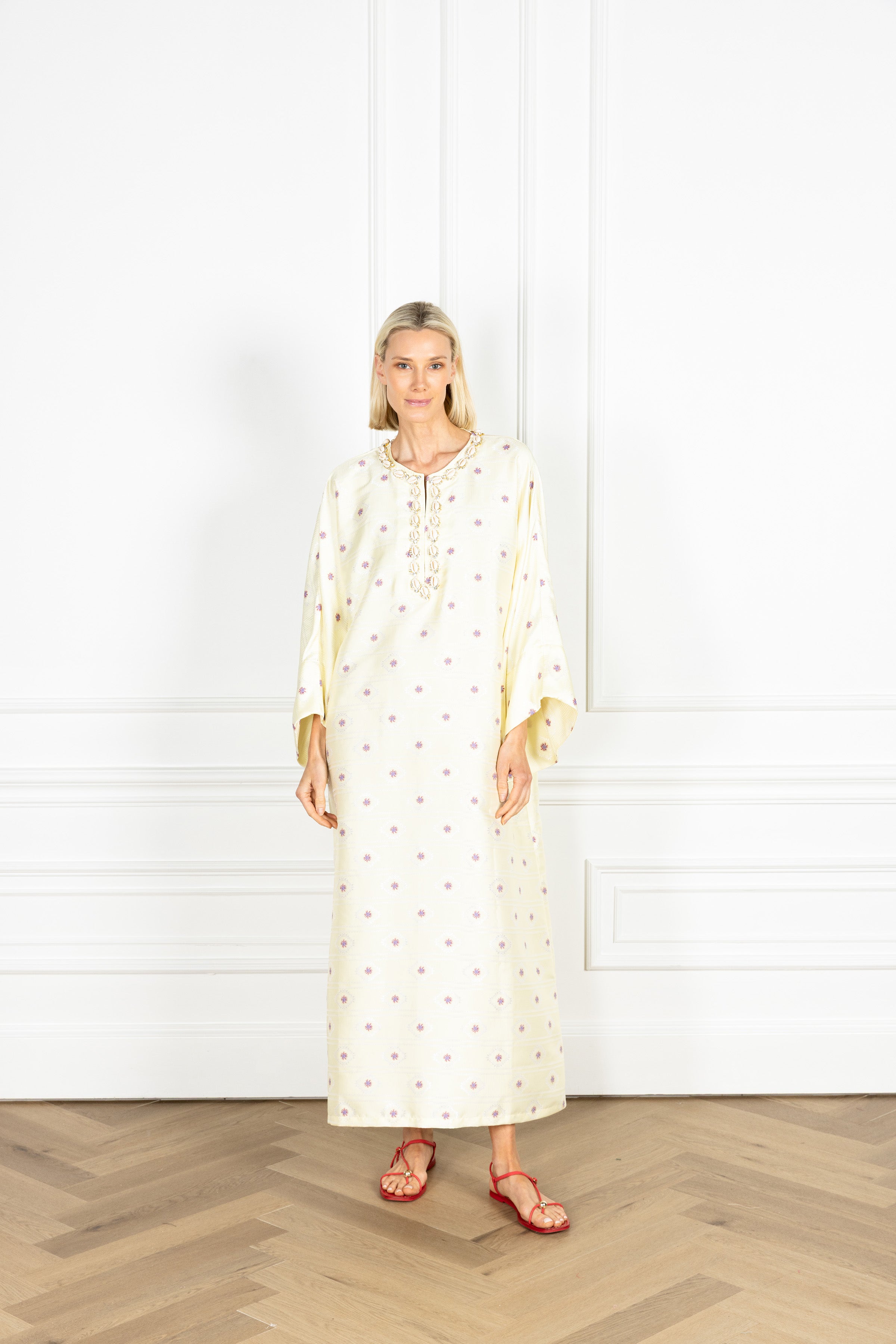 a classic La Vie silhouette with a twist – this style features a customizable deep V neckline with hidden hook-and-eye closures for adjustable coverage. this caftan features a buttery yellow brocade fabrication detailed with delicate medallion motifs throughout and finished with cowrie shells framing the neckline.