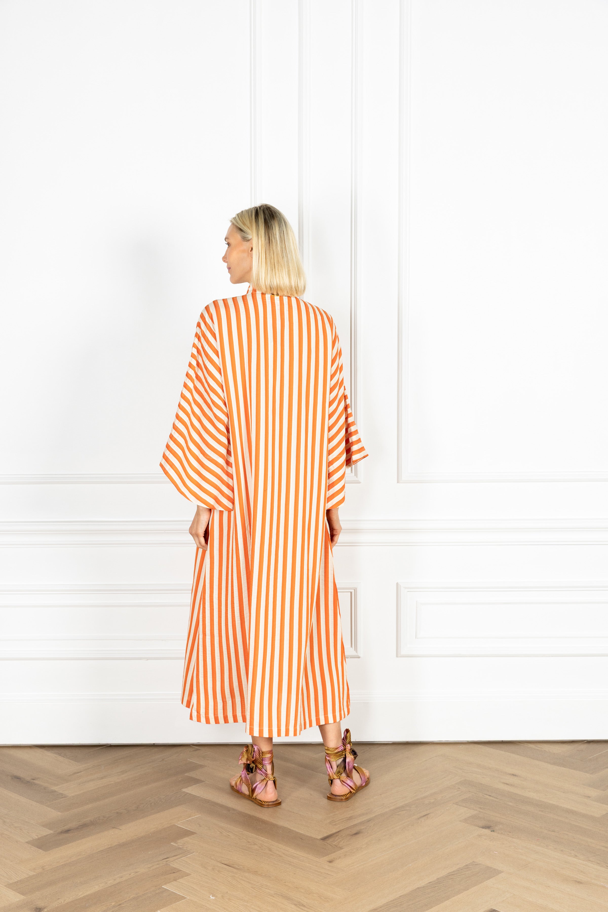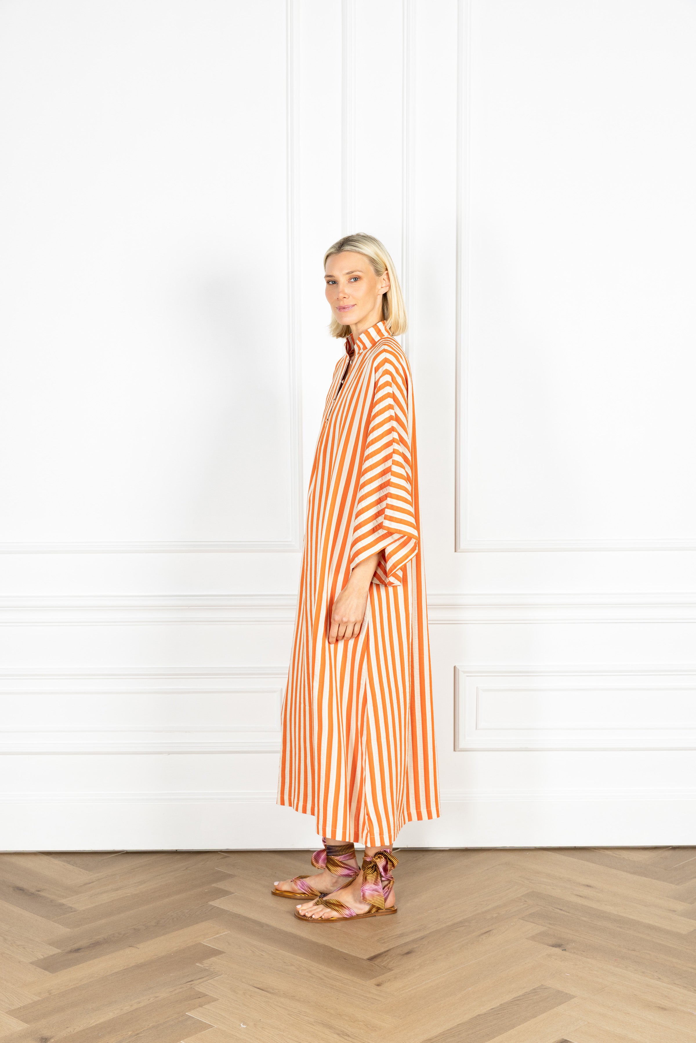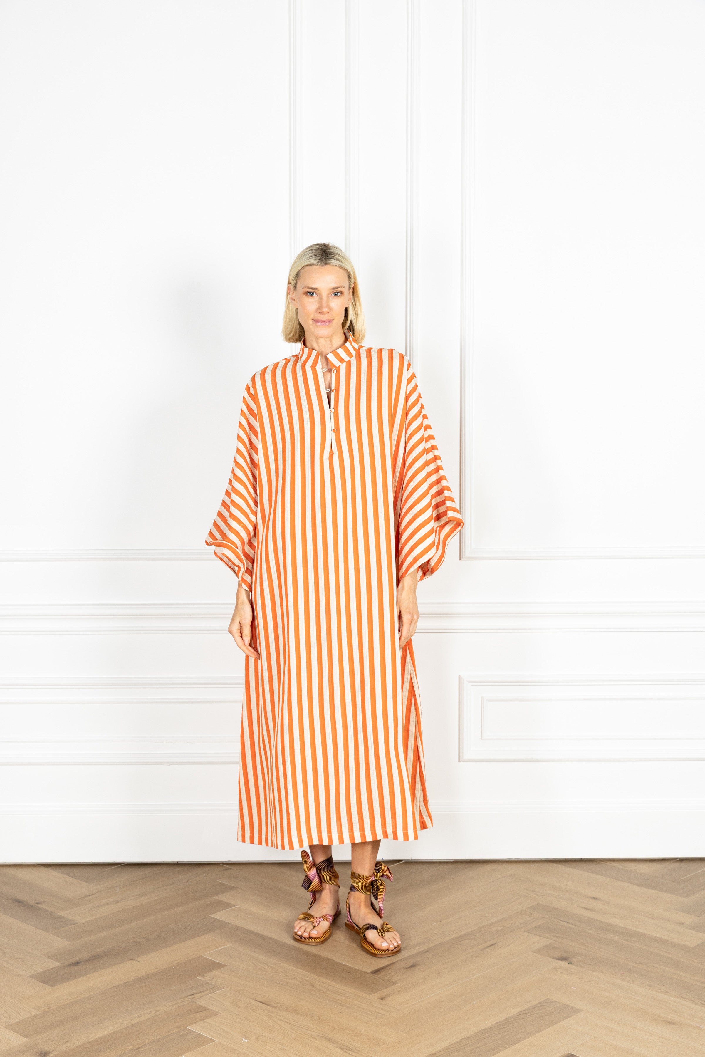 slip on our signature caftan silhouette for an effortless look that feels refined. this caftan features vertical ginger and ivory stripes, subtly textured by soft folds within each band.