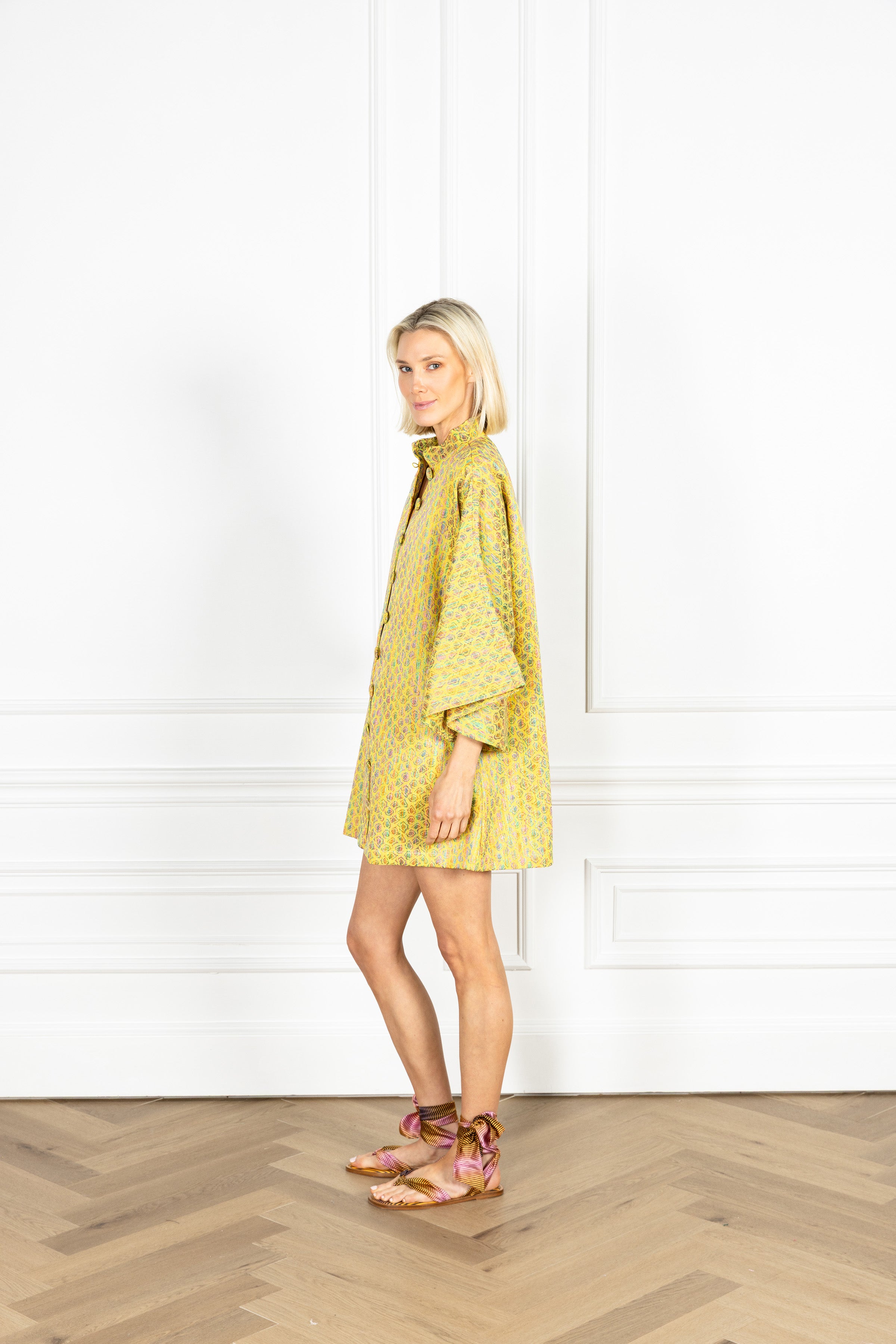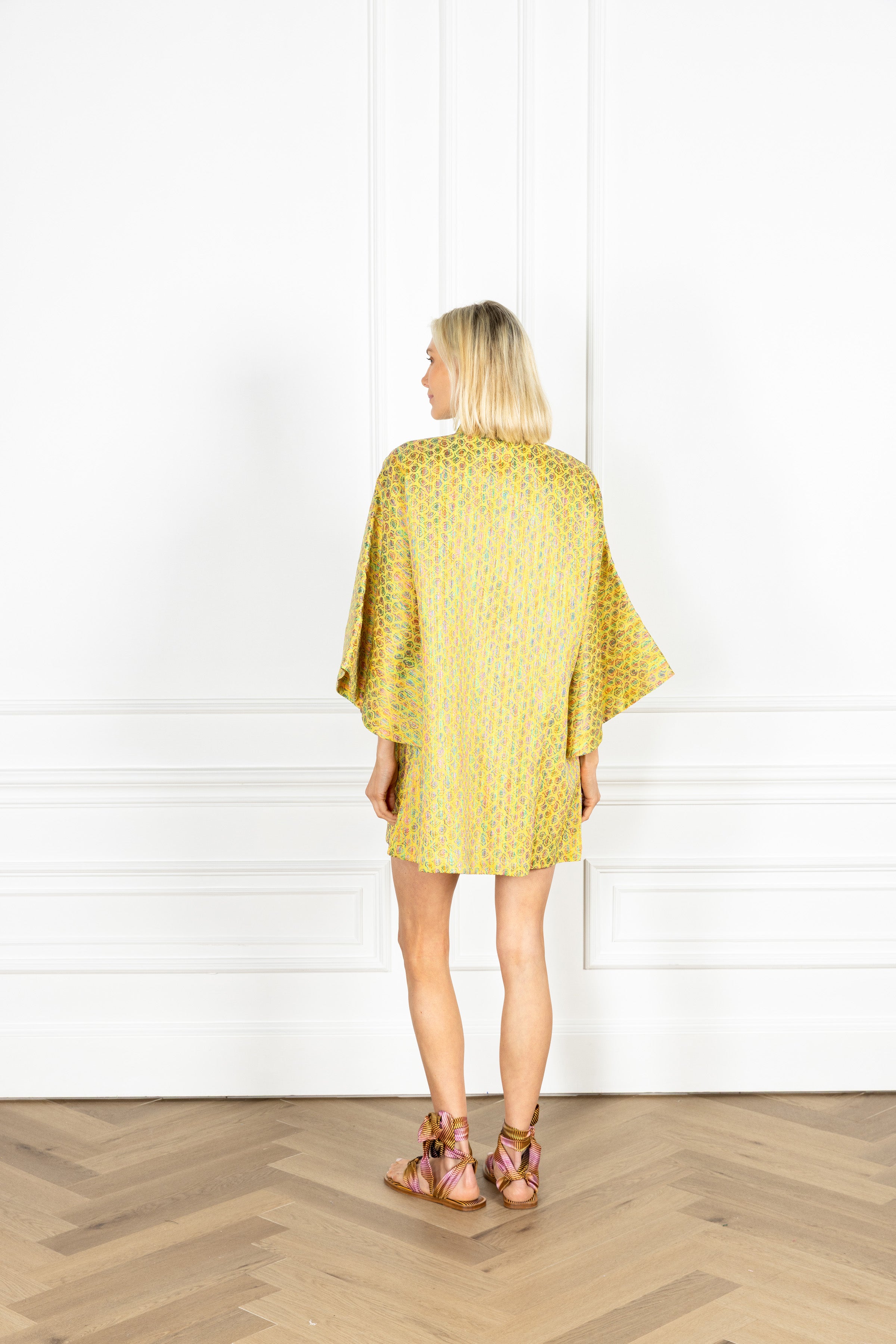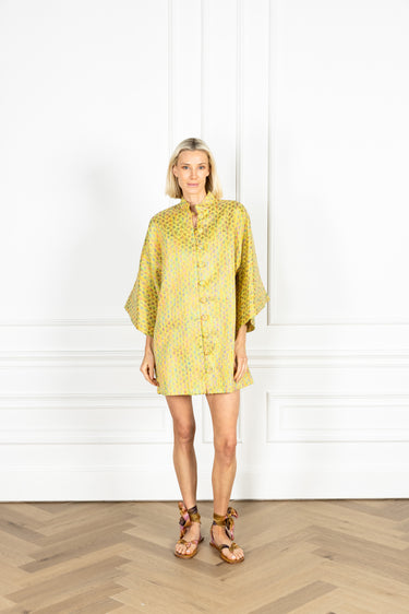 our open front caftan is now offered in a mini! with versatility at its core, this mini can be styled as a short dress or as a chic layer to any ensemble. this caftan is crafted from a woven jacquard and features repeating jewel-toned oval motifs set against a radiant lime ground.