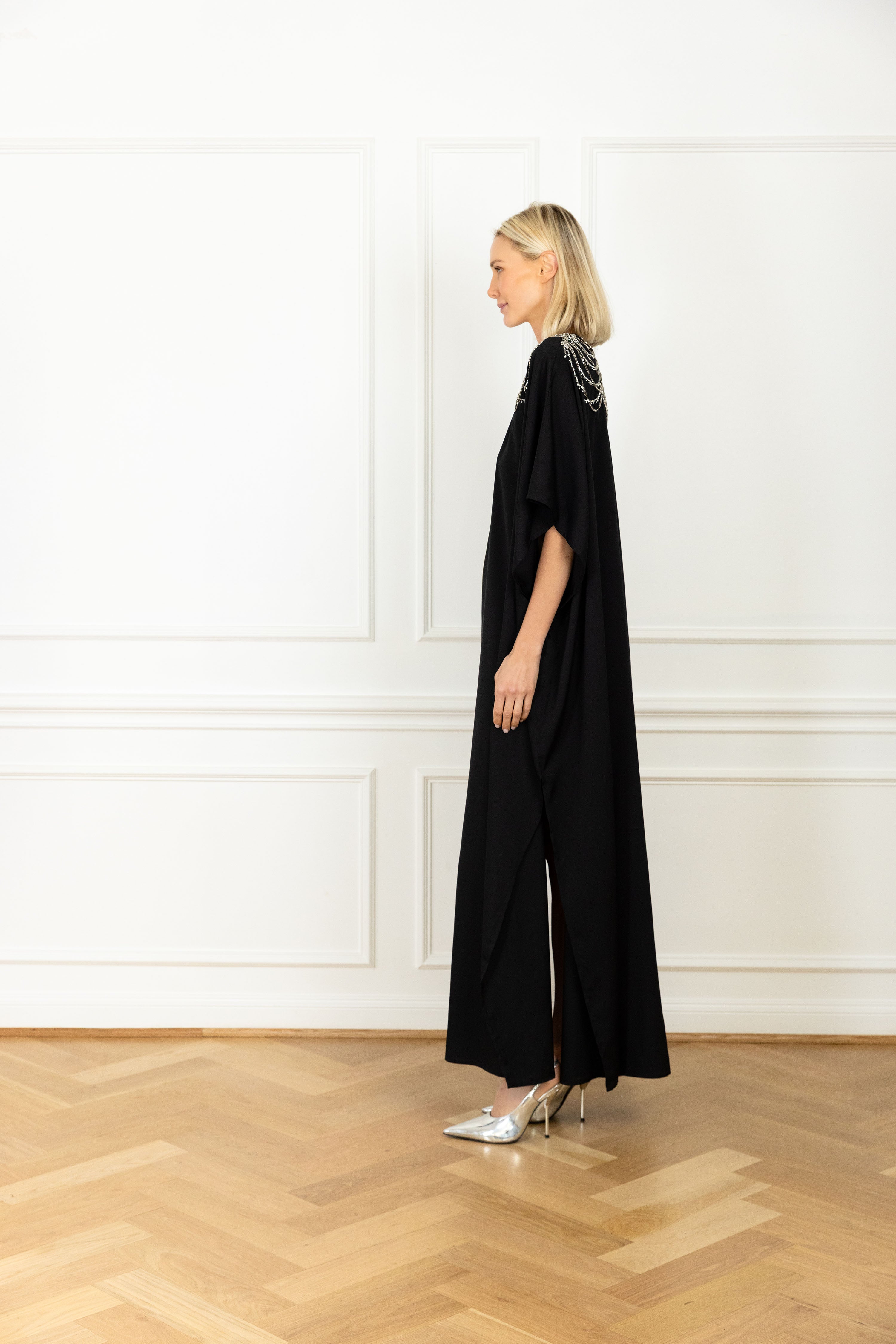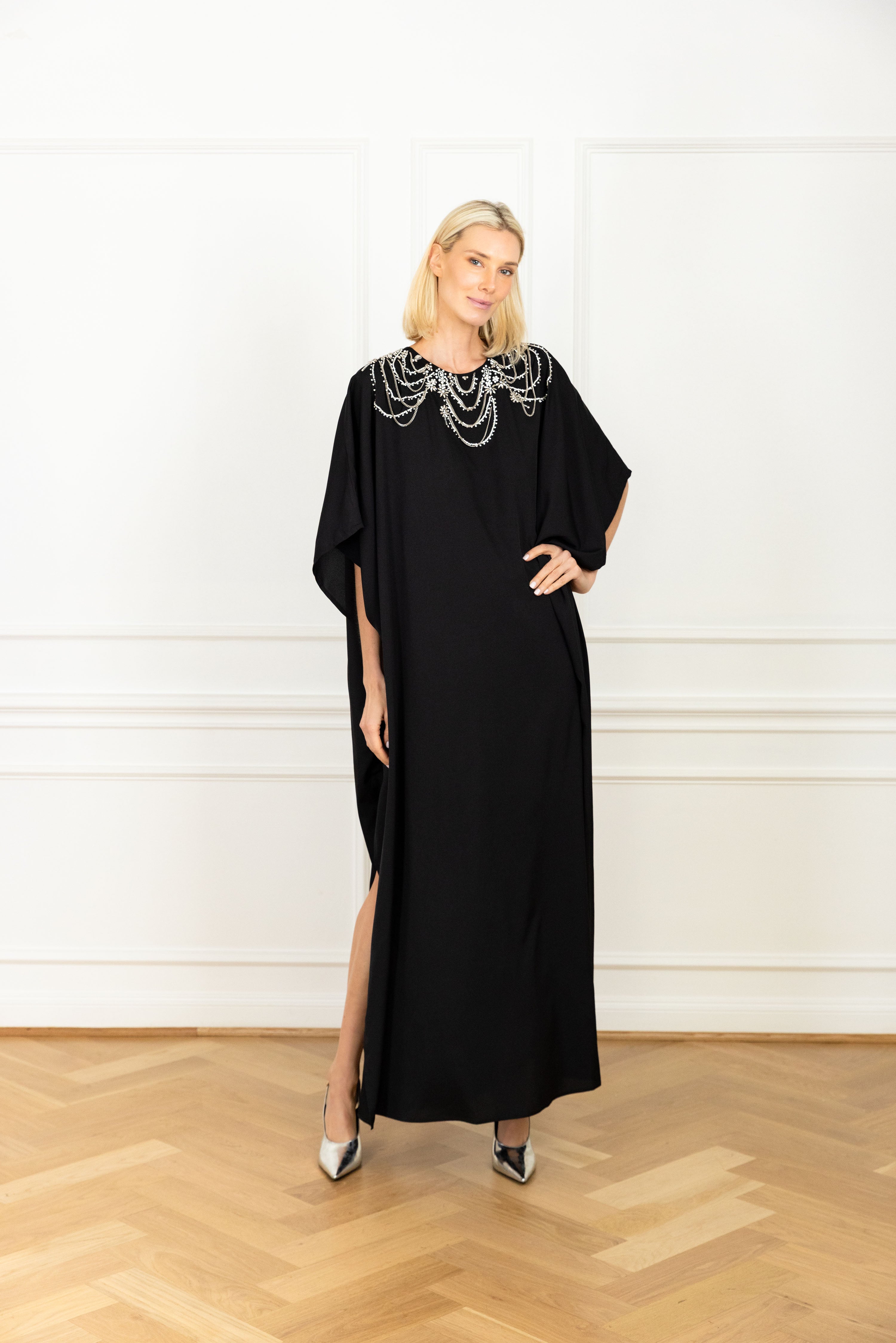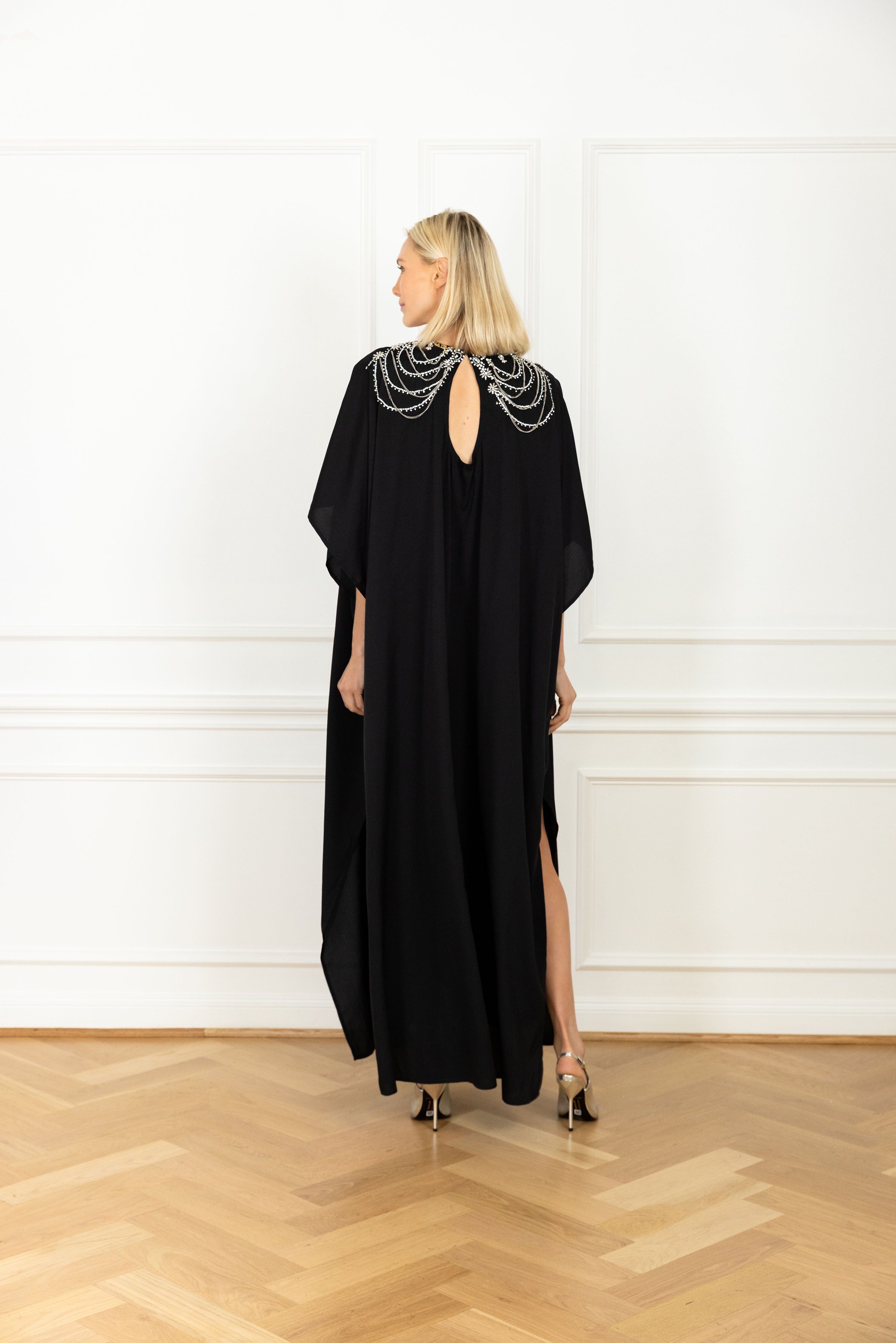 meet our keyhole caftan: this billowing silhouette cascades to the floor with a graceful flow. it features generously cut dolman sleeves for dramatic effect, and a spacious keyhole detail for an unexpected element. this caftan features a black base fabrication embellished by tiered chains and rhinestone strands sweeping across the chest and shoulders.