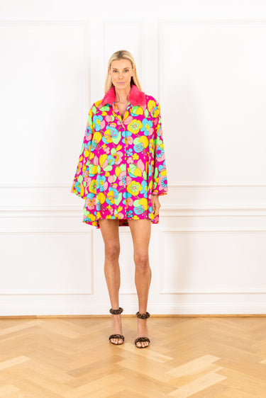 our dress coat is now offered in a mini! this short dress coat showcases a voluminous fit and can be worn open or closed. this timeless piece is a wardrobe staple and features a groovy floral design in saturated colors with a pink fur trimmed collar.