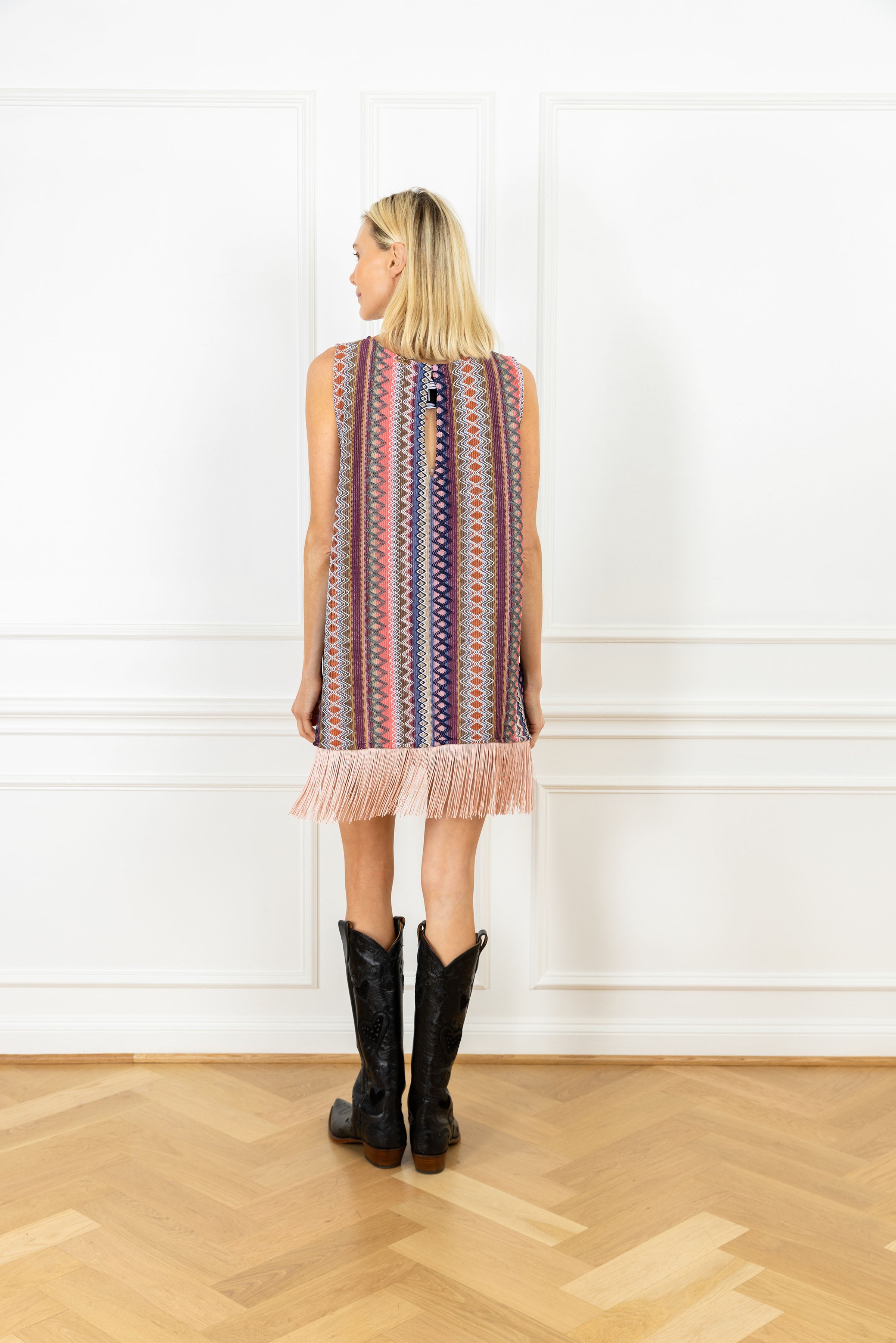 this retro inspired a-line dress perfectly embodies the label's vintage inspired aesthetic. the sleeveless silhouette has an effortless yet elegant fit, and is designed to move seamlessly from day to evening. this knit dress features vertical bands of intricate geometric motifs in multicolor tones, finished with pink fringe trim at the hem.