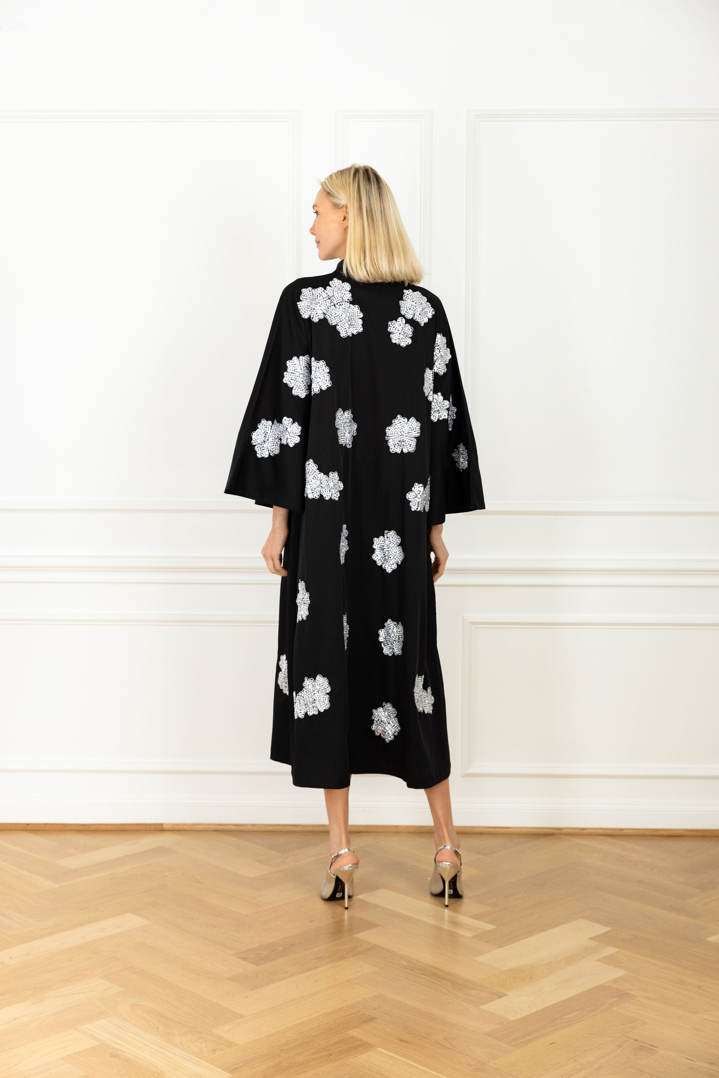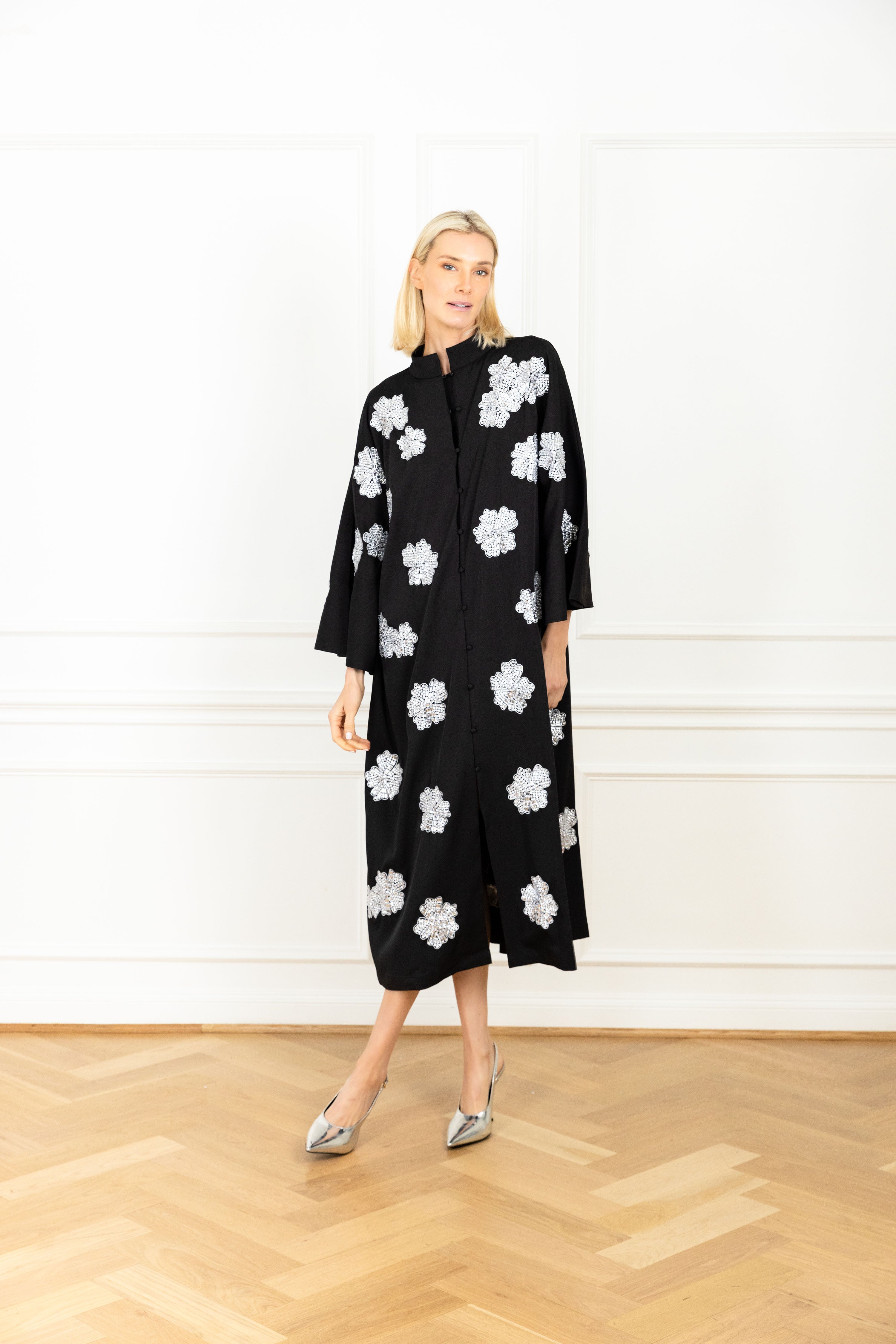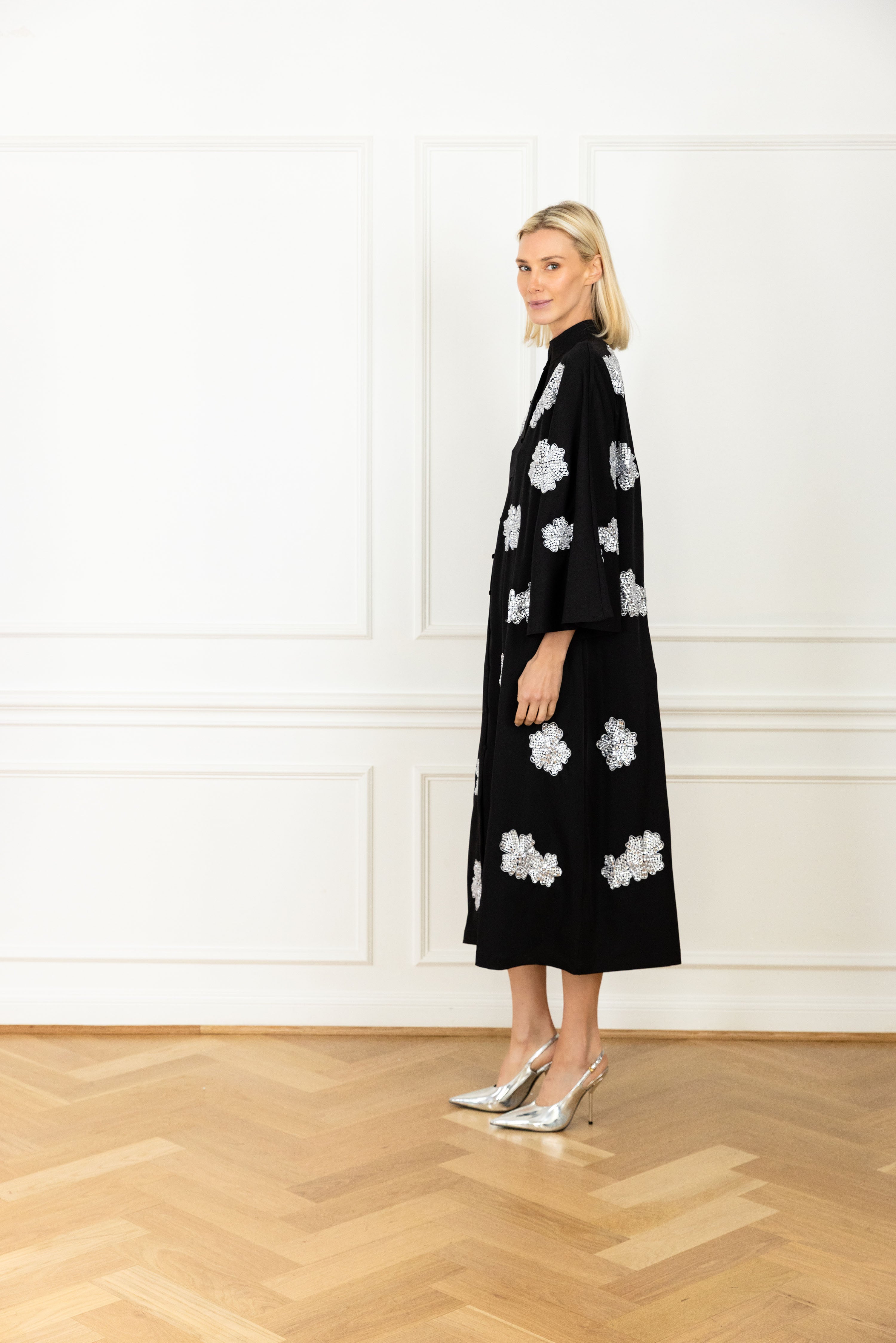 this caftan coat features a matte black fabrication embellished by crystal hibiscus florals scattered across the surface. you have the option to wear open or fully buttoned, this versatile style is a twist on our signature caftan silhouette.