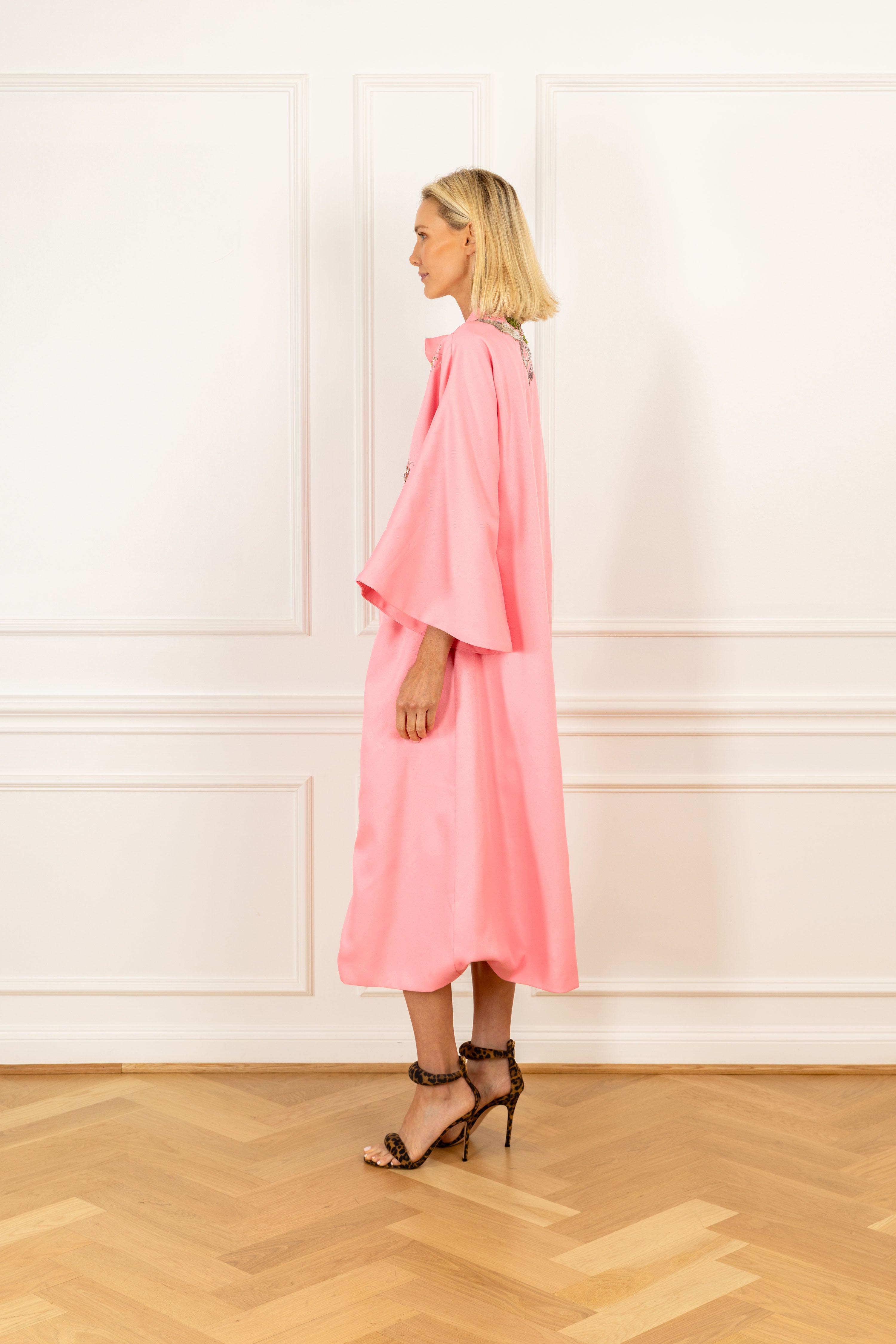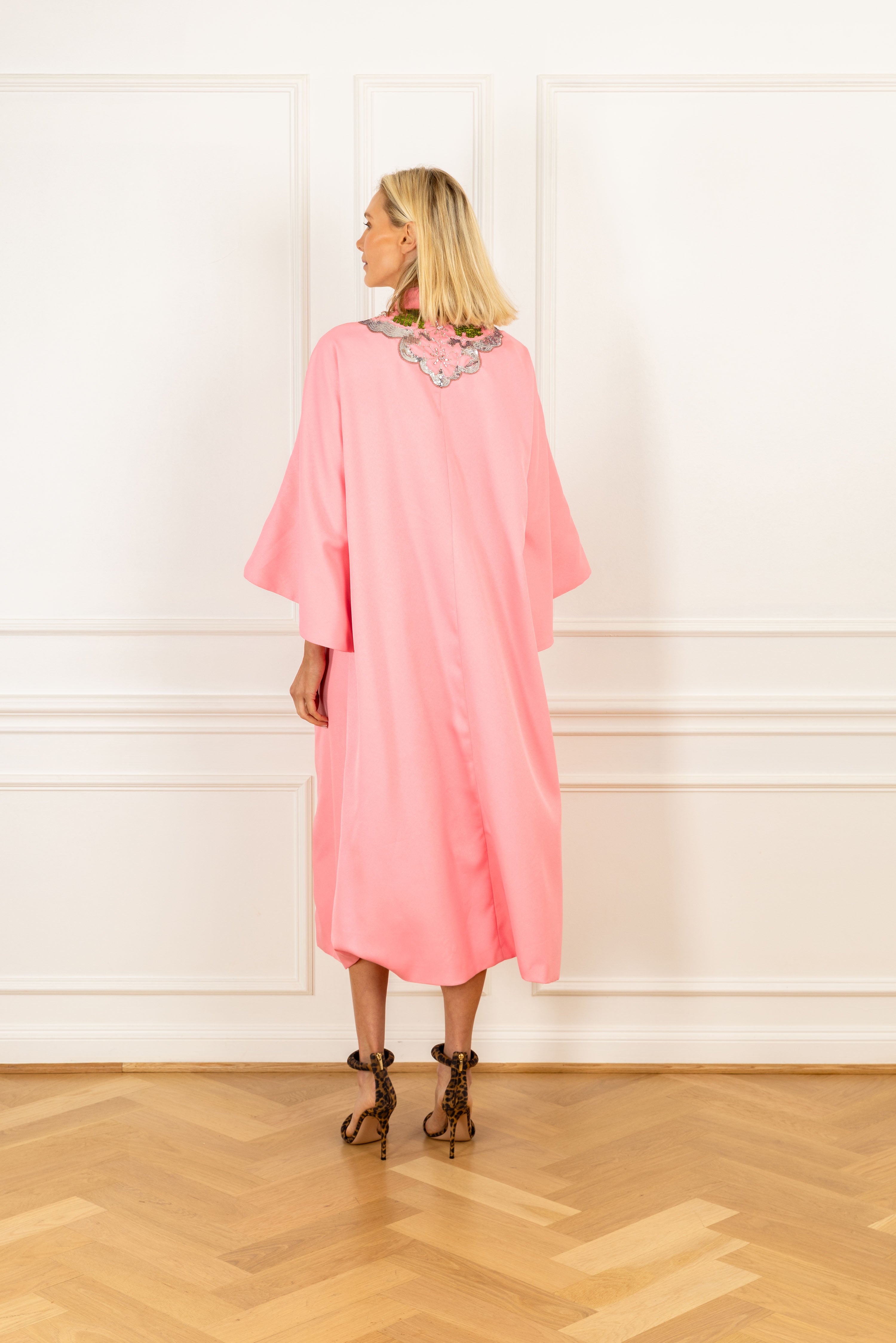 this caftan coat features symmetrical embellishments of green & silver sequins & beads on a structured twill fabrication. you have the option to wear open or fully buttoned, this versatile style is a twist on our signature caftan silhouette.