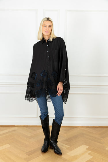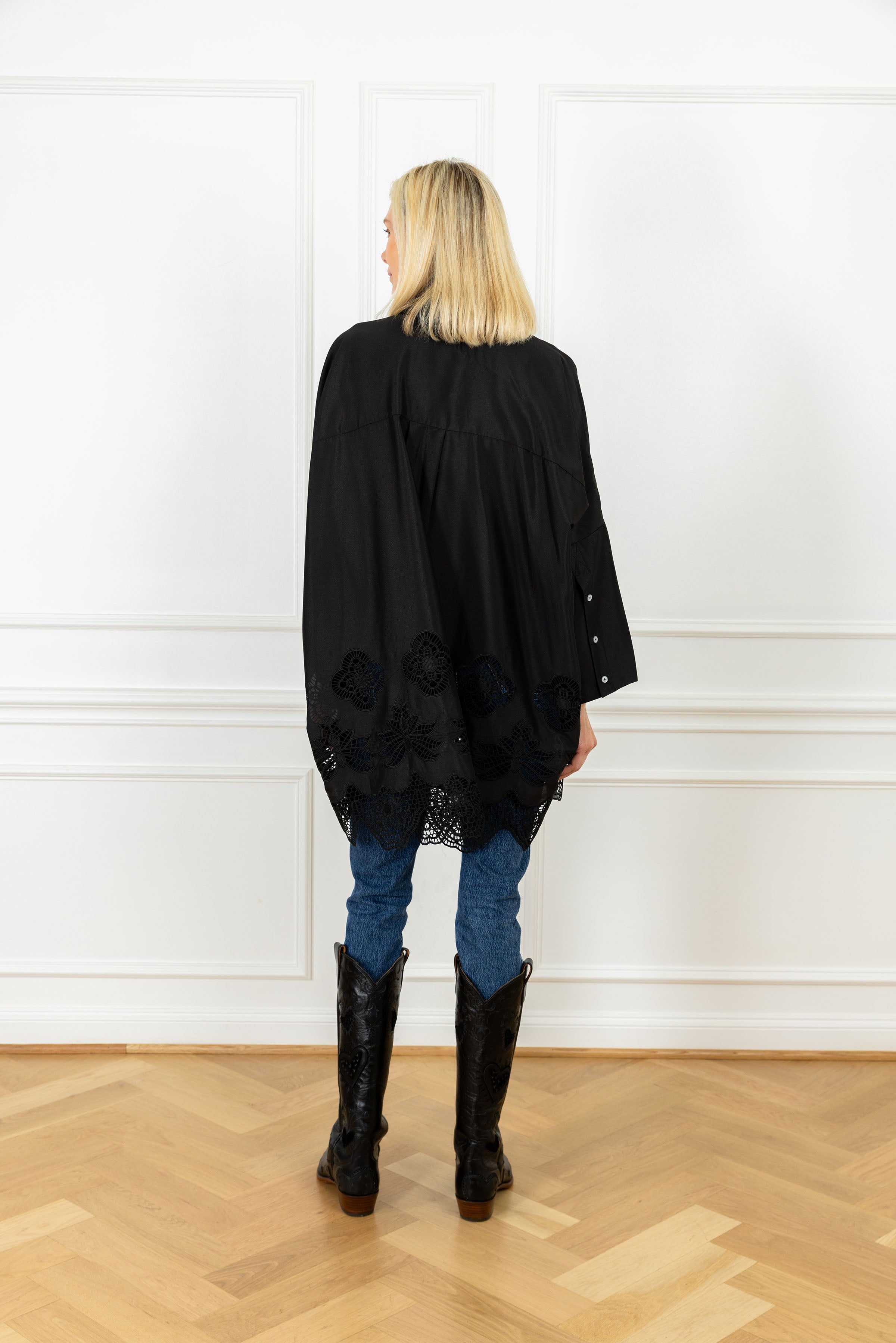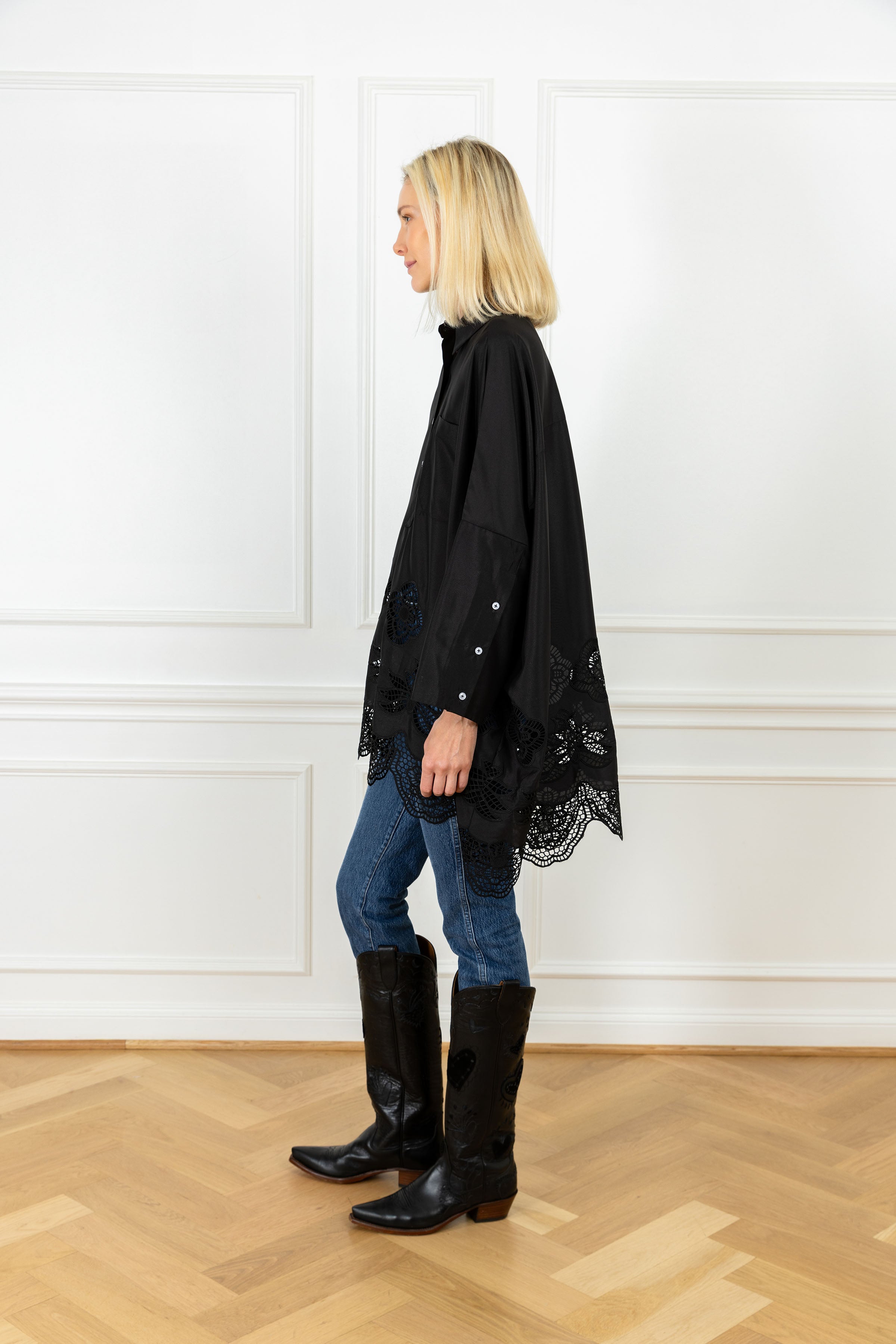 the slouchy fit you know and love, designed for an oversized and elevated look. this shirt features a black satin fabrication, detailed with laser-cut florals and finished with a scalloped lace hem.