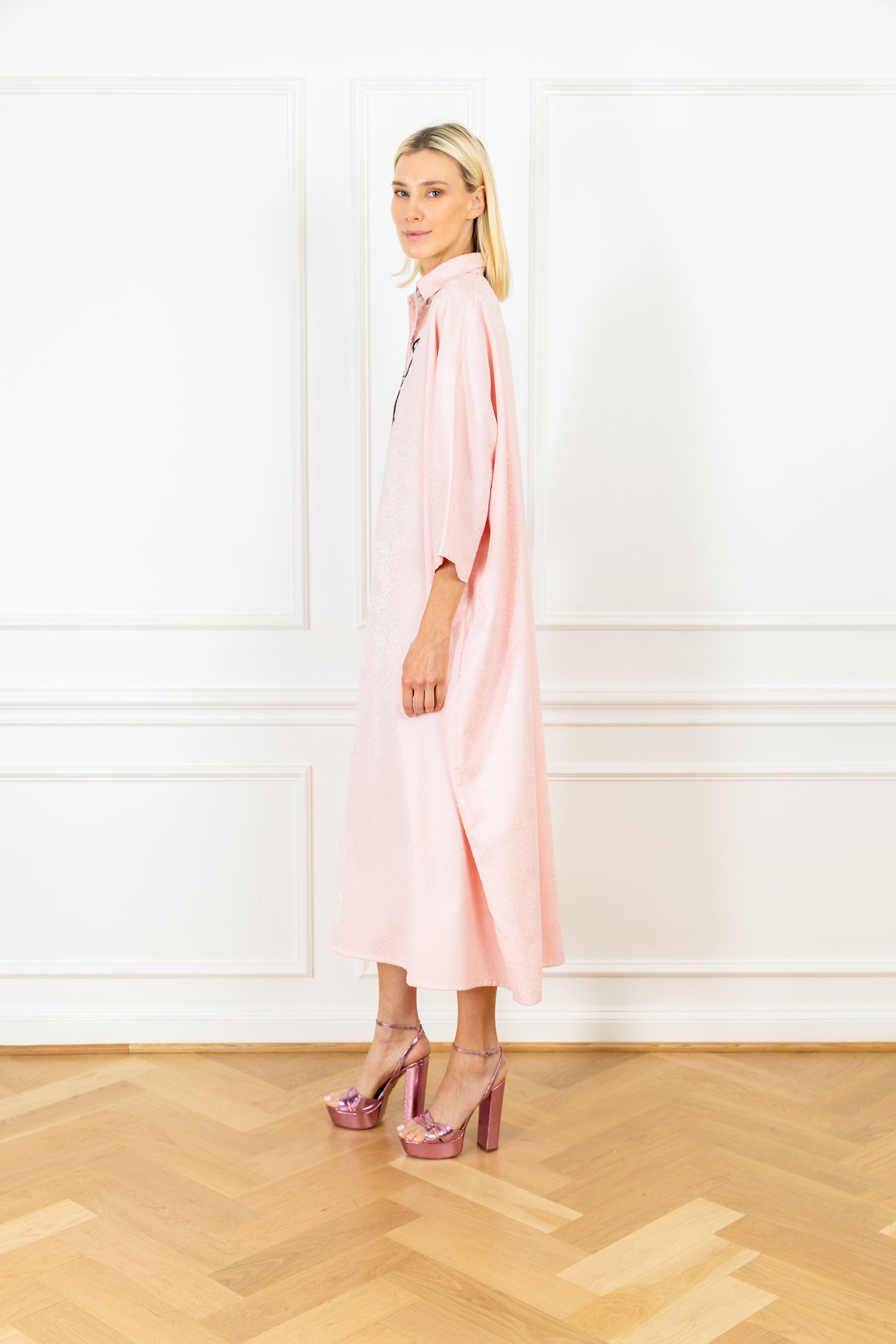 throw on our pullover silhouette for your daily errands or your next dinner date. this playful dress is designed for everyday wear and features a subtle v-neck, a classic polo collar, and an airy sweeping skirt for a flirty finish. this dress features an irregular, organic pattern on a blush satin fabrication, adorned with velvet mod florals bordered by sequins.