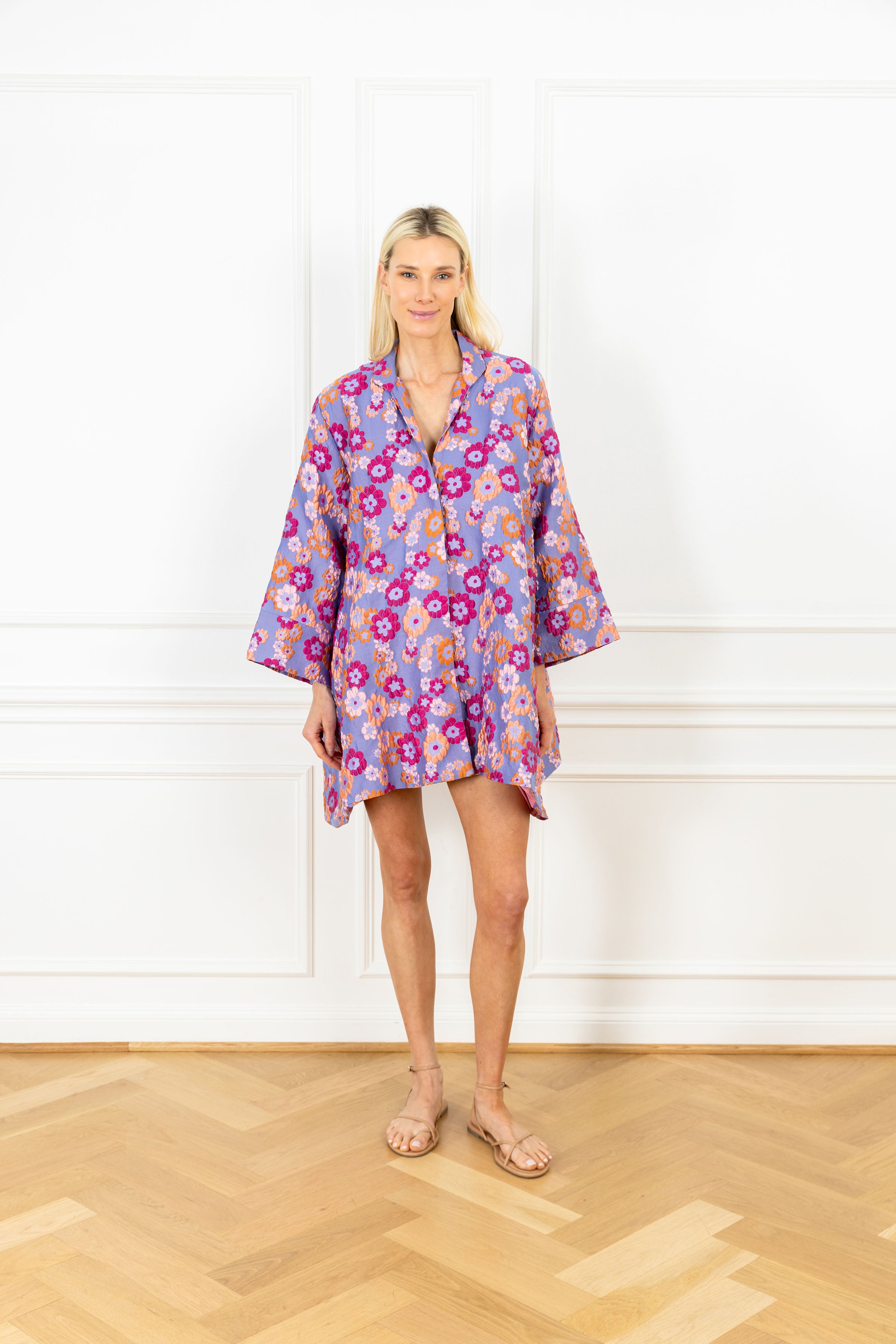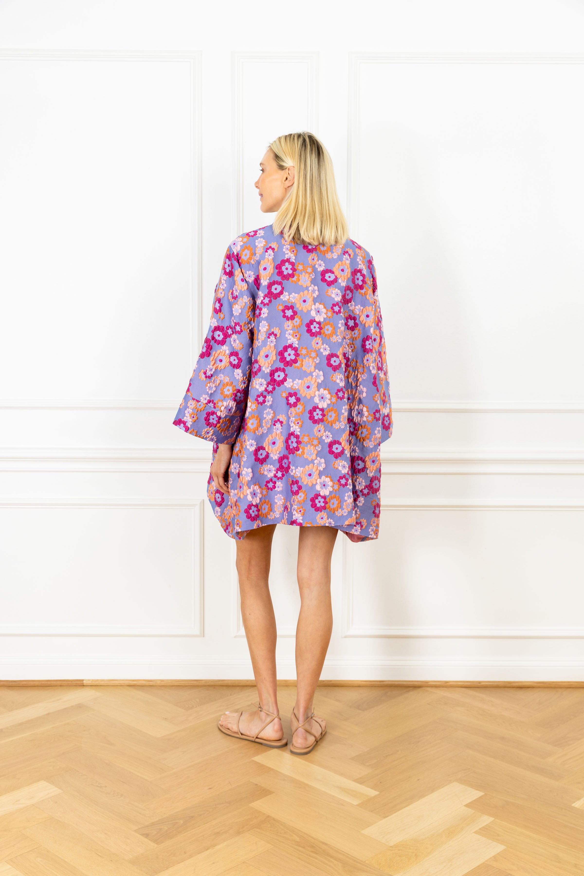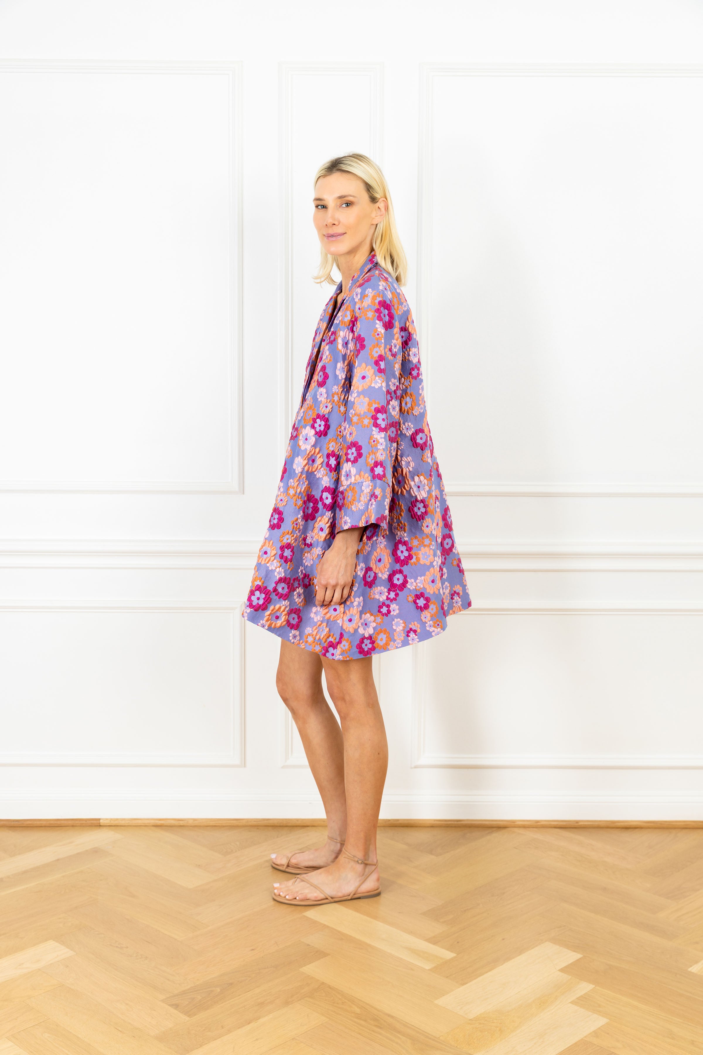 our dress coat is now offered in a mini! this short dress coat showcases a voluminous fit and can be worn open or closed. this dress is crafted in a brocade fabrication, featuring layered florals in warm pink and orange tones woven into a purple base.