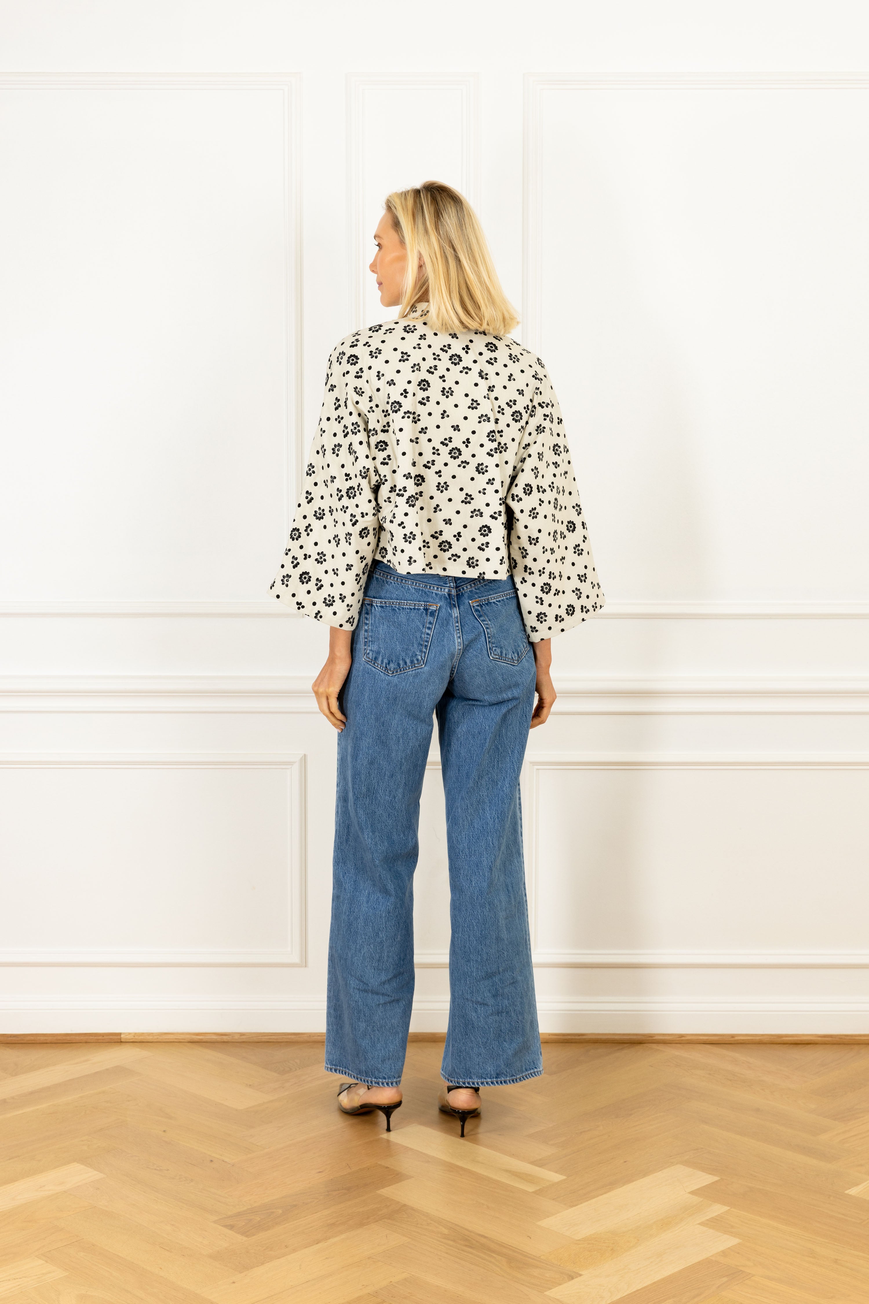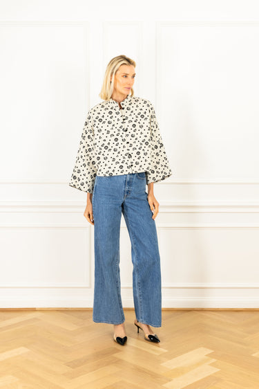 the everyday shirt features a cropped, lightweight flowy fit that can be worn open or fully buttoned, designed for an everyday look. this shirt features a playful design of black polka dots that stand alone and form floral variations contrasting against a white backdrop.
