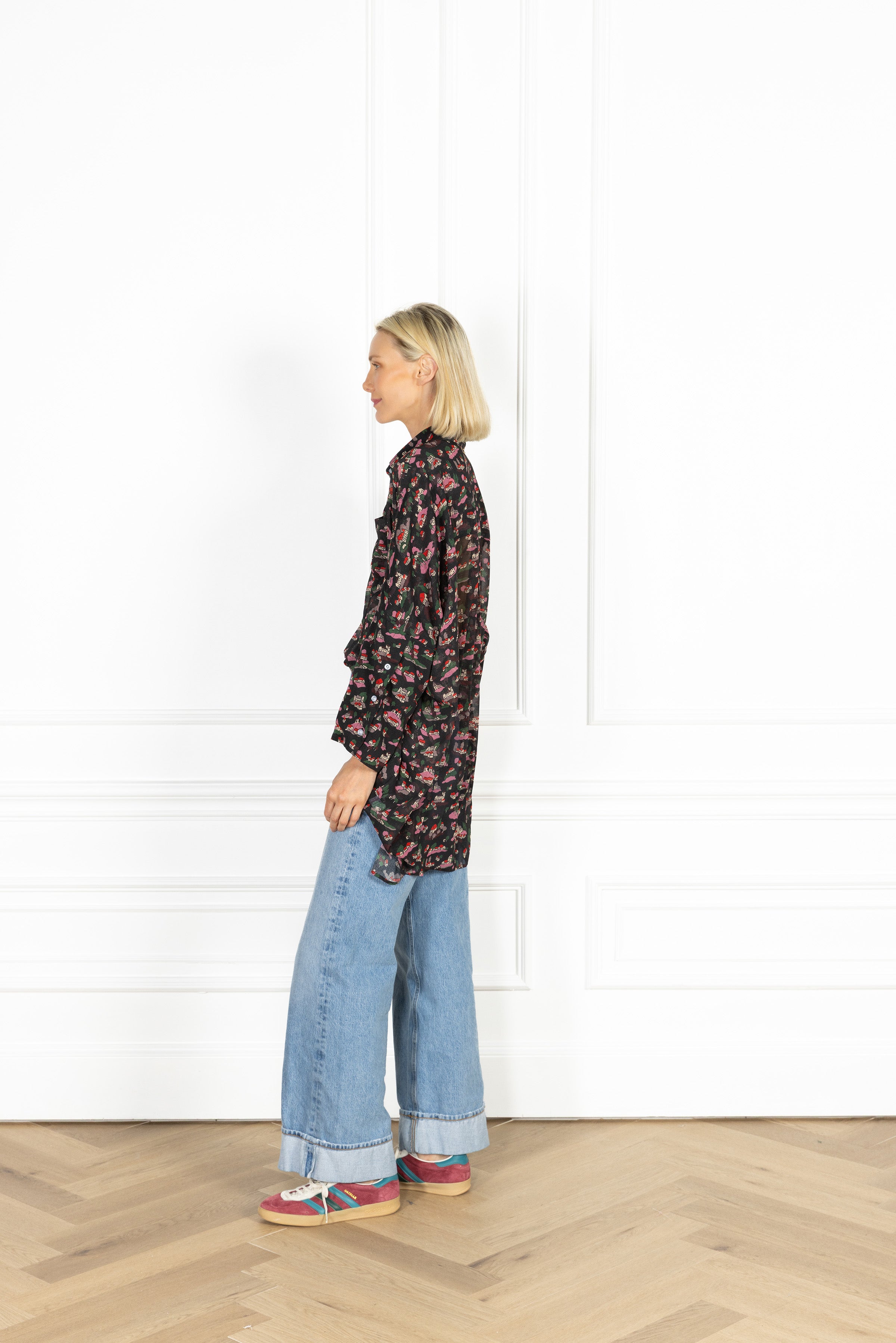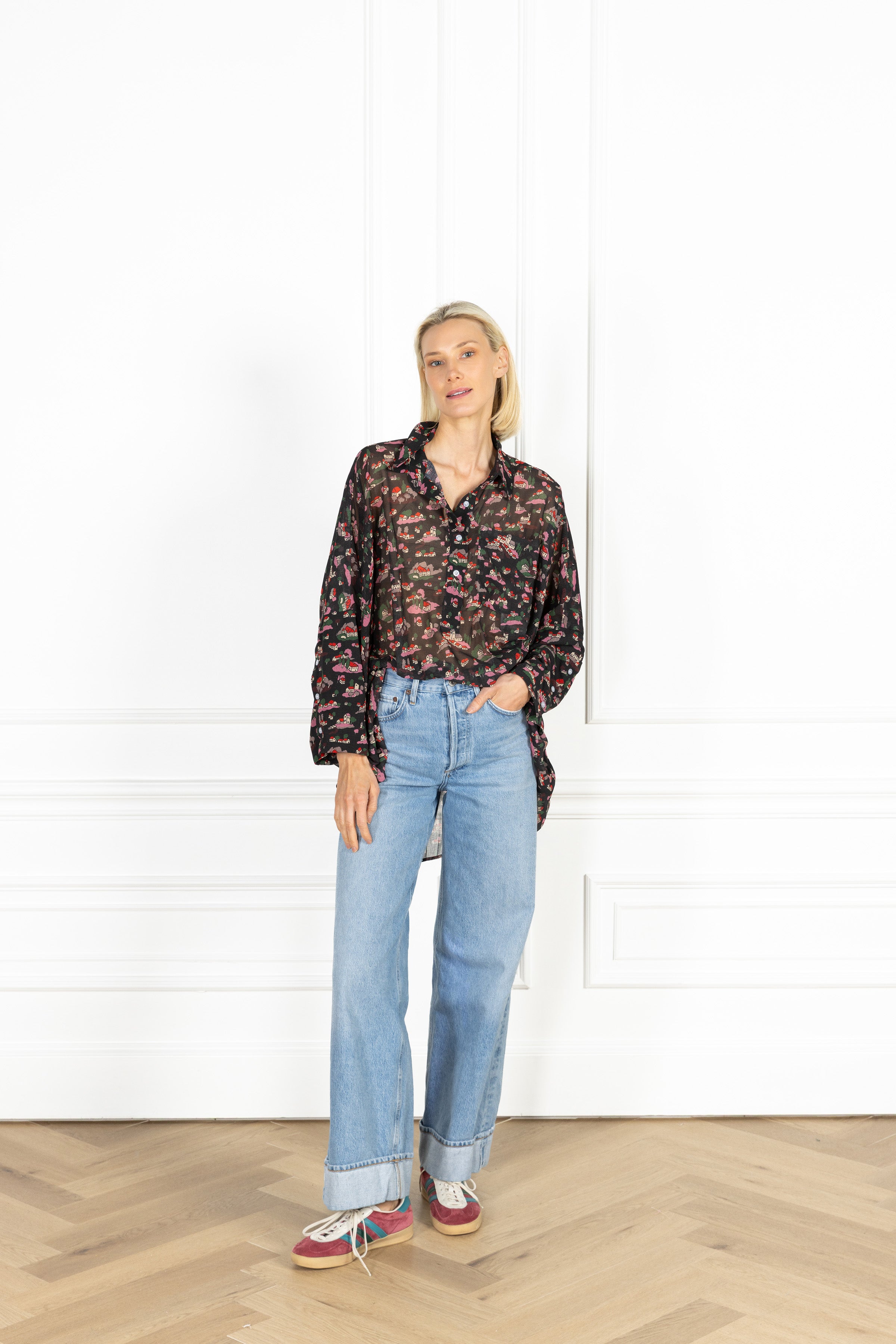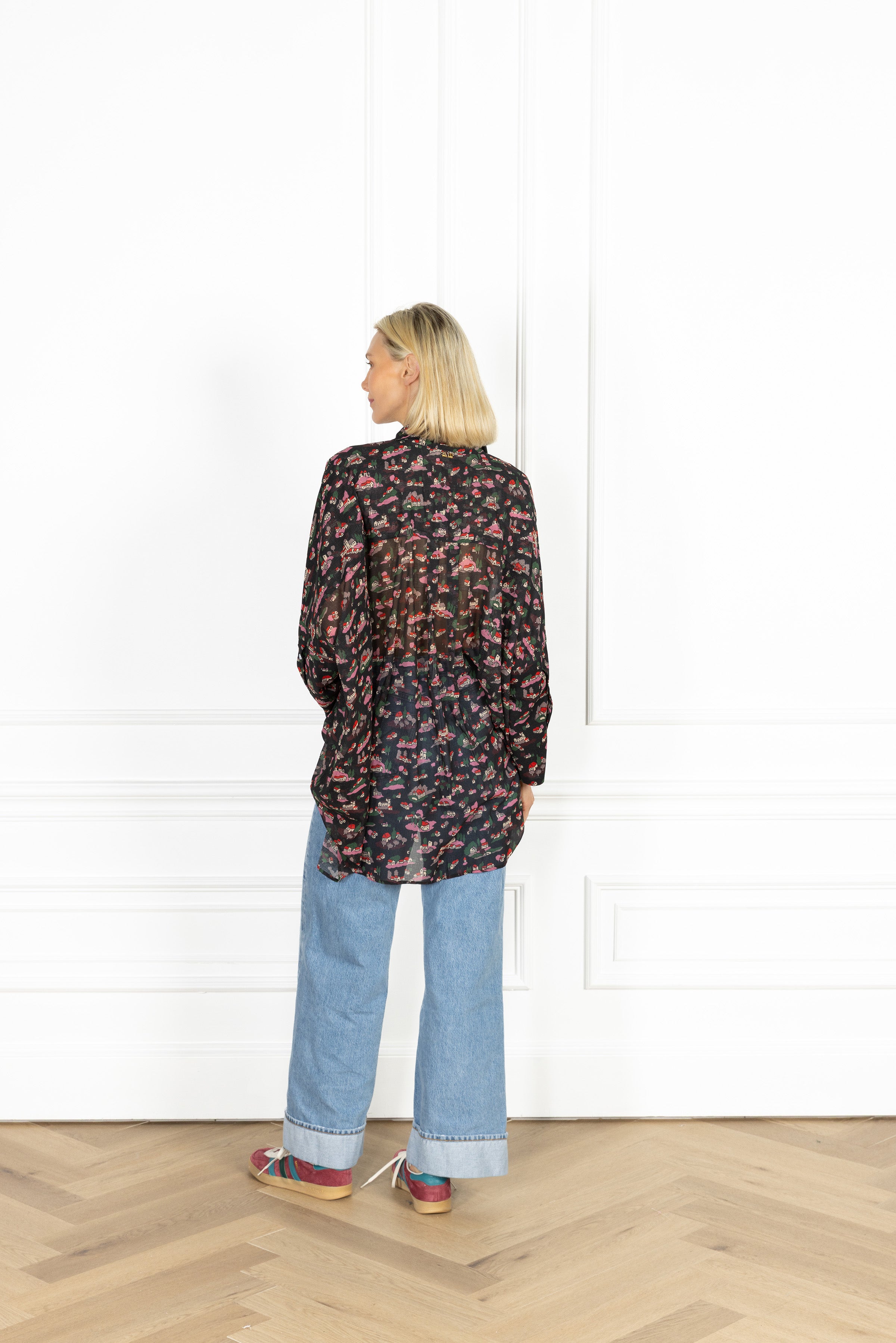 the slouchy fit you know and love, designed for an oversized and elevated look. this shirt features a sheer black chiffon fabrication scattered with tiny countryside cottages in pink and red.