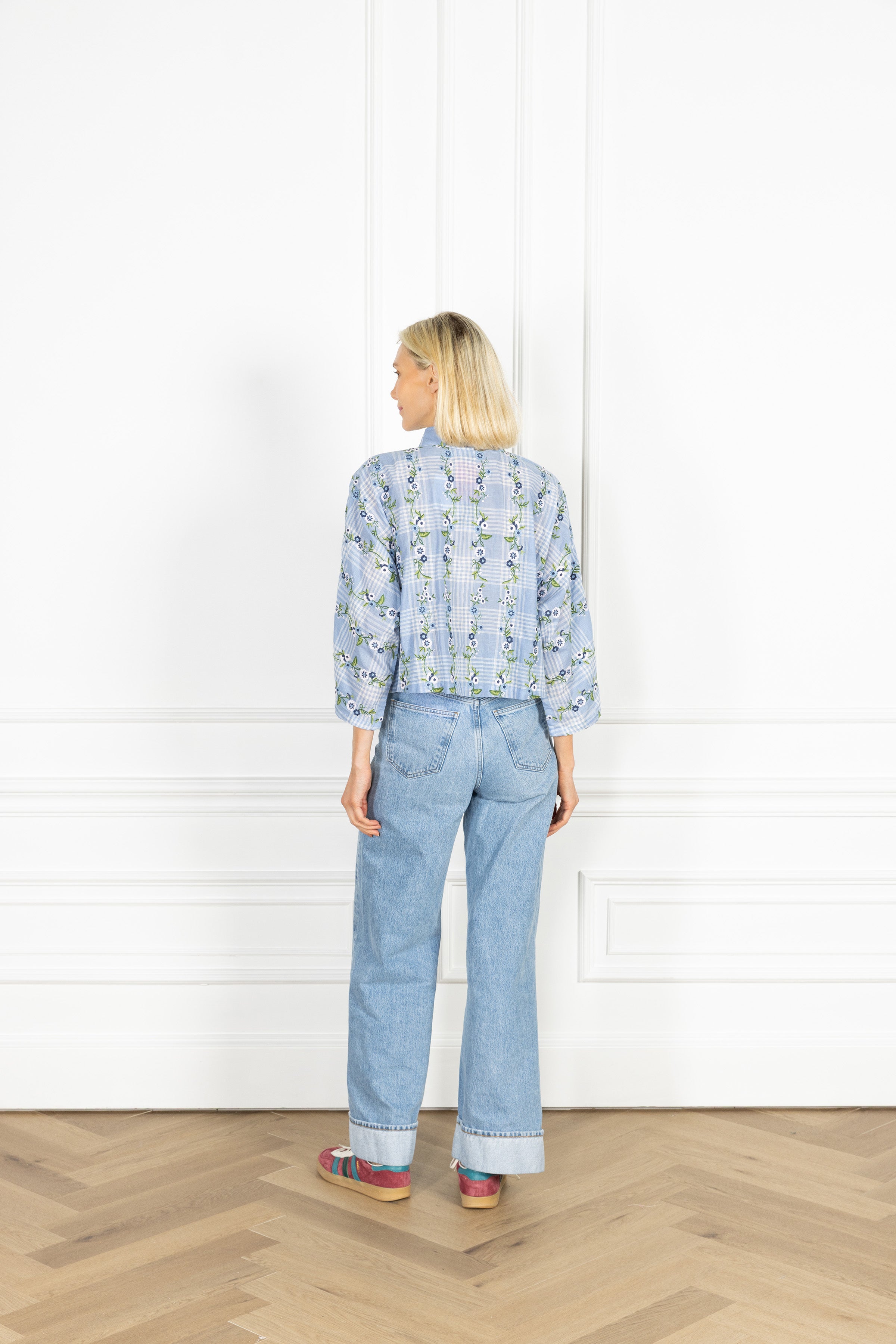 the everyday shirt features a cropped, lightweight flowy fit that can be worn open or fully buttoned, designed for an everyday look. this shirt is crafted from 100% cotton and features a picnic-inspired design of floral embroidery layered over a classic gingham print.