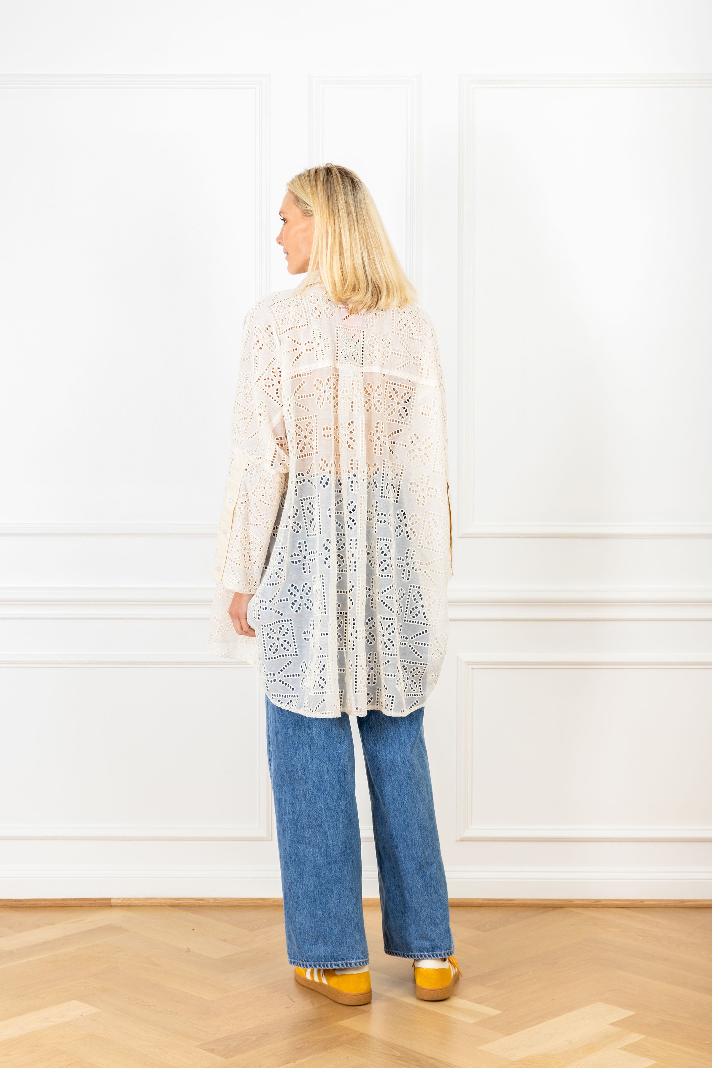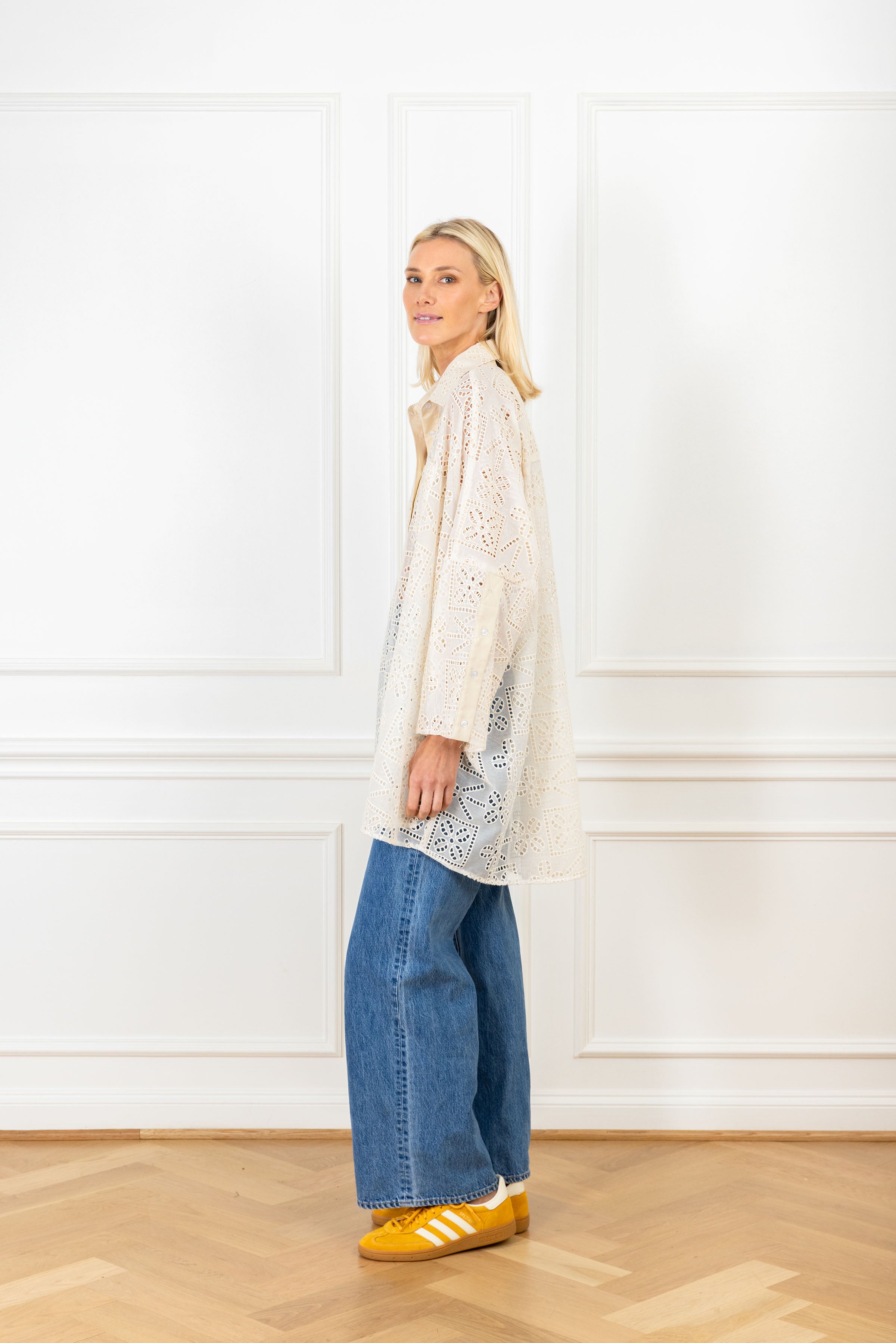 the slouchy fit you know and love, designed for an oversized and elevated look. this shirt features a sheer eggshell-colored fabrication with intricate cutwork embroidery, providing a lace-like effect.