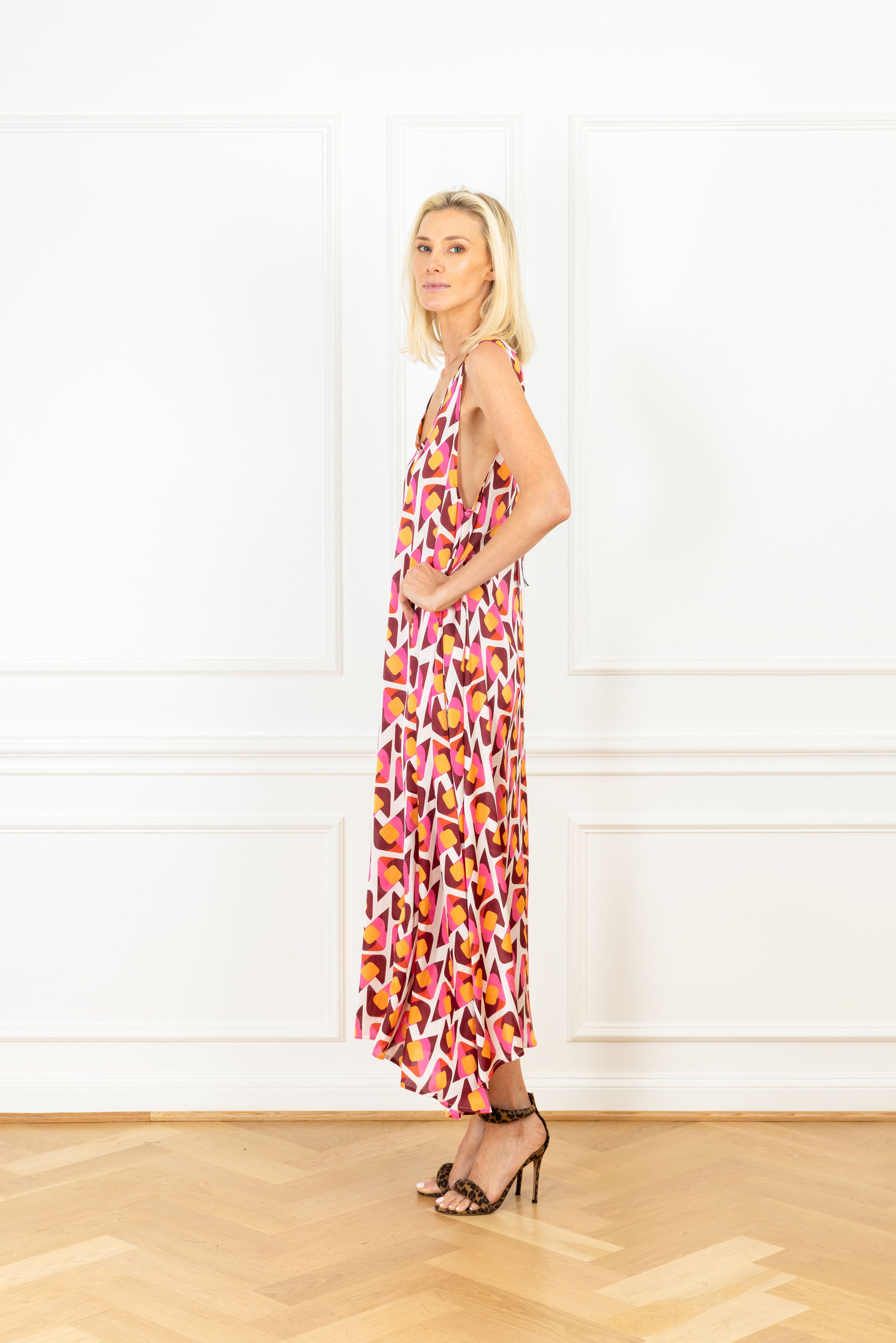 slip into this swingy tank silhouette for your next festivity. this dress features a geometric design in hues of sangria & coral on a soft satin fabrication.