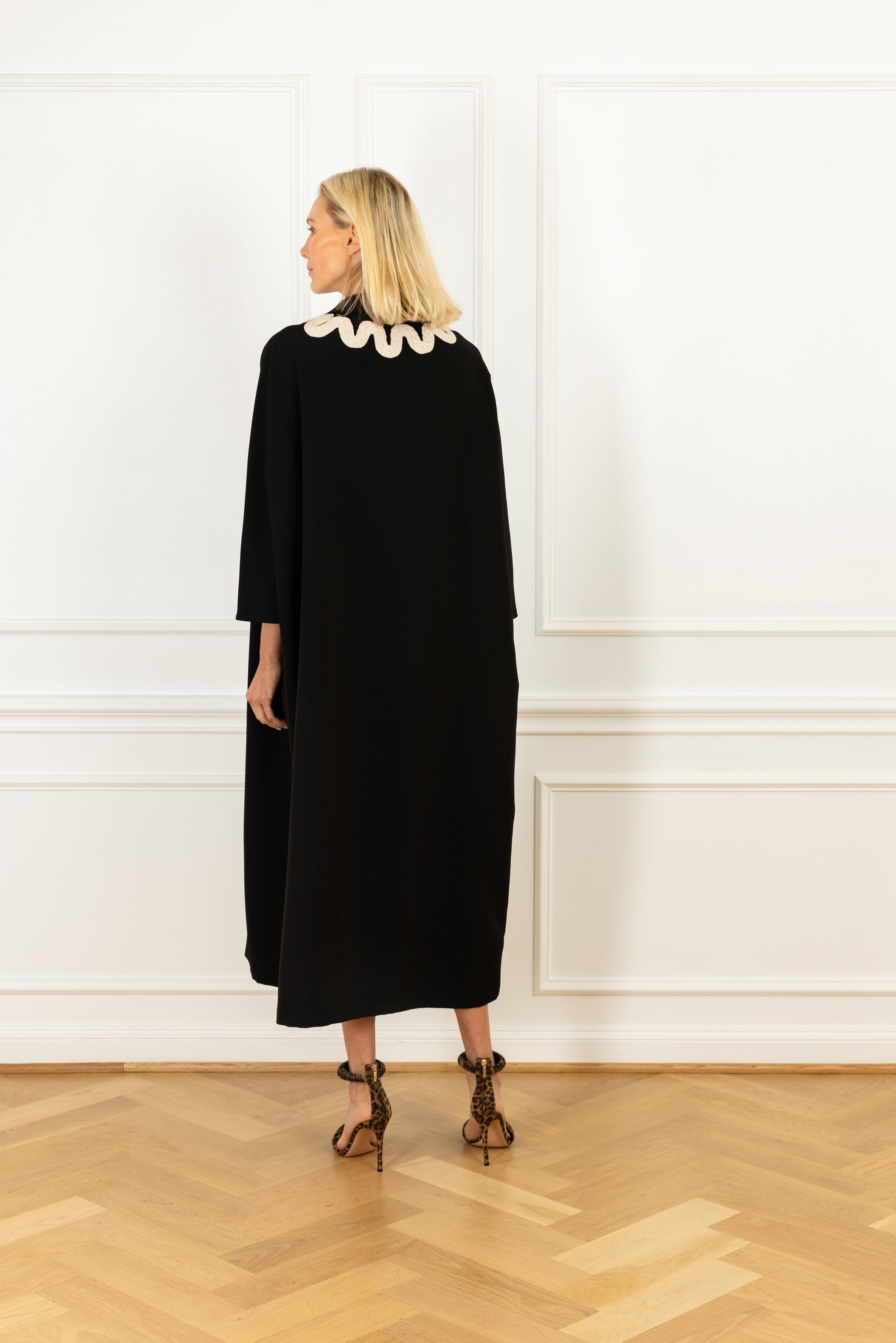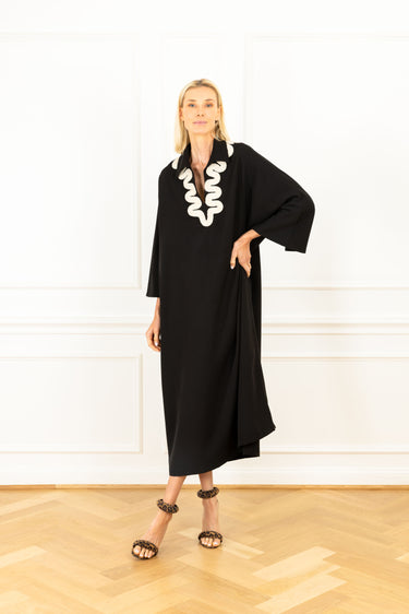 throw on our pullover silhouette in for your daily errands or your next dinner date. this playful dress is designed for everyday wear and features a subtle v-neck, a classic polo collar, and an airy sweeping skirt for a flirty finish. this dress features a twisted rope trim around the neckline with subtle beading on a solid black base fabrication.