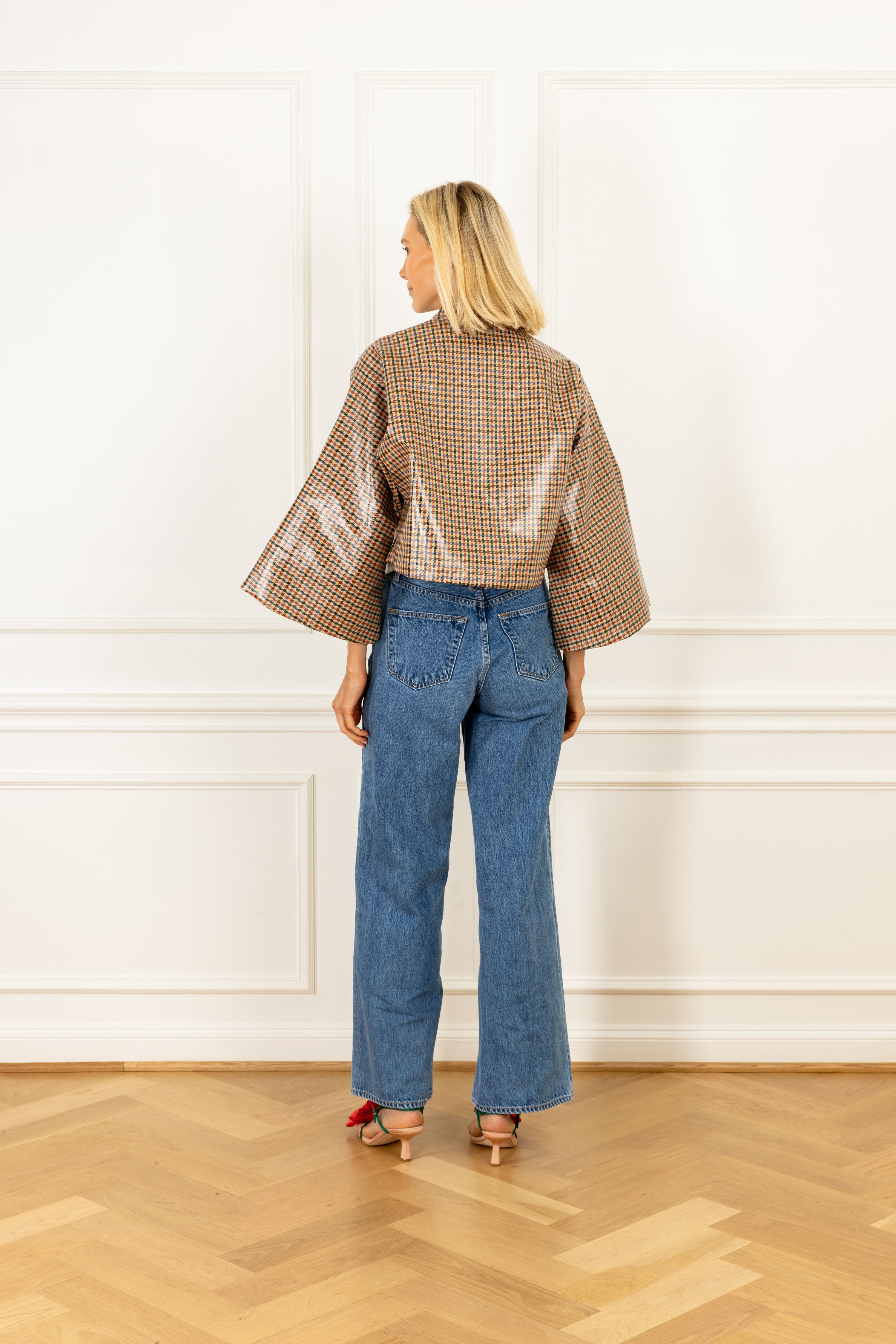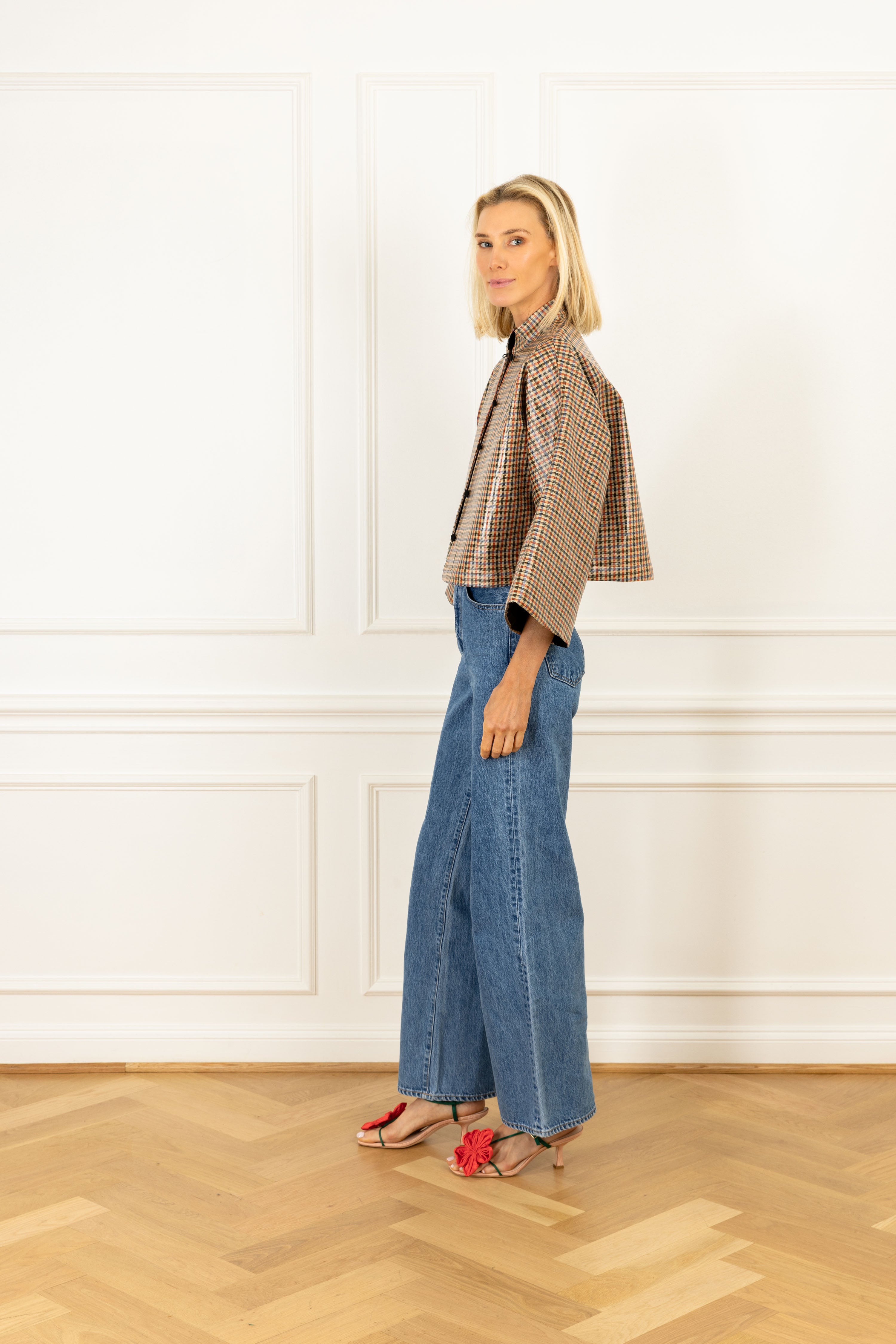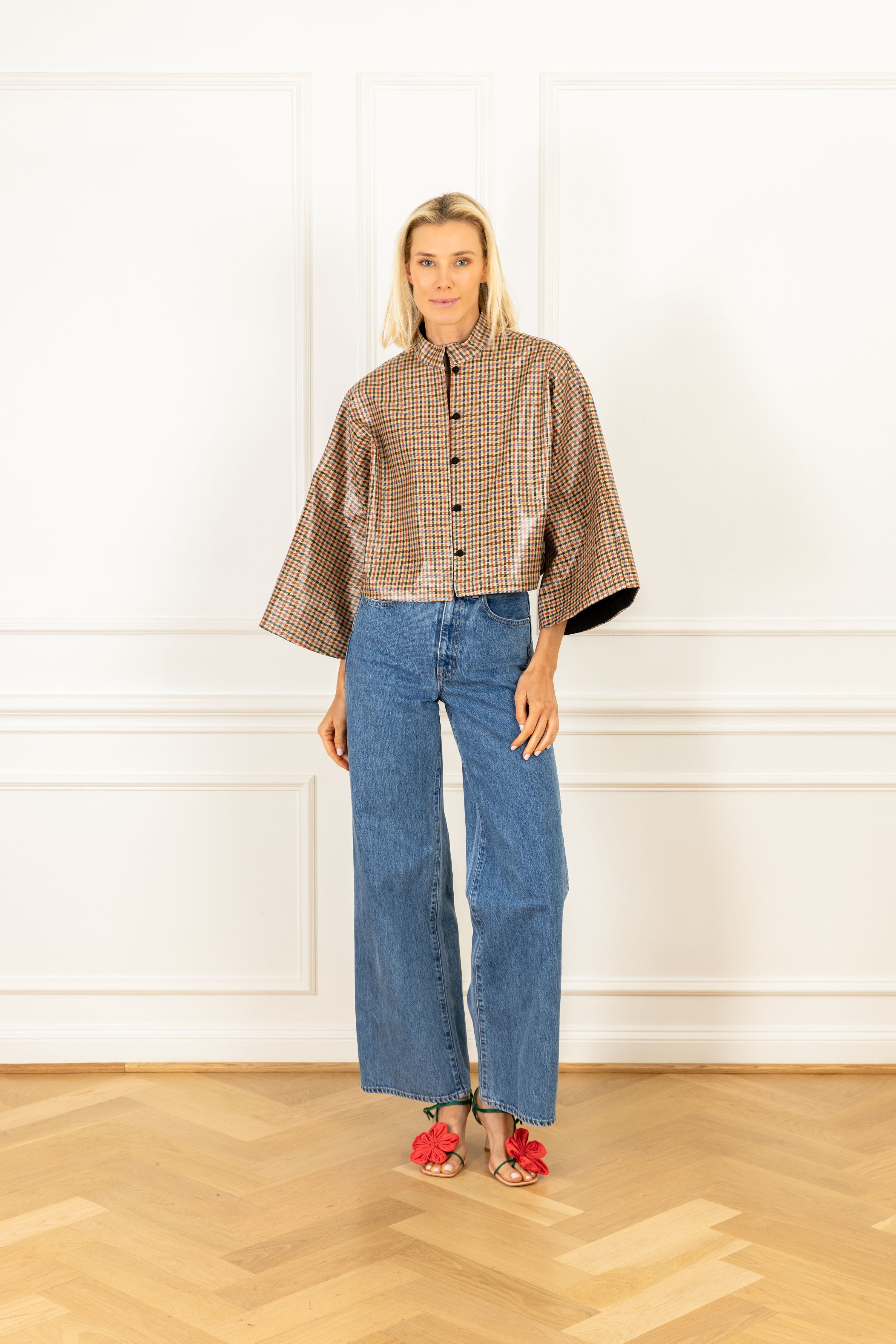 our caftan coat - cropped! the same style you know and love offered in a chic short jacket that can be worn open or closed. this jacket features a small-scale plaid pattern in a waxed canvas fabrication that provides a water-resistant finish.