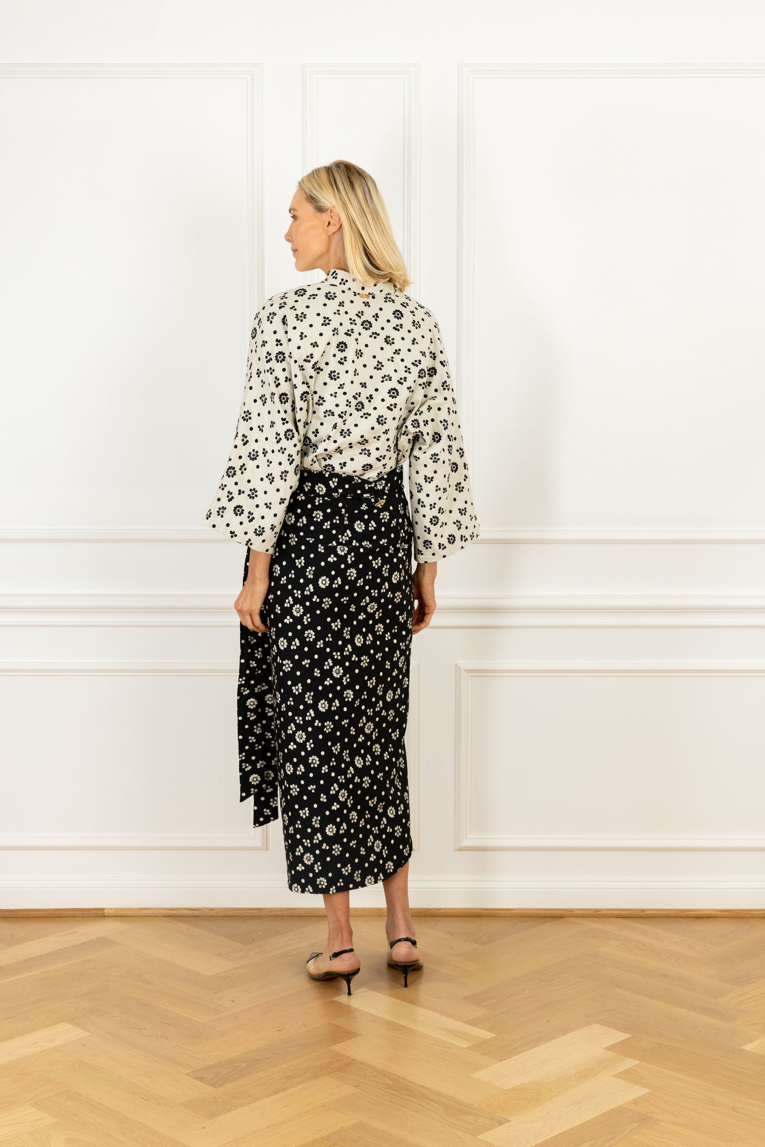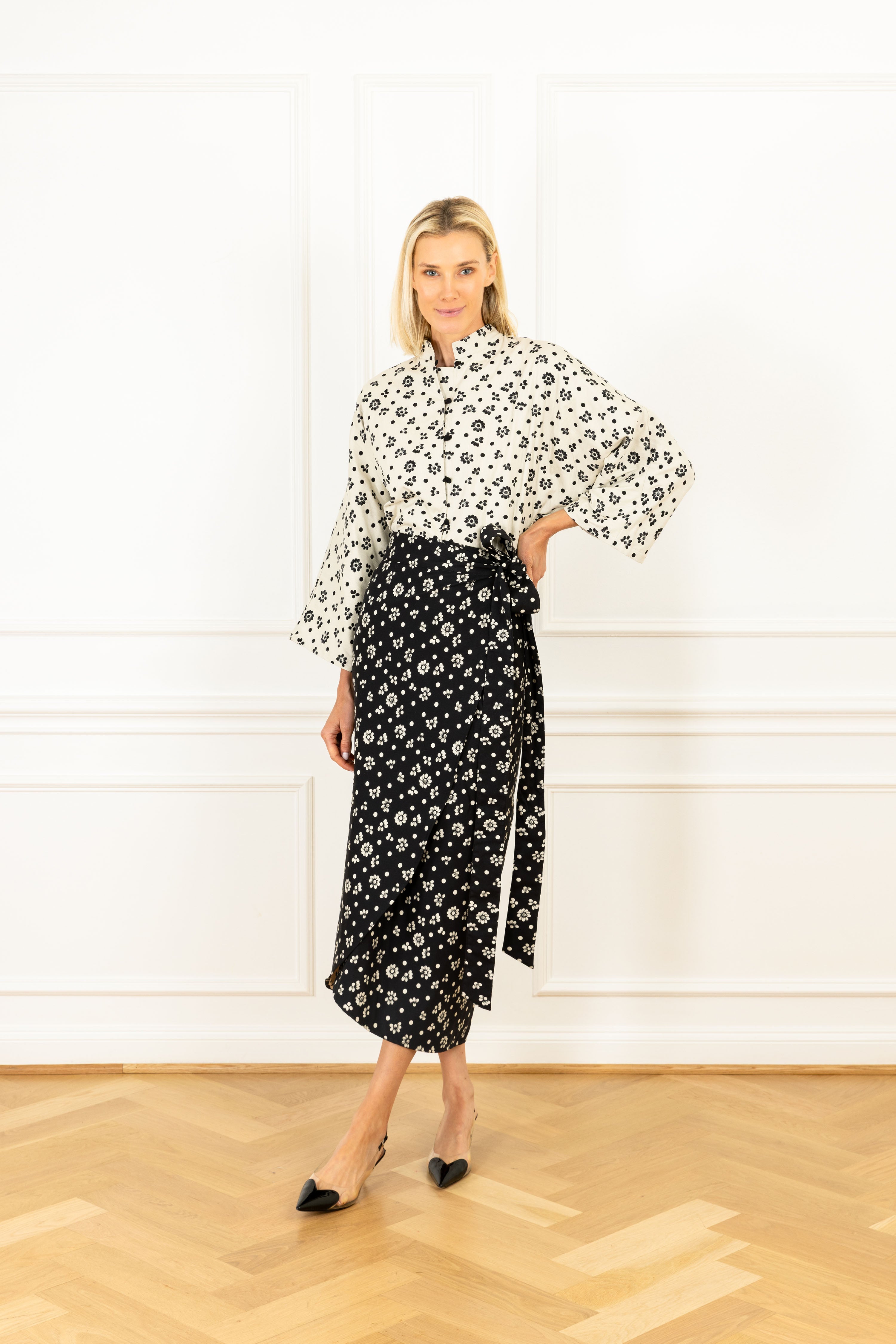 tie on this classic silhouette for an instantly elevated look. this skirt features a playful design of white polka dots that stand alone and form floral variations contrasting against a black backdrop.