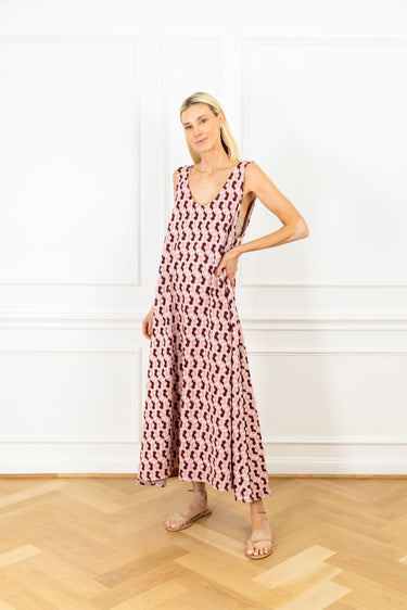 slip into this swingy tank silhouette for your next festivity. this dress features a repeating grid of plum and blush mod florals divided into contrasting halves.