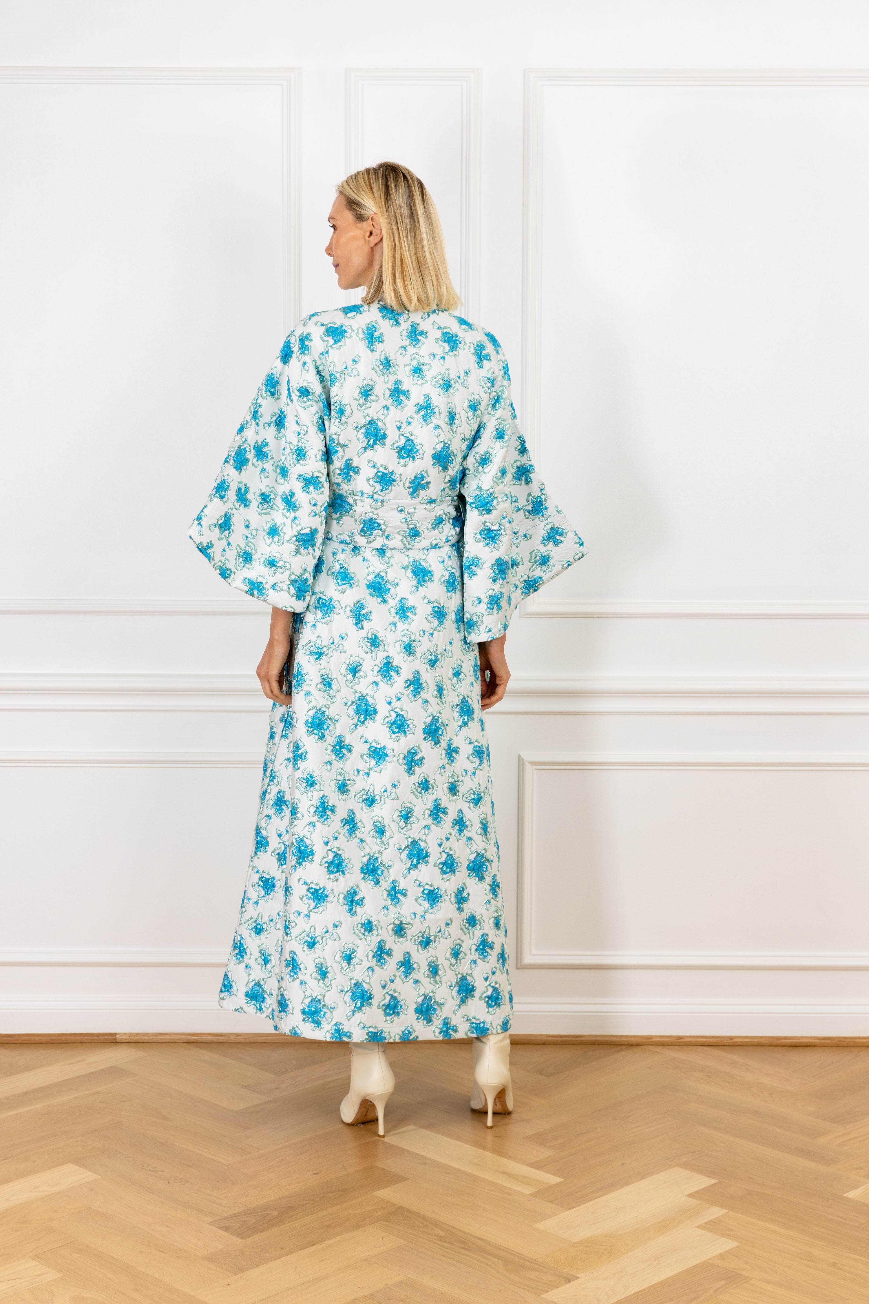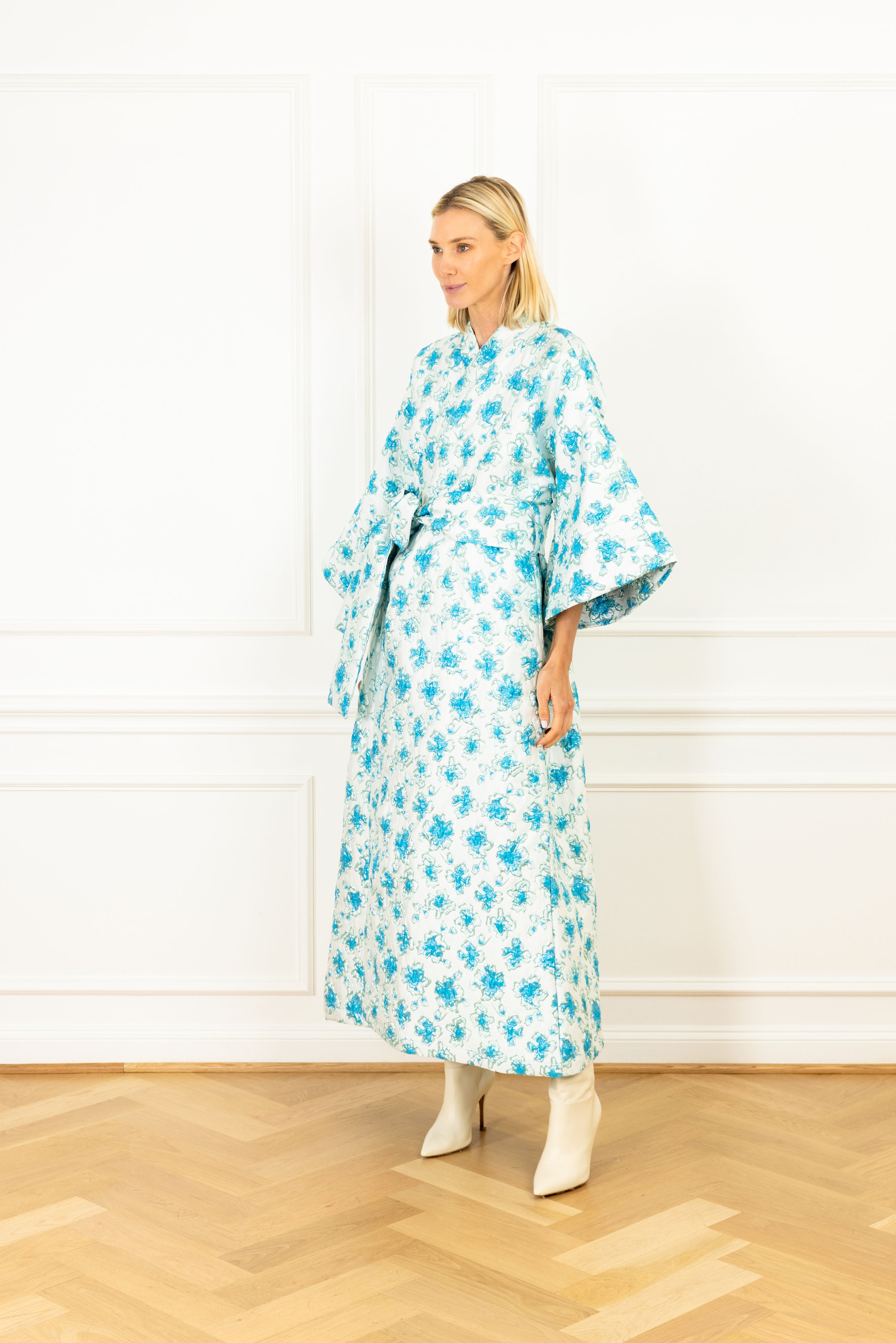 tie on this classic silhouette designed with an effortless flowy feel. this handcrafted piece has an easy drape, and evokes the label's vintage-inspired aesthetic. this wrap features evenly-spaced, stylized florals in metallic blues on a raised brocade fabrication.