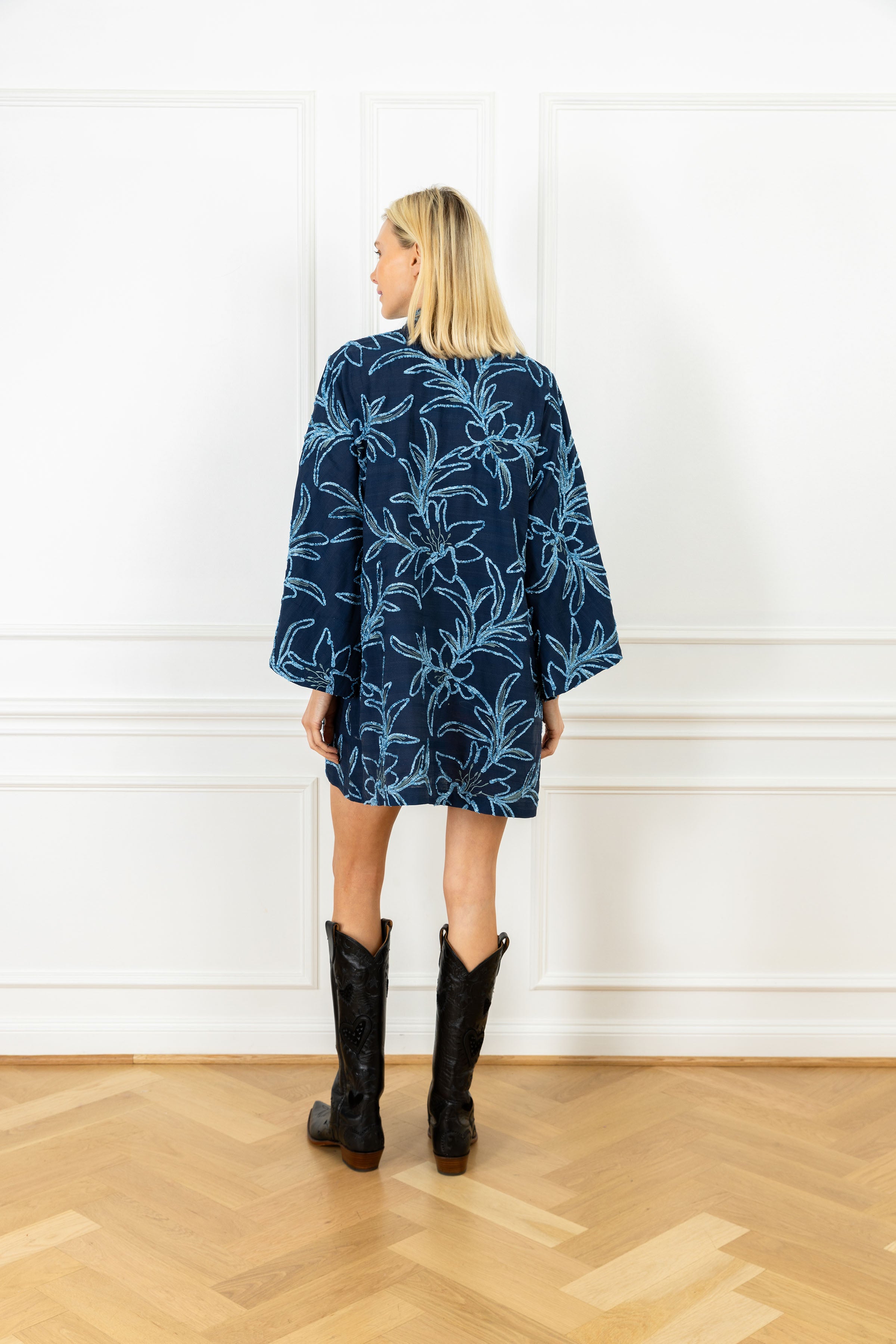 slip on our signature caftan silhouette for an effortless look that feels refined. this caftan features a lightweight navy base, brought to life by chenille floral embroidery that adds subtle shimmer.