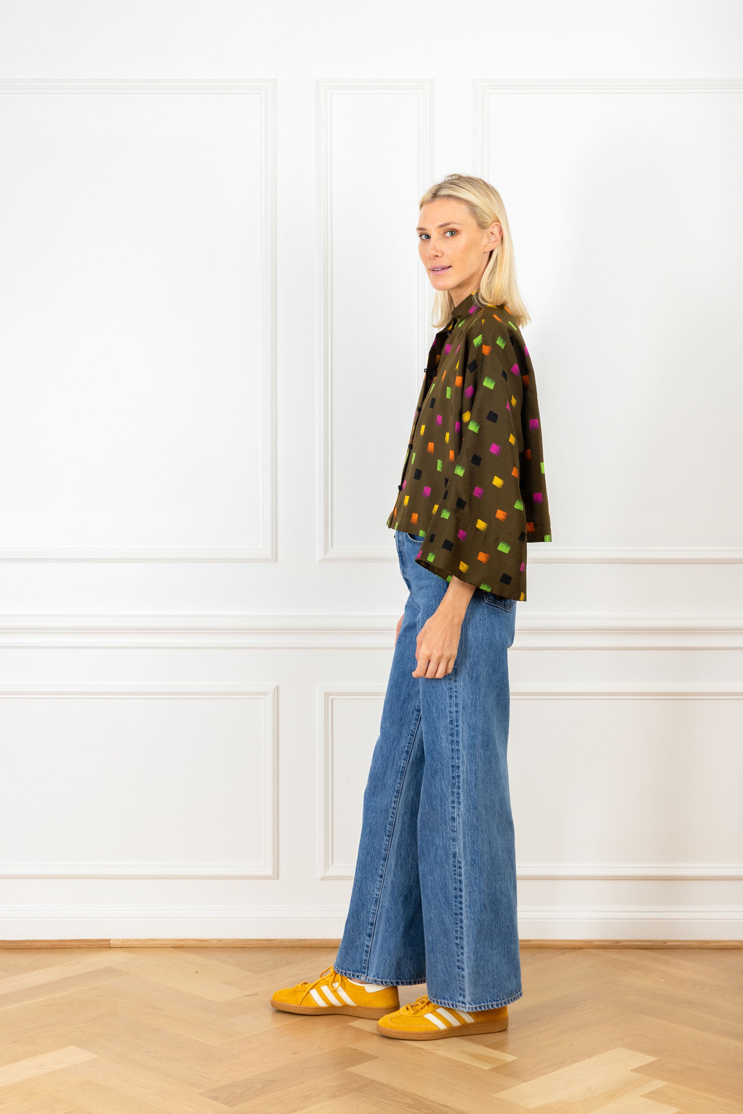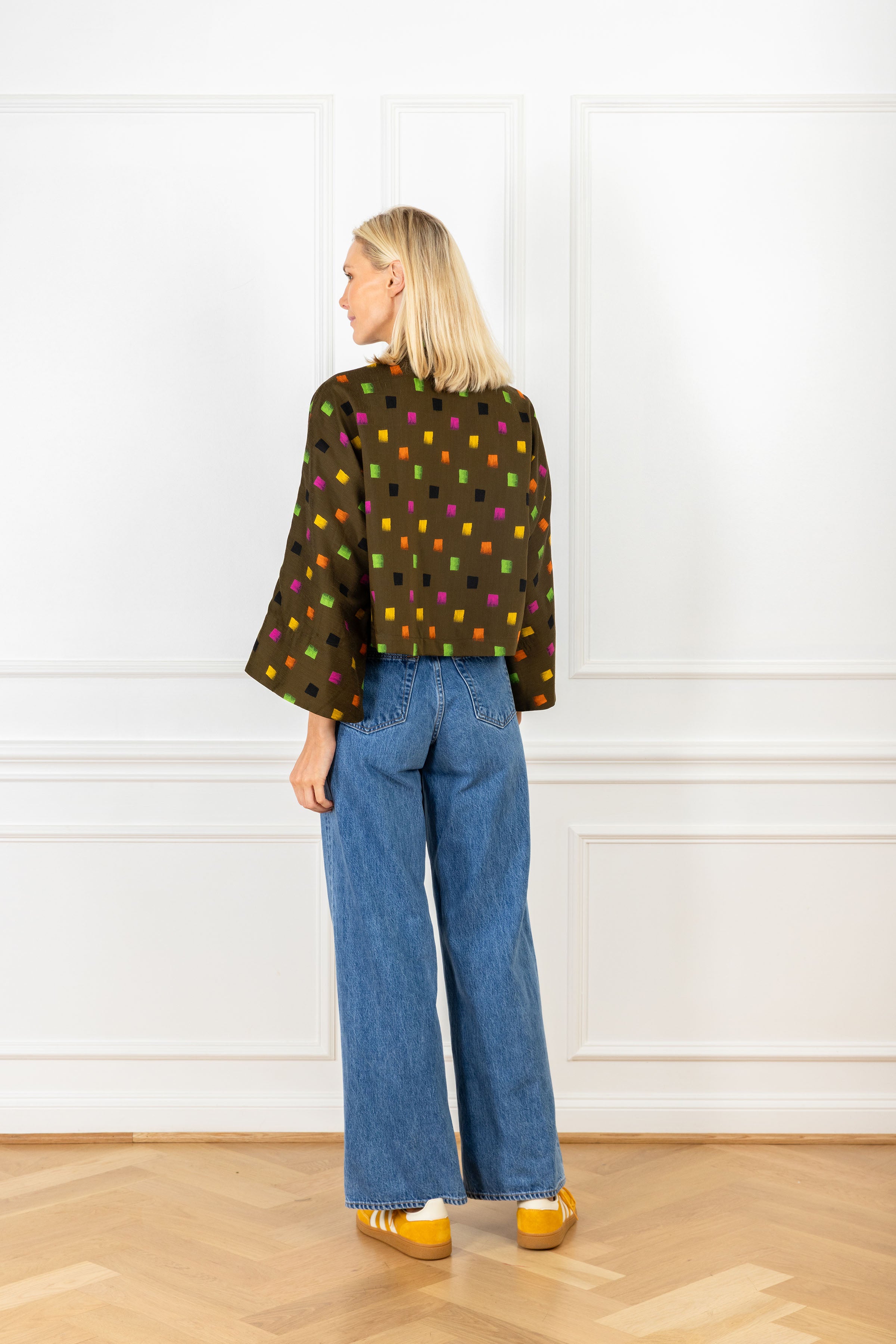 our caftan coat - cropped! the same style you know and love is now offered in a chic short jacket that can be worn open or closed. this jacket features a playful geometric design of uneven squares in multicolors against a deep olive backdrop.