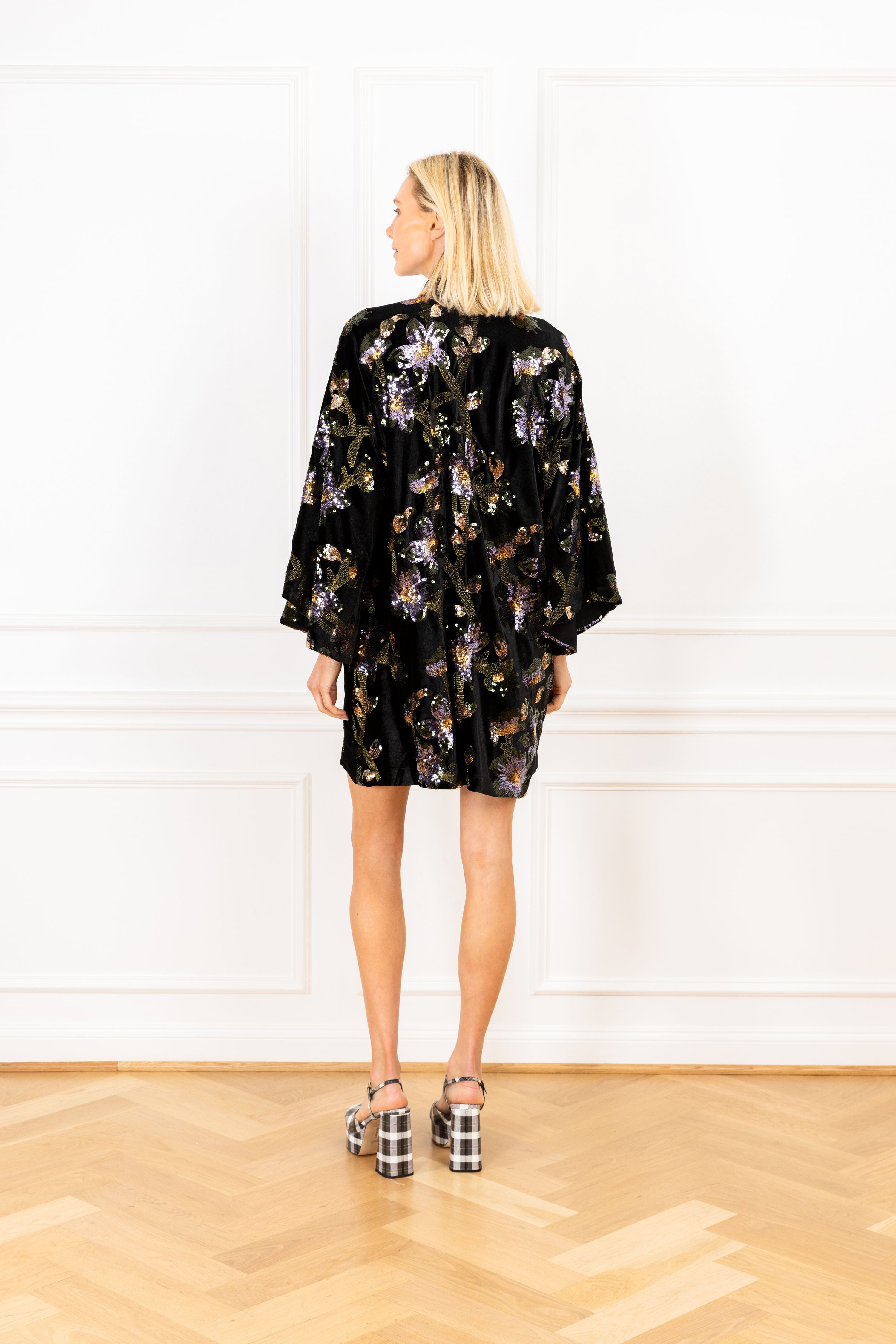 slip on our signature caftan silhouette for an effortless look that feels refined. this caftan features a black velvet base fabrication embroidered with floral & leaf motifs and embellished with sequins.