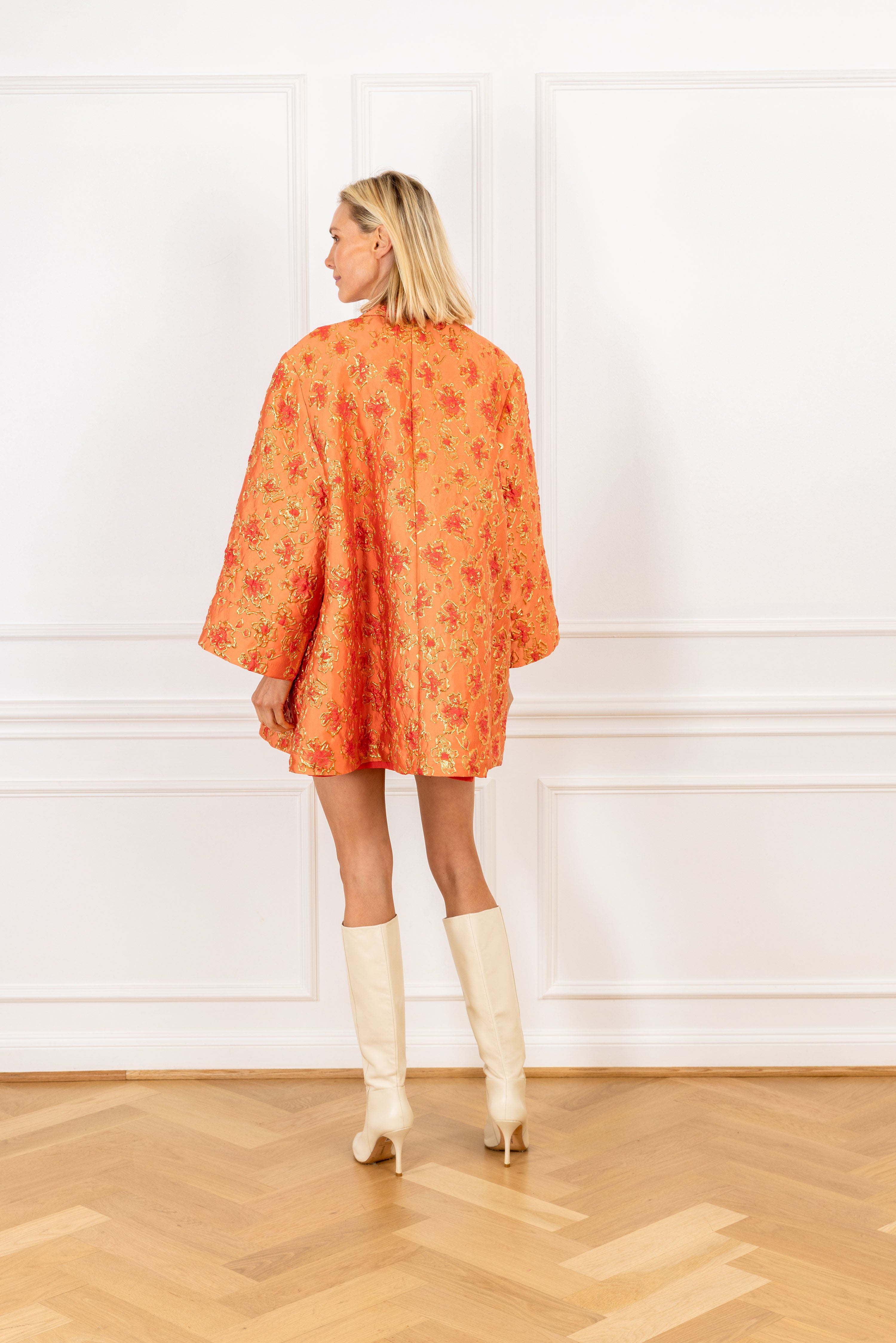 our dress coat is now offered in a mini! this short dress coat showcases a voluminous fit and can be worn open or closed. this timeless piece is a wardrobe staple and features an orange & gold color scheme of raised floral motifs on a structured brocade fabrication.
