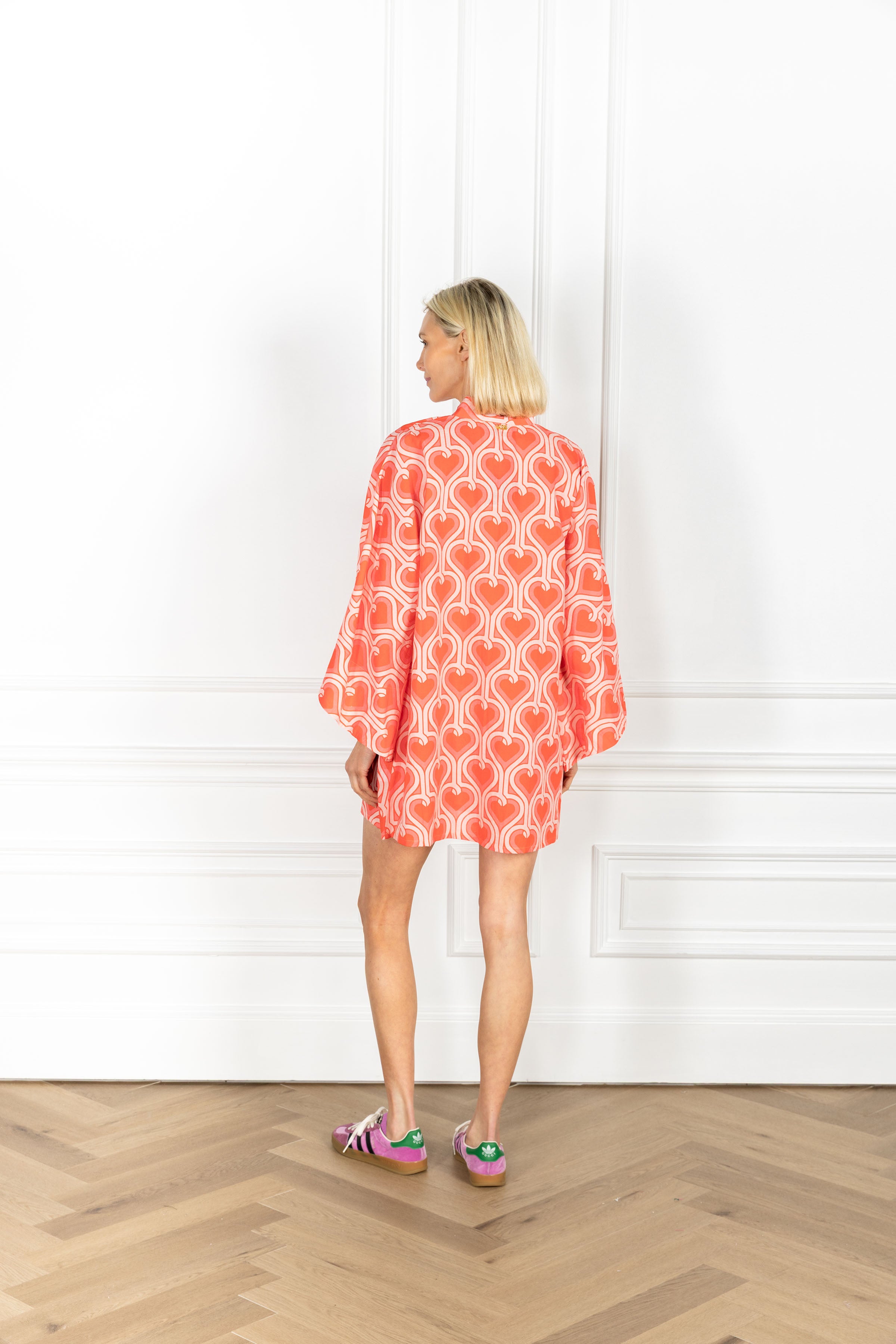 slip on our signature caftan silhouette for an effortless look that feels refined. this caftan features a repeating heart motif arranged in a geometric layout, defined by gradual shifts from red to pink.