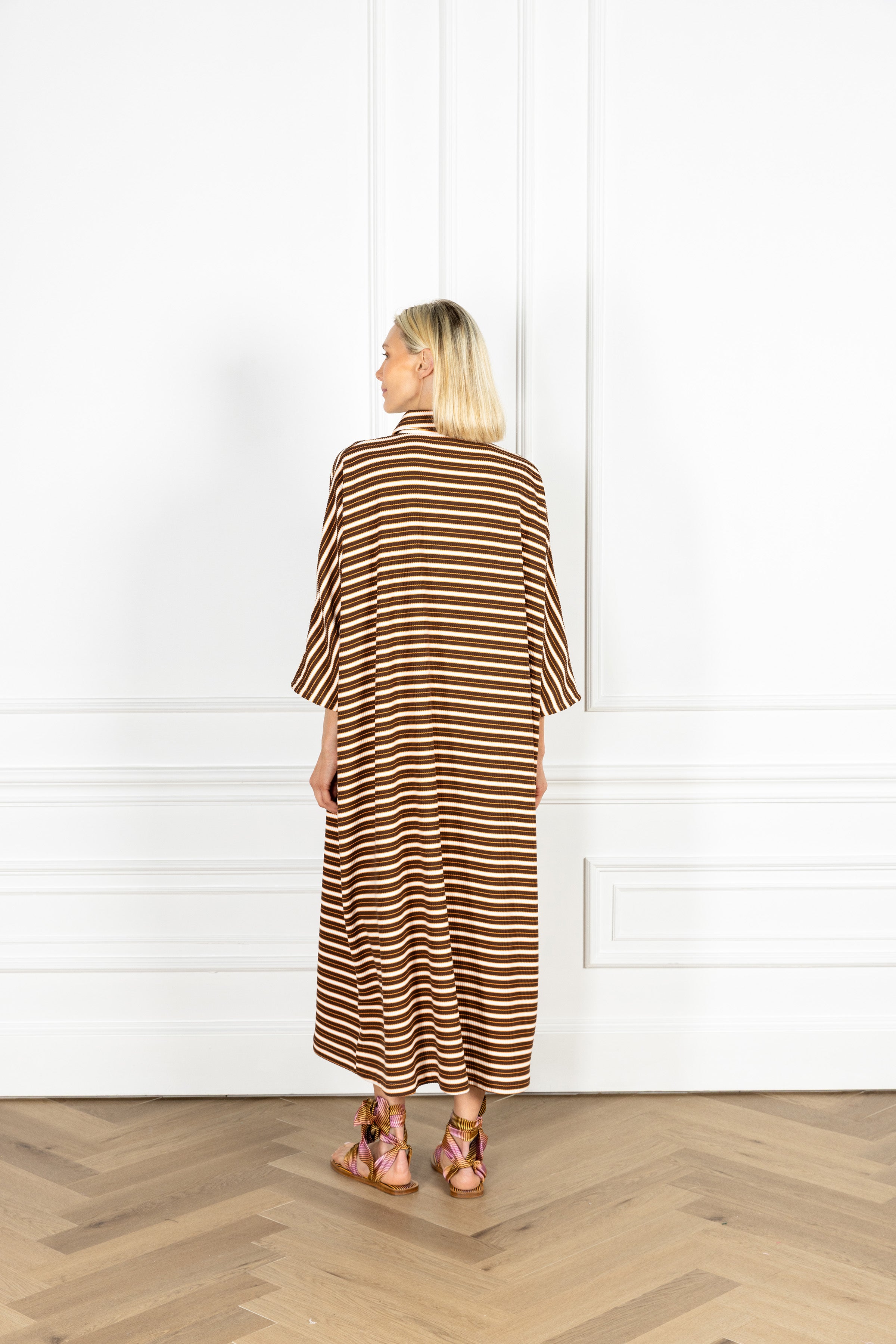 throw on our pullover silhouette for your daily errands or your next dinner date. this playful dress is designed for everyday wear and features a subtle v-neck, a classic polo collar, and an airy sweeping skirt for a flirty finish. this dress is crafted in a ribbed knit and features playful horizontal stripes in rich mocha hues, finished with rope palm tree embellishments at the bust.