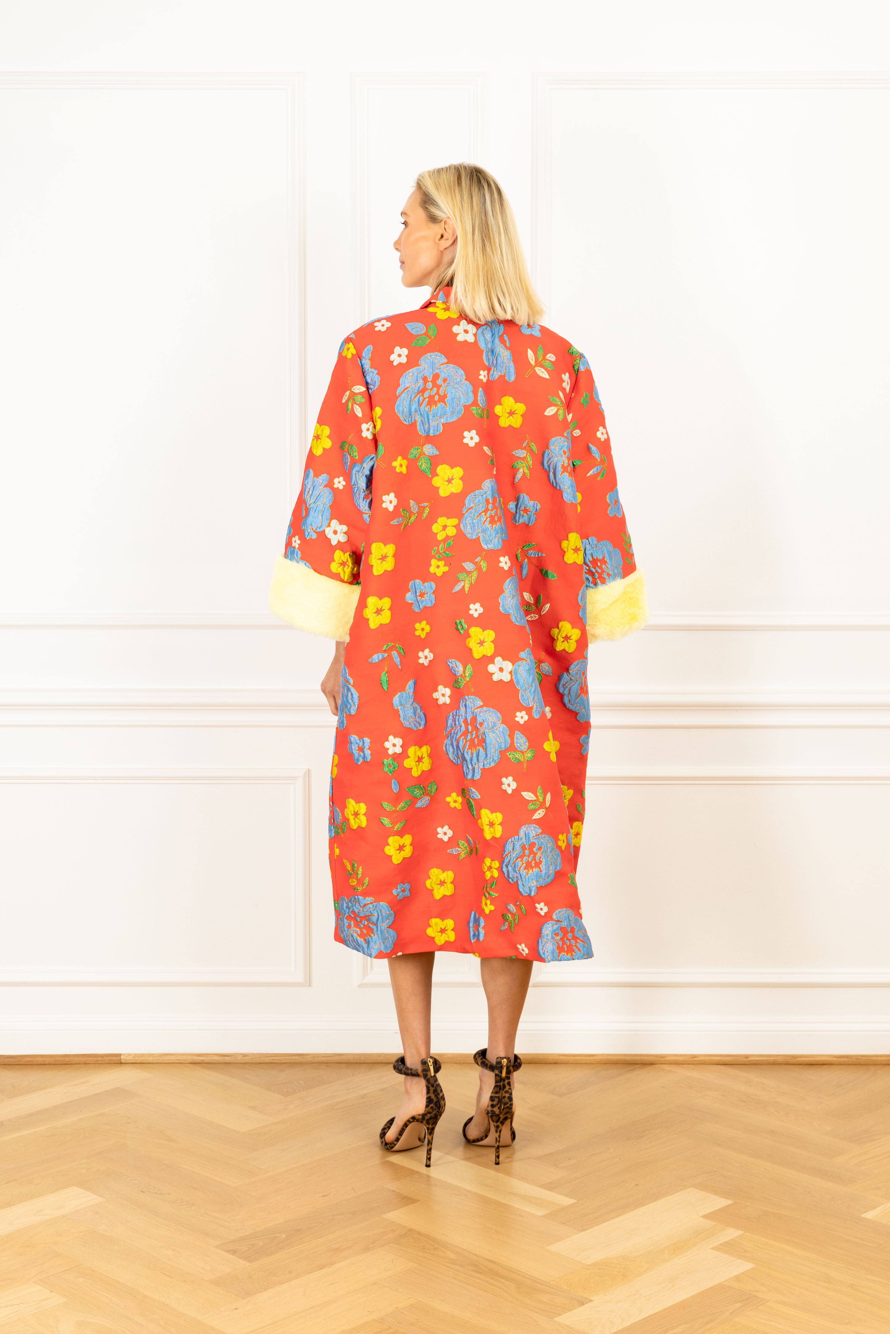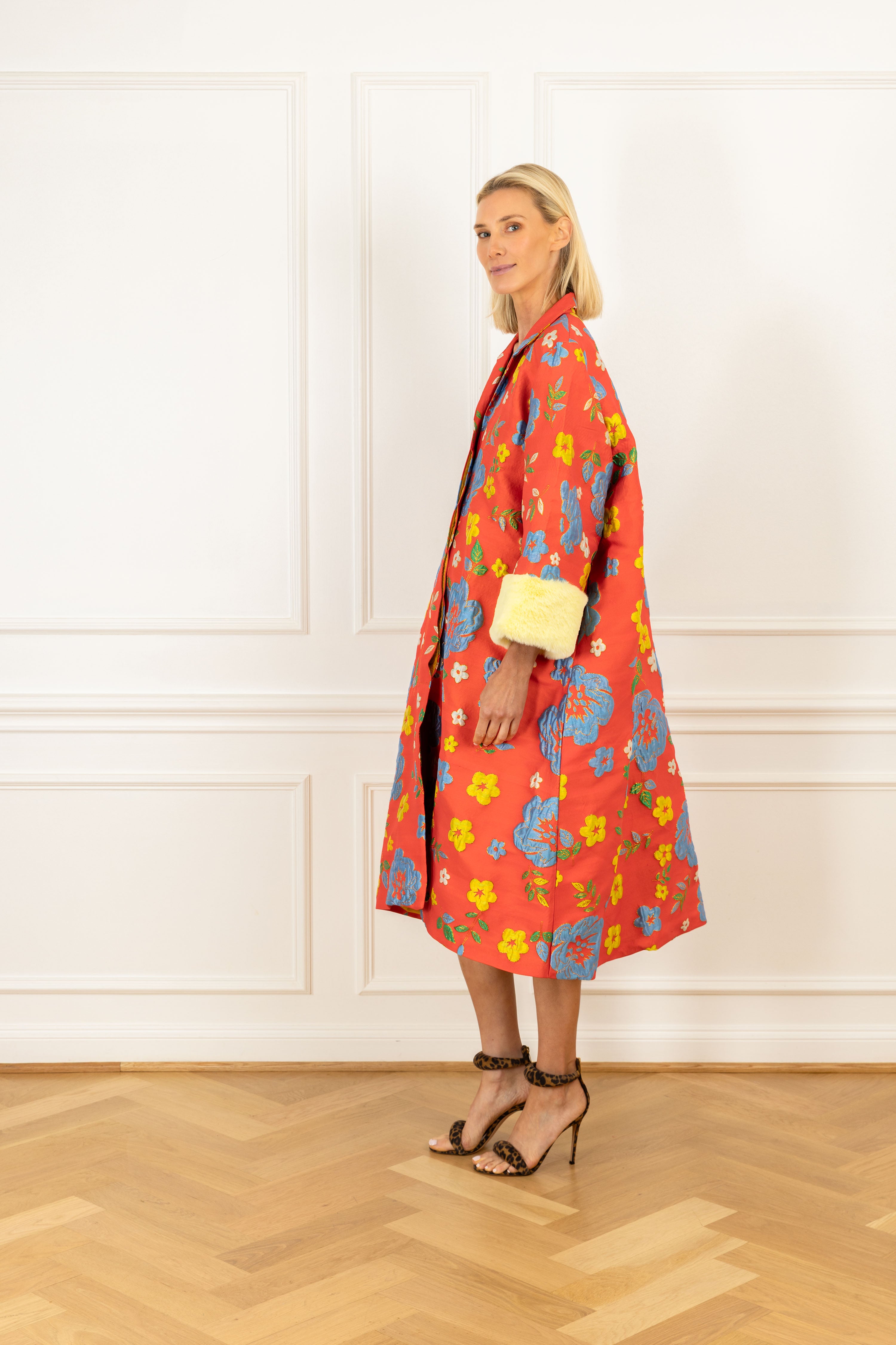 this fully-lined dress coat features a scarlet red brocade fabrication with yellow fur trim and raised floral & leaf motifs. this handcrafted piece showcases a voluminous fit, and is the perfect special occasion piece to wear from fall into the holiday season.