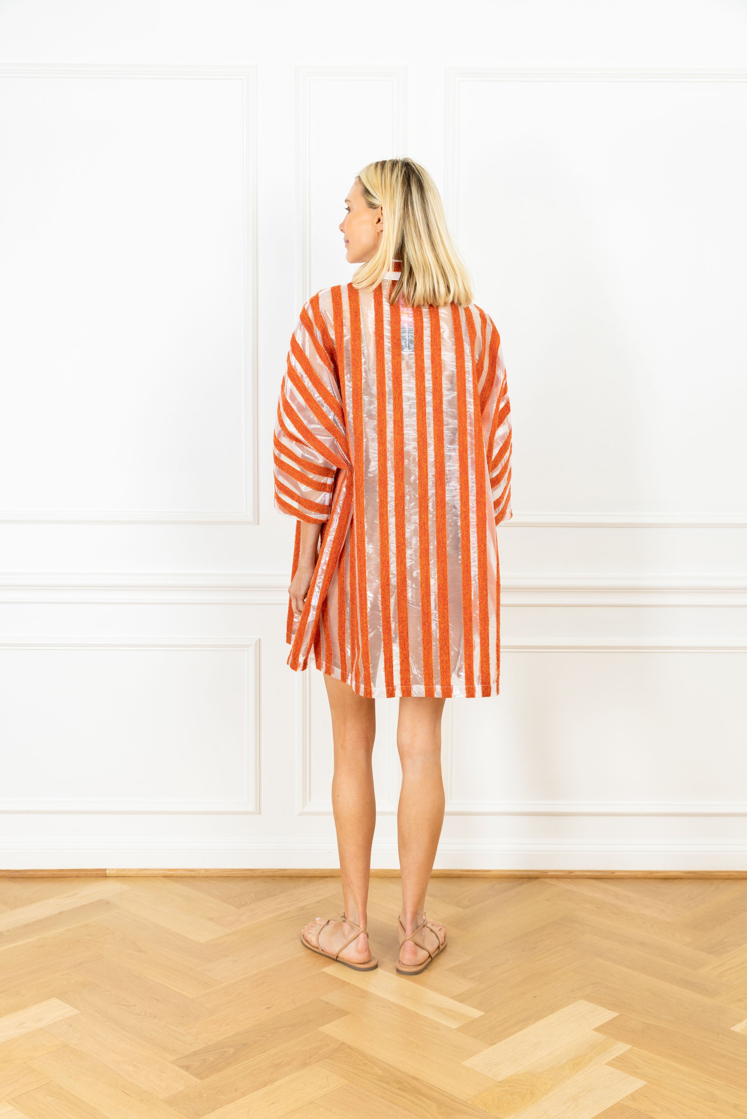 your favorite pullover silhouette is now offered in a mini! this playful dress is designed for everyday wear and features a subtle v-neck, a classic polo collar, and an airy sweeping skirt for a flirty finish. this dress features a sheer organza base accented by terracotta vertical panels for added depth.