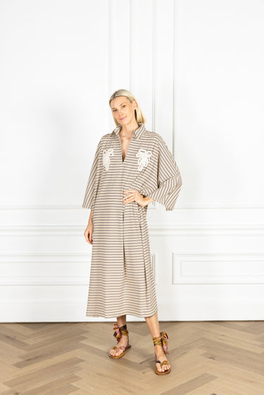 throw on our pullover silhouette for your daily errands or your next dinner date. this playful dress is designed for everyday wear and features a subtle v-neck, a classic polo collar, and an airy sweeping skirt for a flirty finish. this dress is crafted in a ribbed knit and features playful horizontal stripes in neutral tones, finished with rope palm tree embellishments at the bust.
