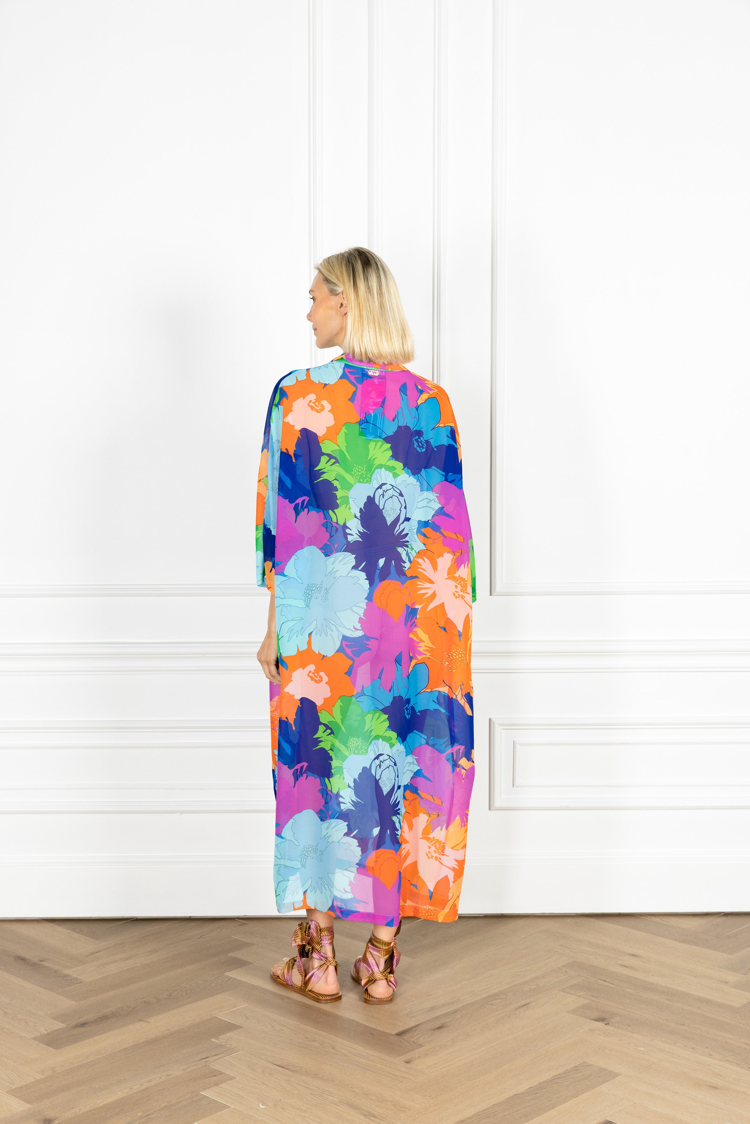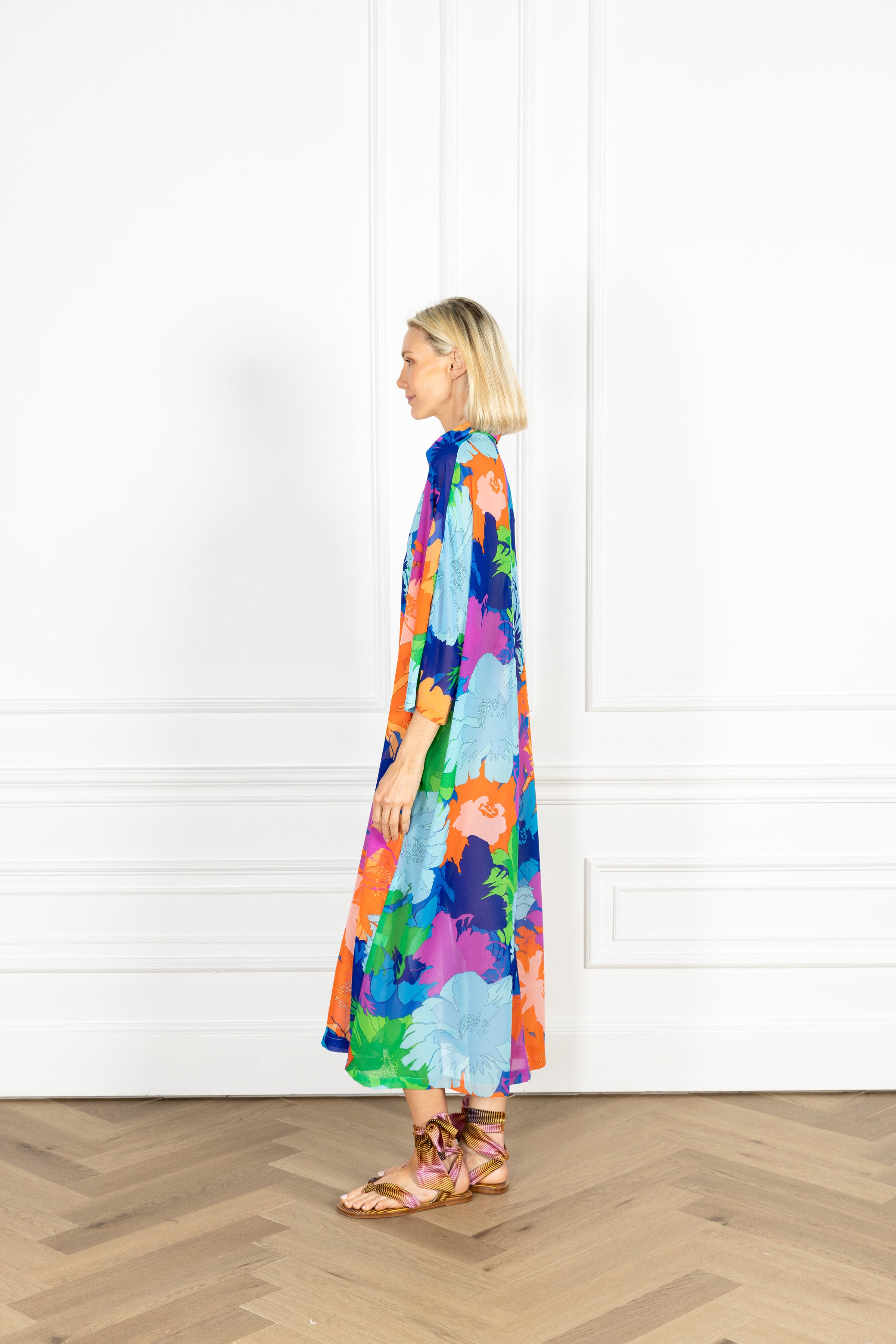 throw on our pullover silhouette for your daily errands or your next dinner date. this playful dress is designed for everyday wear and features a subtle v-neck, a classic polo collar, and an airy sweeping skirt for a flirty finish. this dress features large-scale tropical florals in saturated hues floating across a sheer, airy fabrication.