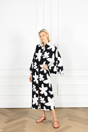this caftan is crafted from 100% cotton and features bold organic star shapes in stark white contrasted by a deep black backdrop. you have the option to wear open or fully buttoned, this versatile style is a twist on our signature caftan silhouette.