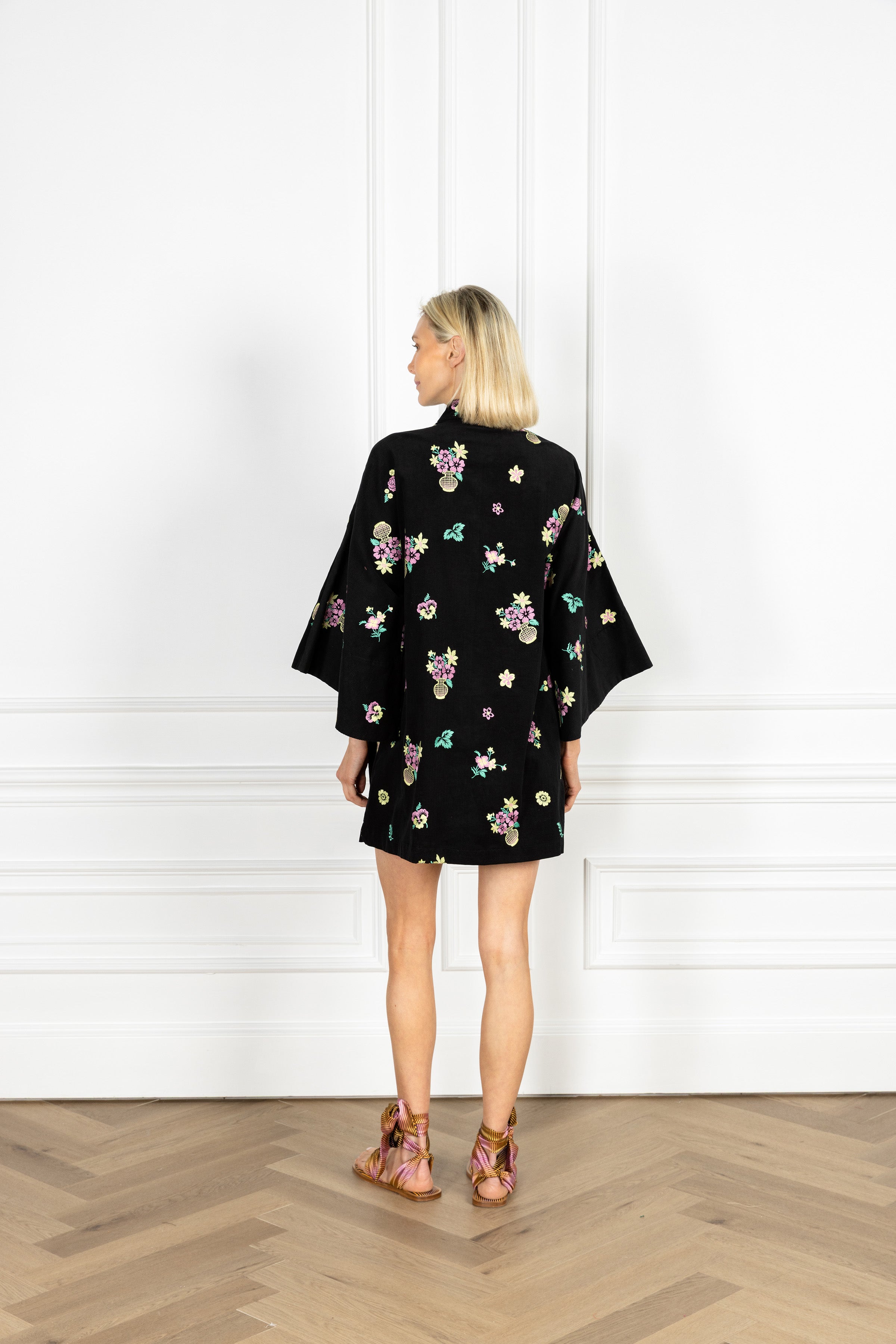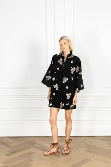 our open front caftan is now offered in a mini! with versatility at its core, this mini can be styled as a short dress or as a chic layer to any ensemble. this caftan features a rich black corduroy fabrication embroidered with bright, pastel-hued floral bouquets arranged in delicate crosshatch-detailed vases.