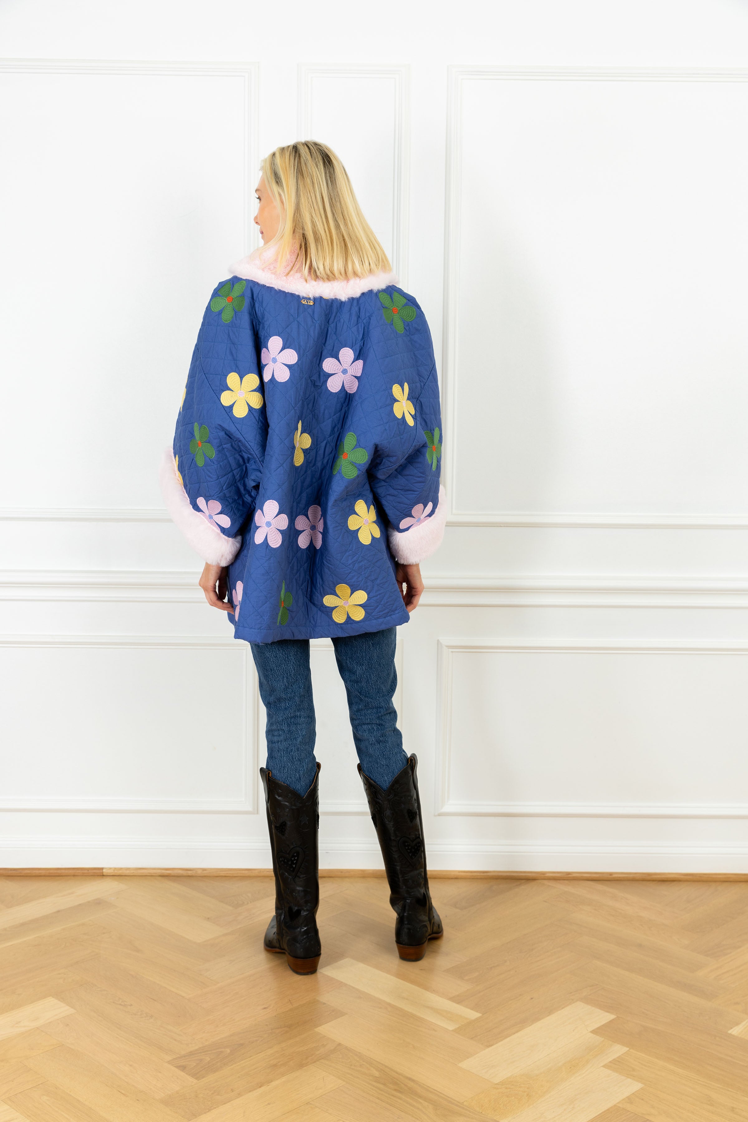 this duster features a quilted cotton fabrication adorned with large-scale floral embroidery and finished with contrasting fur-trimmed sleeves. this handcrafted piece is the perfect oversized garment for a chilly day, and is the epitome of luxury and comfort wrapped in one.