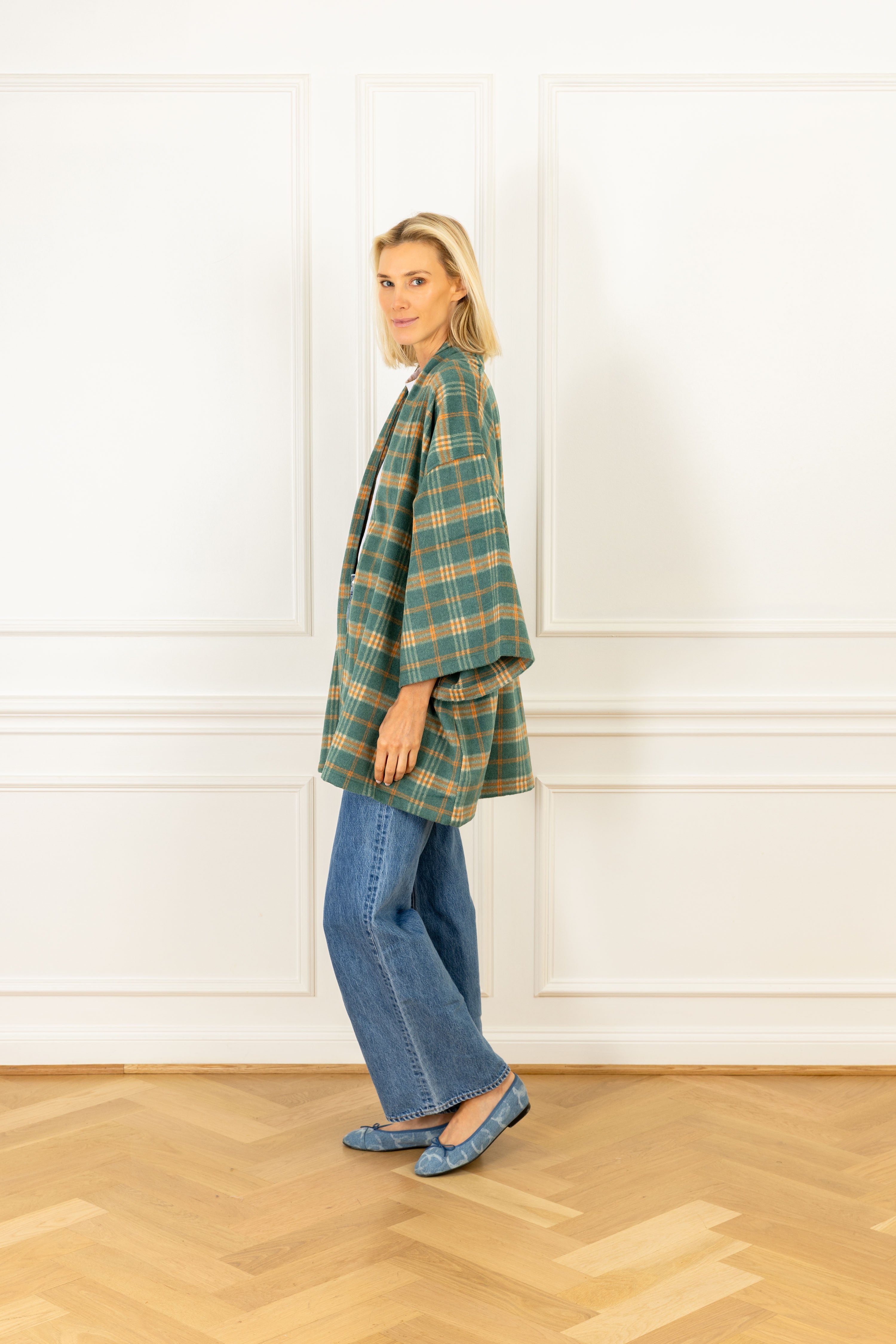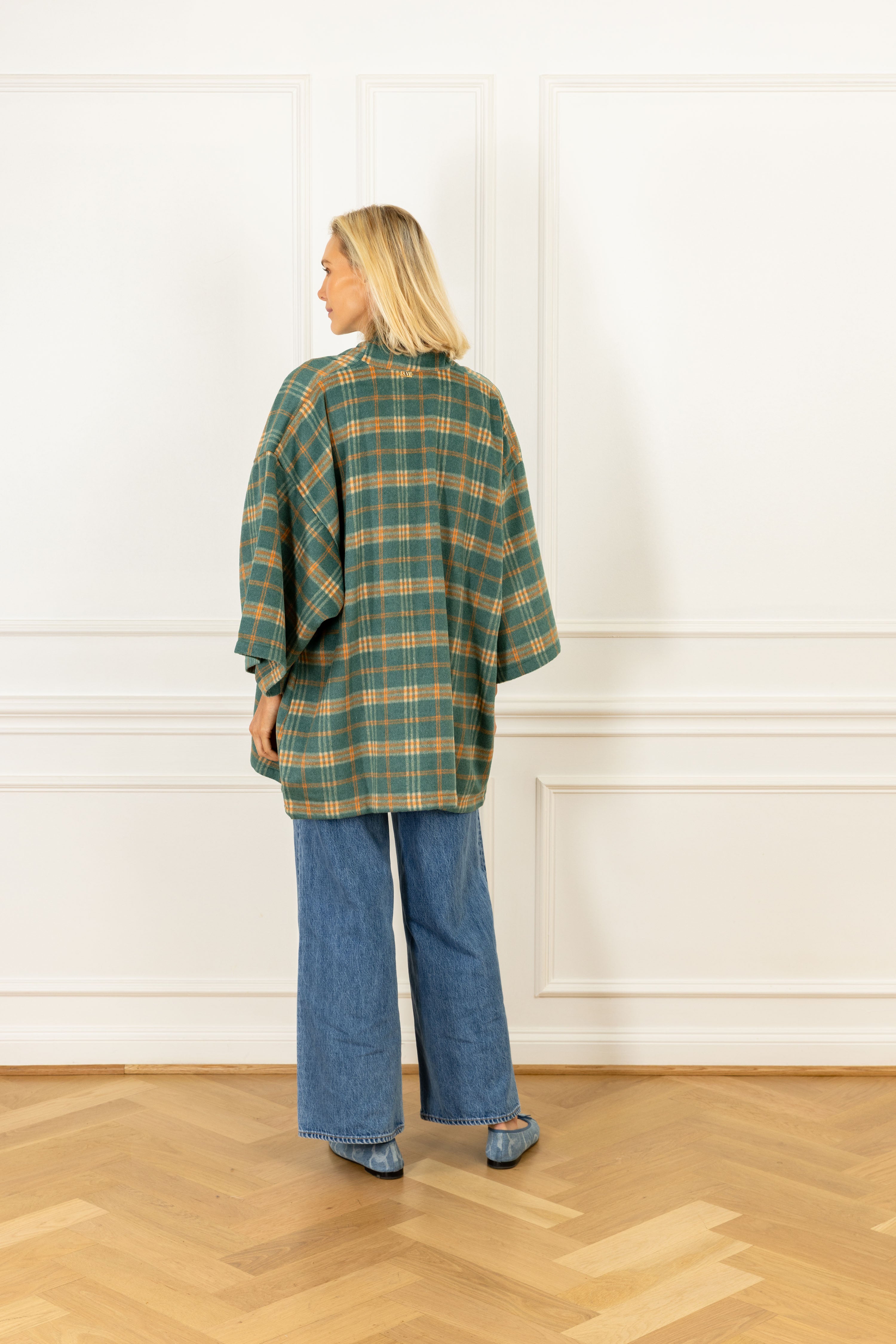 this duster features a tartan plaid pattern of intersecting teal & orange stripes on a soft, fuzzy fabrication. this handcrafted piece is the perfect oversized garment for a chilly day, and is the epitome of luxury and comfort wrapped in one.