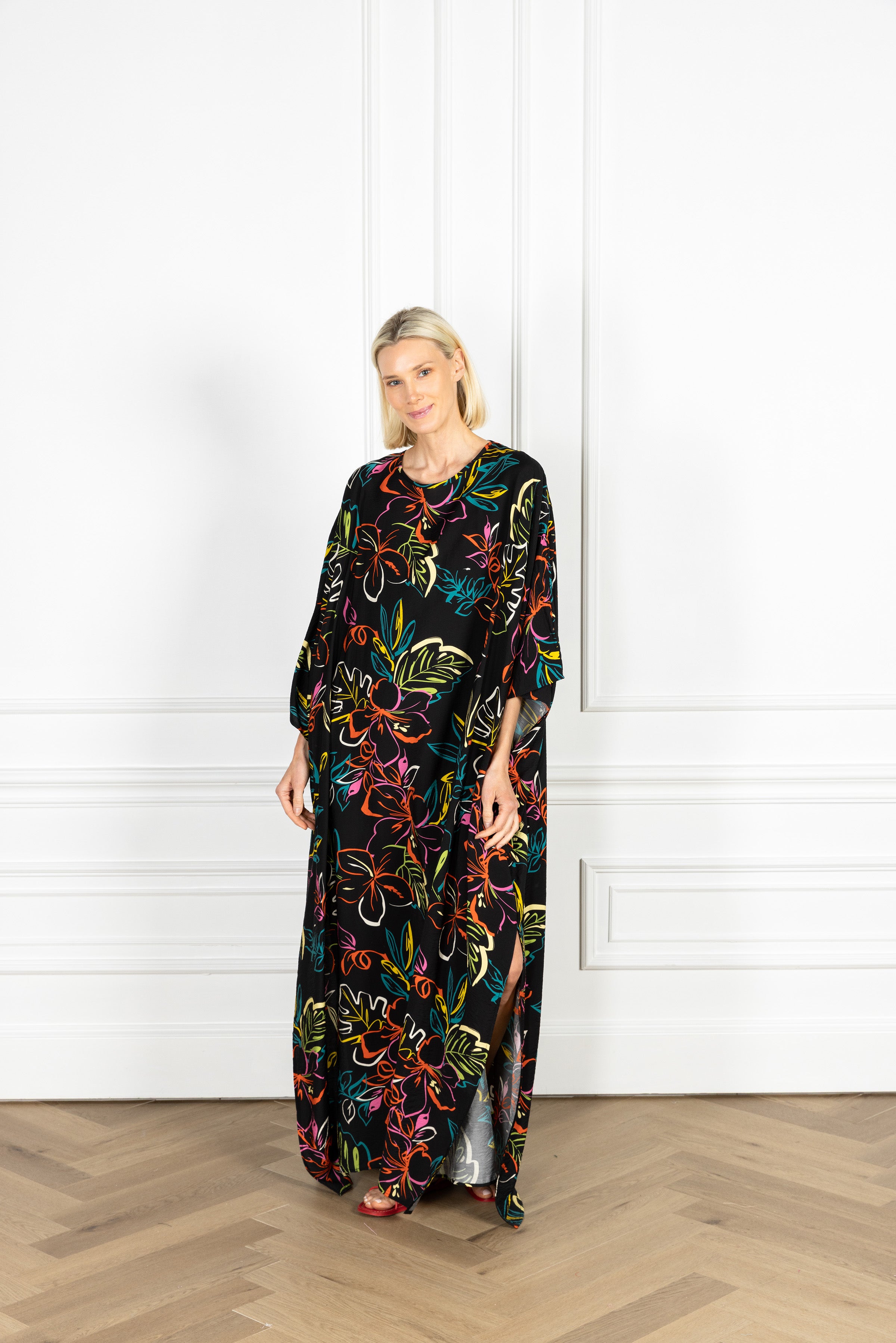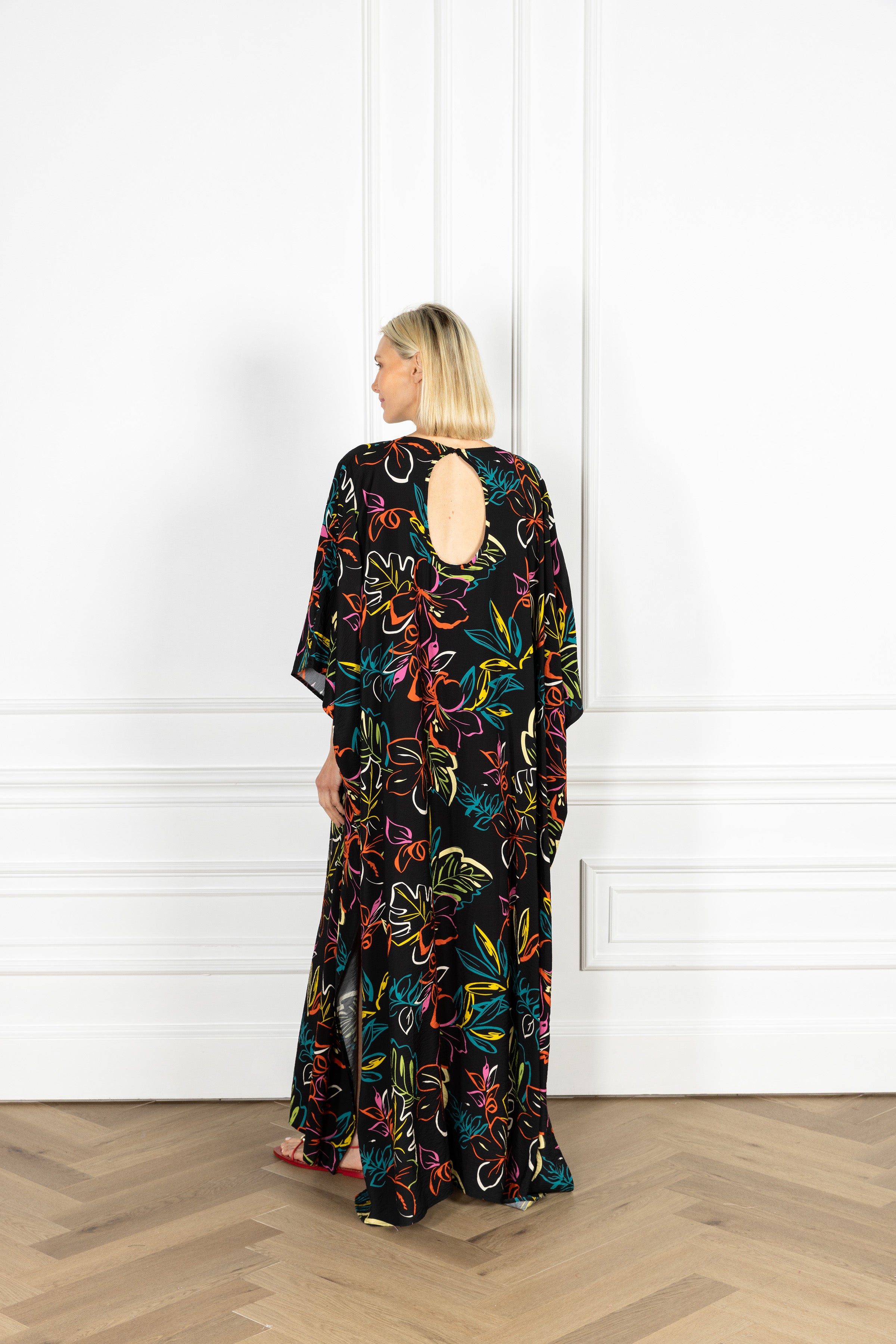 meet our keyhole caftan: this billowing silhouette cascades to the floor with a graceful flow. it presents generously cut dolman sleeves for dramatic effect, and a spacious keyhole detail for an unexpected element. this caftan features a large-scale botanical design traced in vibrant neon hues against a rich black base.