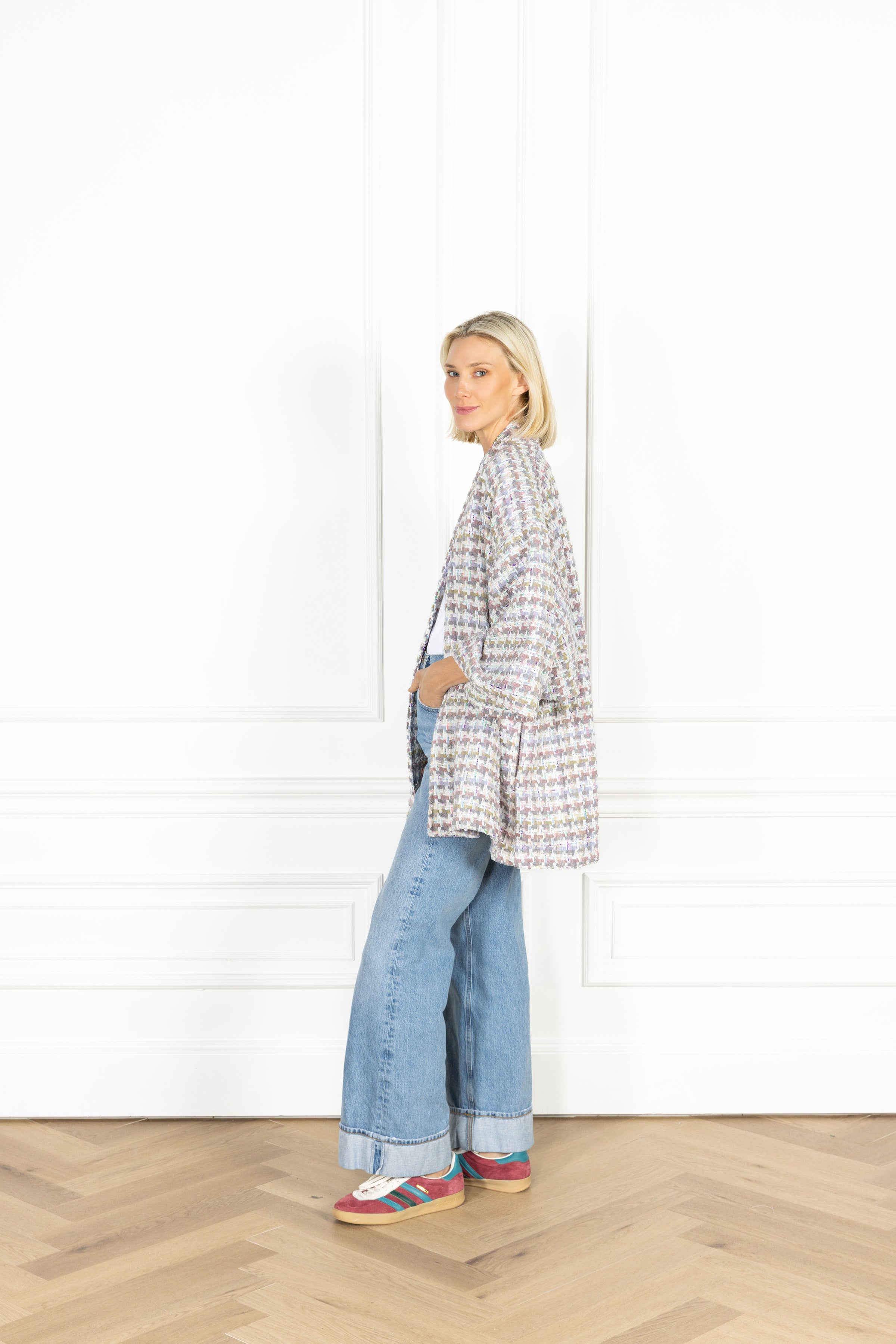 this duster is crafted in a richly textured tweed featuring a grid-like design in grey, white, and soft pastel hues. this handcrafted piece is the perfect oversized garment for a chilly day, and is the epitome of luxury and comfort wrapped in one.