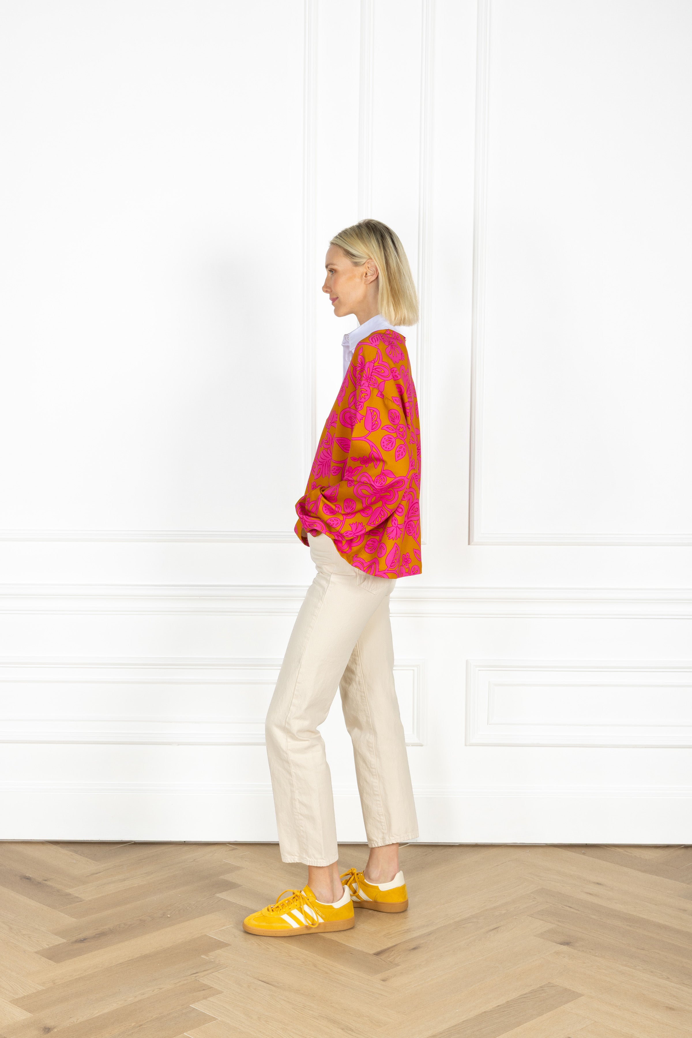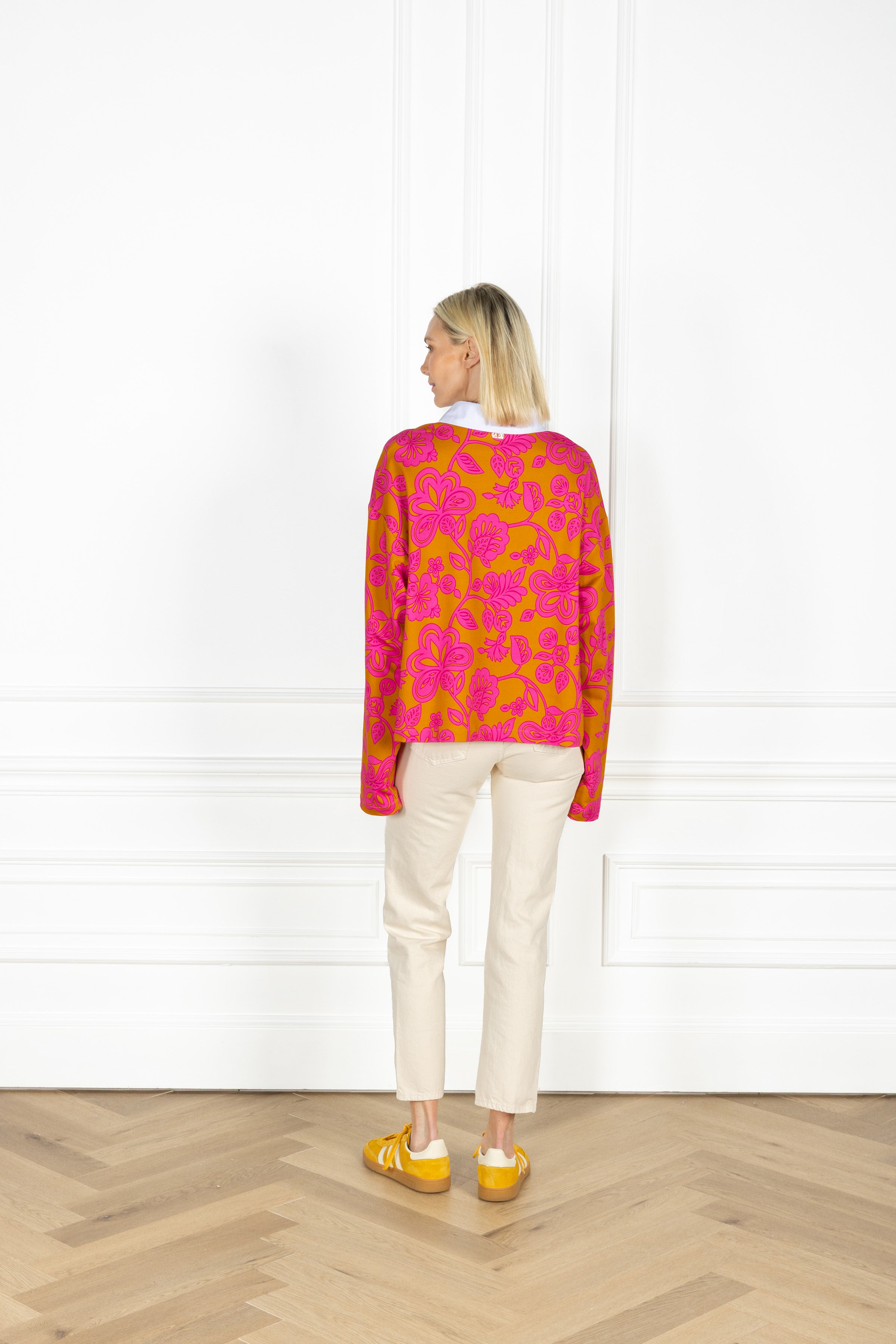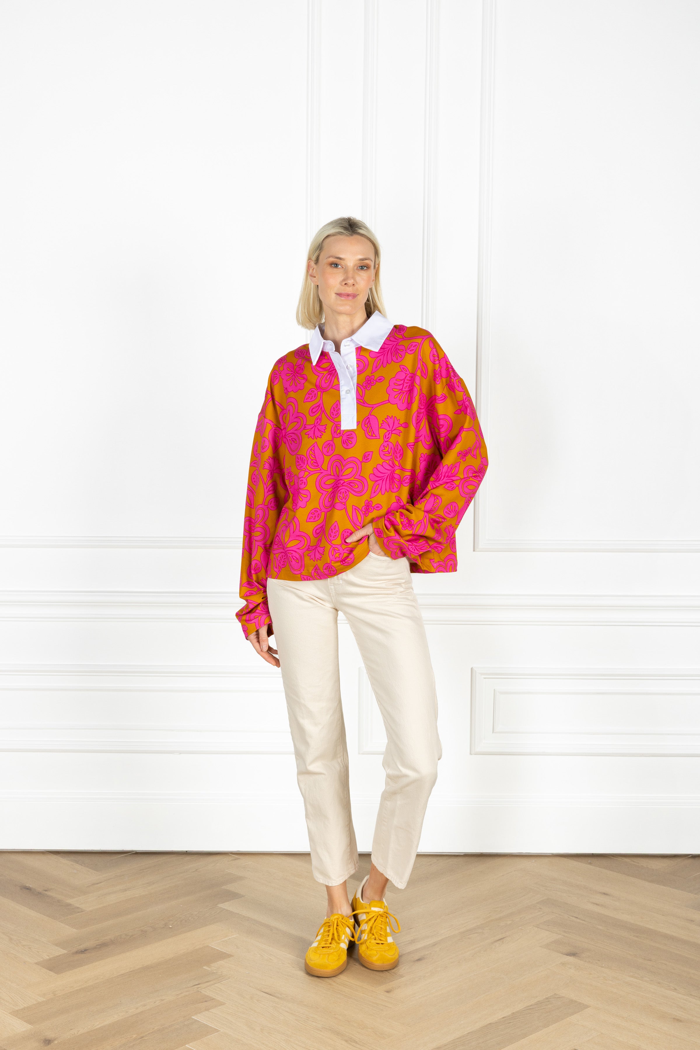 our rugby shirt is slightly cropped and is designed with a classic contrast collar and button placket, balancing sporty edge with everyday ease. ideal for layering or wearing solo, this shirt features a playful, retro-inspired design of stylized florals and sweeping vine motifs in rich pink and persimmon.