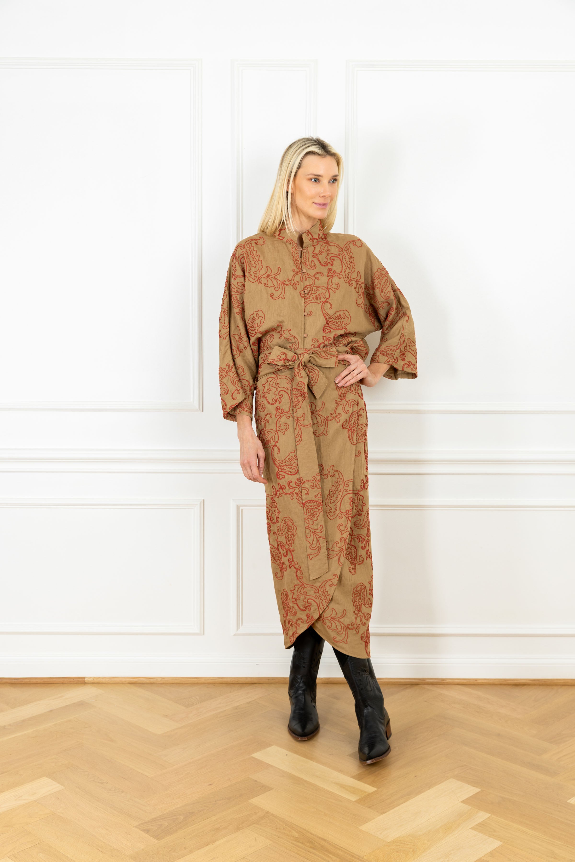 the everyday shirt features a cropped, lightweight flowy fit that can be worn open or fully buttoned, designed for an everyday look. this shirt features a desert tan fabrication in a linen-blend, accented by raised paisley embroidery.