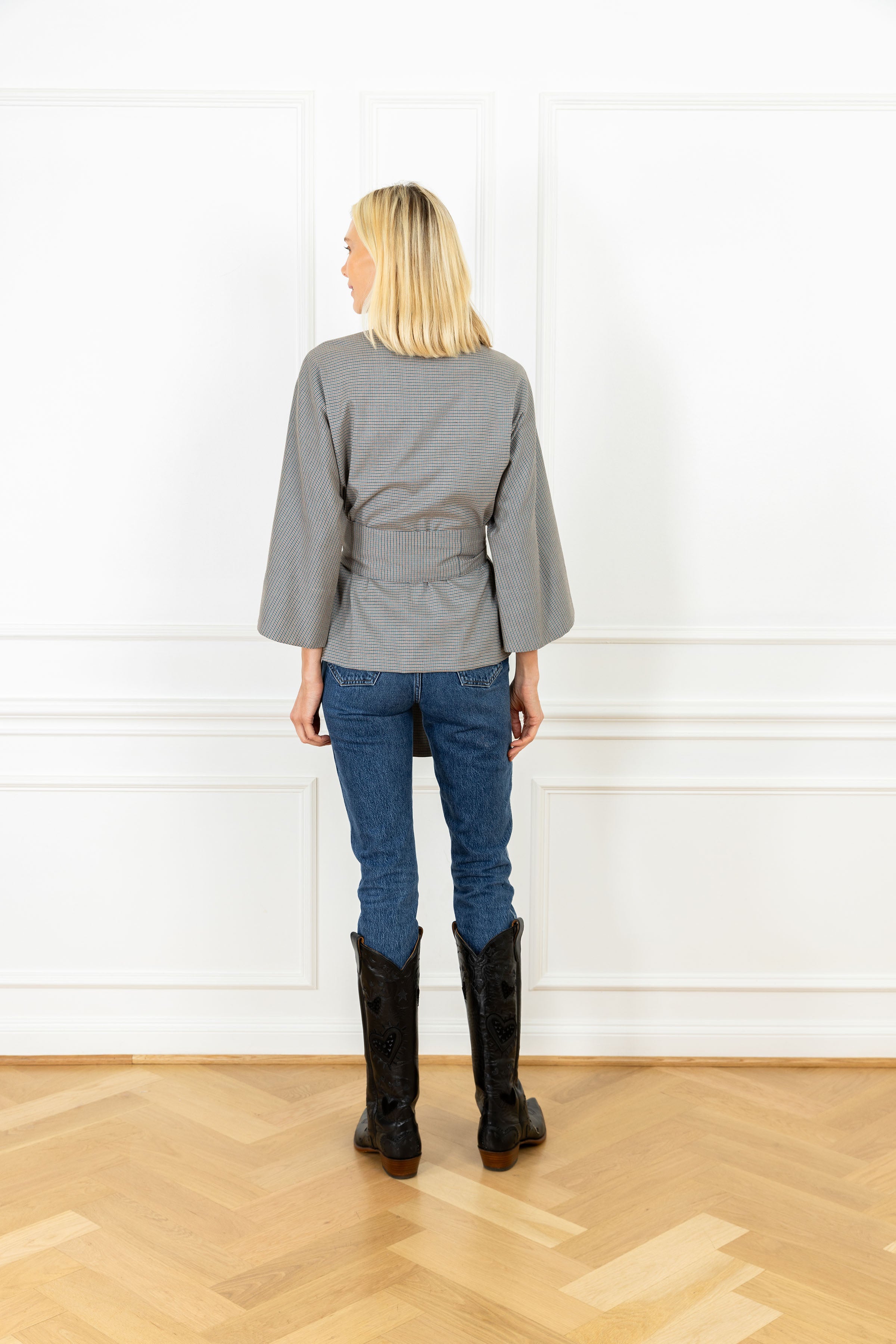 a polished interpretation of our wrap silhouette, the wrap top offers a relaxed, open-front silhouette with a removable tie belt for customizable shaping, finished with softly flared bell sleeves. this wrap top features a micro houndstooth design in a muted color palette, crafted on a finely woven fabrication.