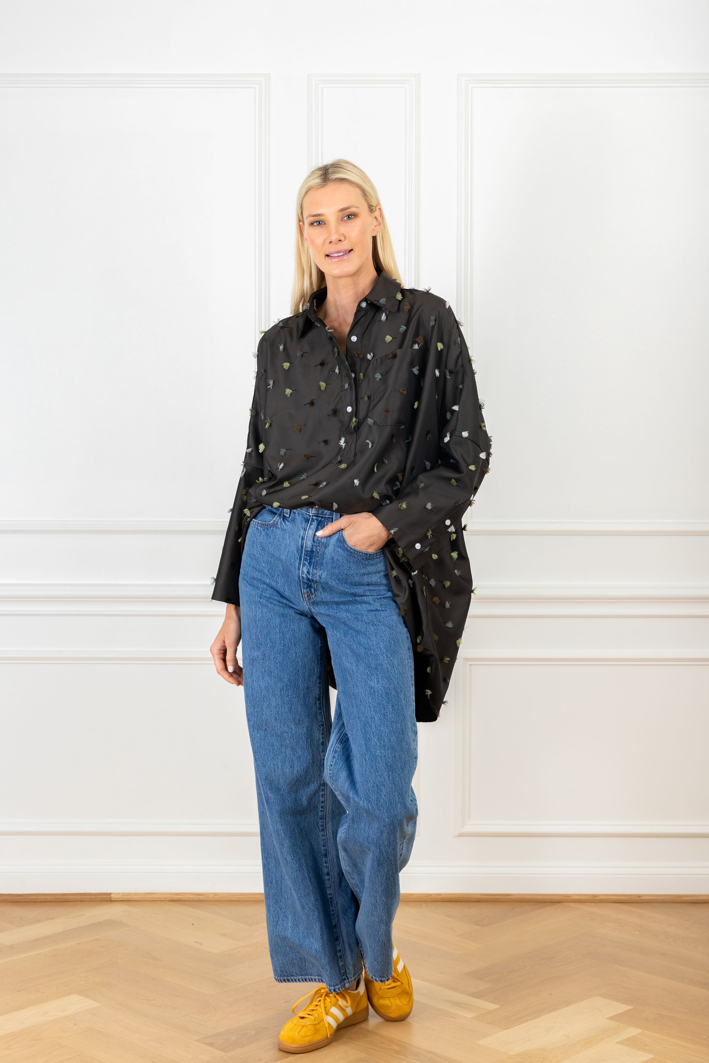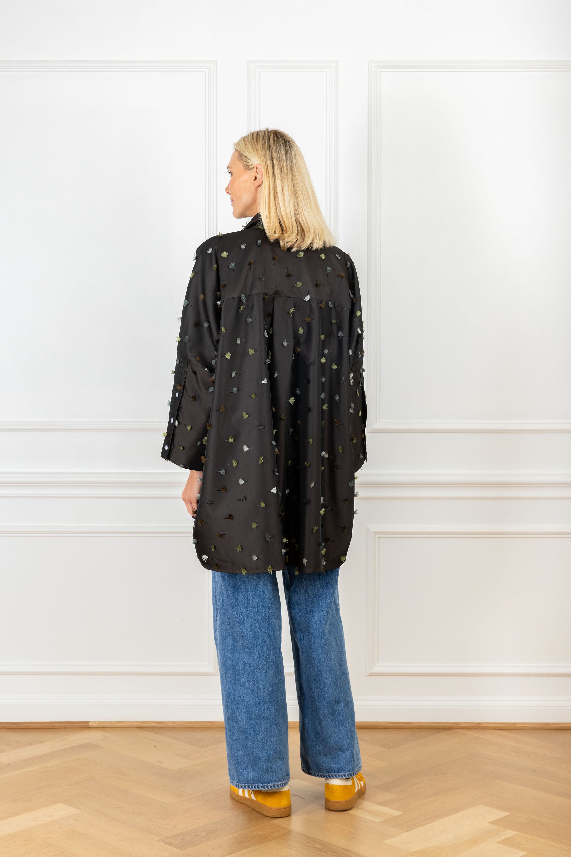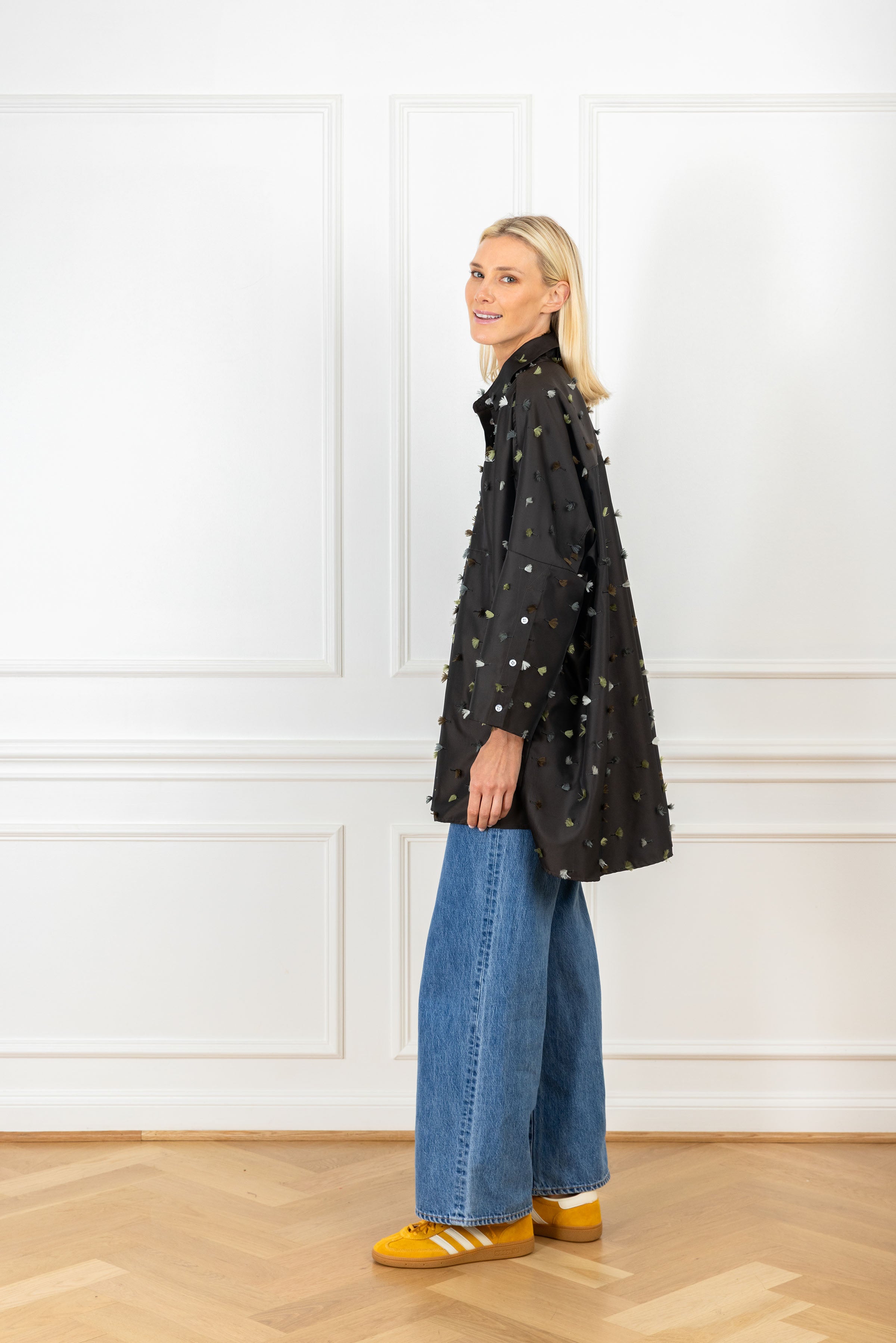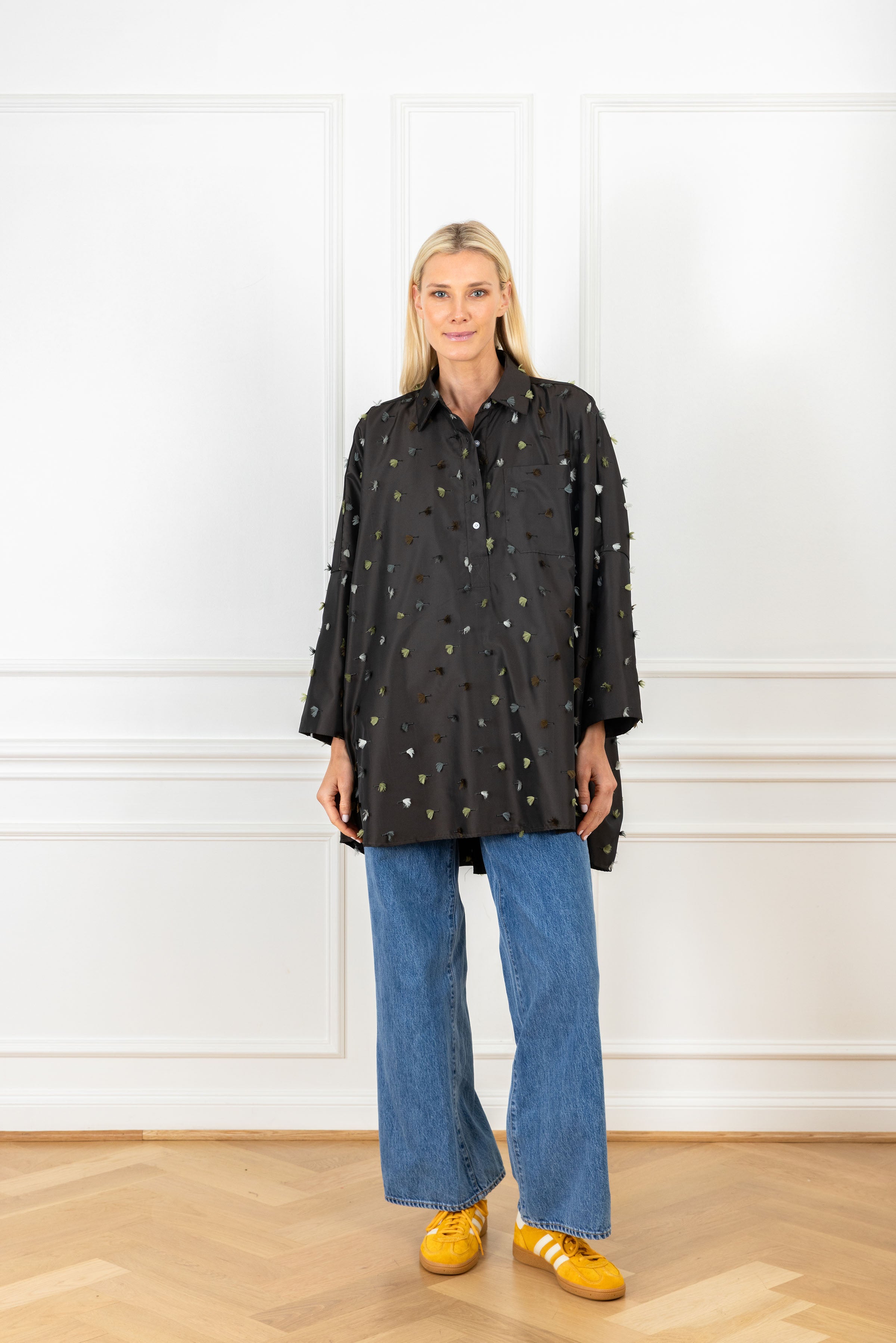 the slouchy fit you know and love, designed for an oversized and elevated look. this shirt features tassel pops in earthy tones, adding movement against the sleek background.